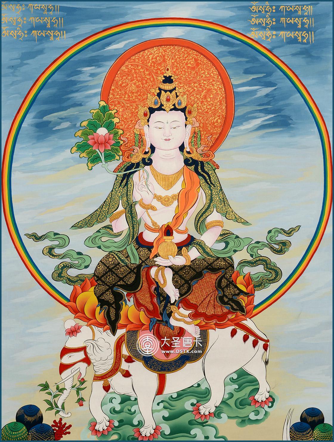 本唐卡中的普賢菩薩坐于百寶輪掌也,一頭兩臂,身色潔白,頭戴寶冠,著大耳環飾、項飾、胸飾、手鐲、腳釧等珠寶八飾,面相豐滿,柳葉細眉,雙目微閉,自然下視,小口緊閉,表情慈祥,造型優美,普賢菩薩是禮德和大行愿的象征,象征真理。他以智導行,以行證智,解行并進,完成求佛者的志愿,所以又稱“大行普賢菩薩”。