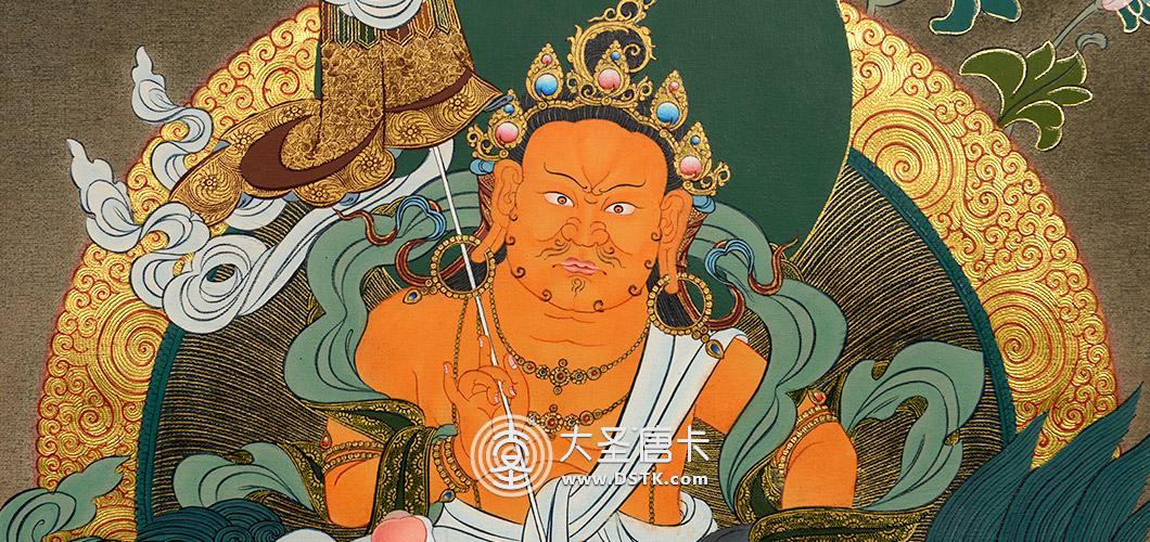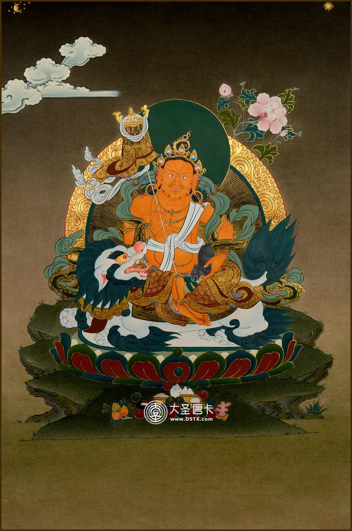 財寶天王是掌管財寶富貴、護持佛法的善神。天王身黃色,如同金子般燦爛輝煌,從他的身上,放射出萬道光芒。頭戴綴滿珠寶的王冠,黃金的盔甲上套著華貴的絲綢天衣,圓睜兩眼,滿鬢胡須,騎一匹咆哮著的綠鬃白獅。他的左手抱著一只吐寶鼬,從鼬的嘴里能吐出取之不盡用之不竭的珍寶,由于其樂善好施,為人間布下無窮財富。