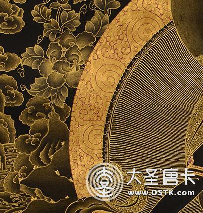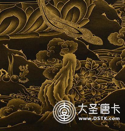 采用涂金、磨金、勾金線、刻金、染金的絕技,將金色分成多種冷暖變化,在黑地上用金線勾畫十幾種不同的層次效果,對比強烈,畫面富麗堂皇。