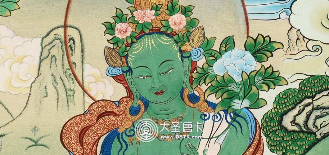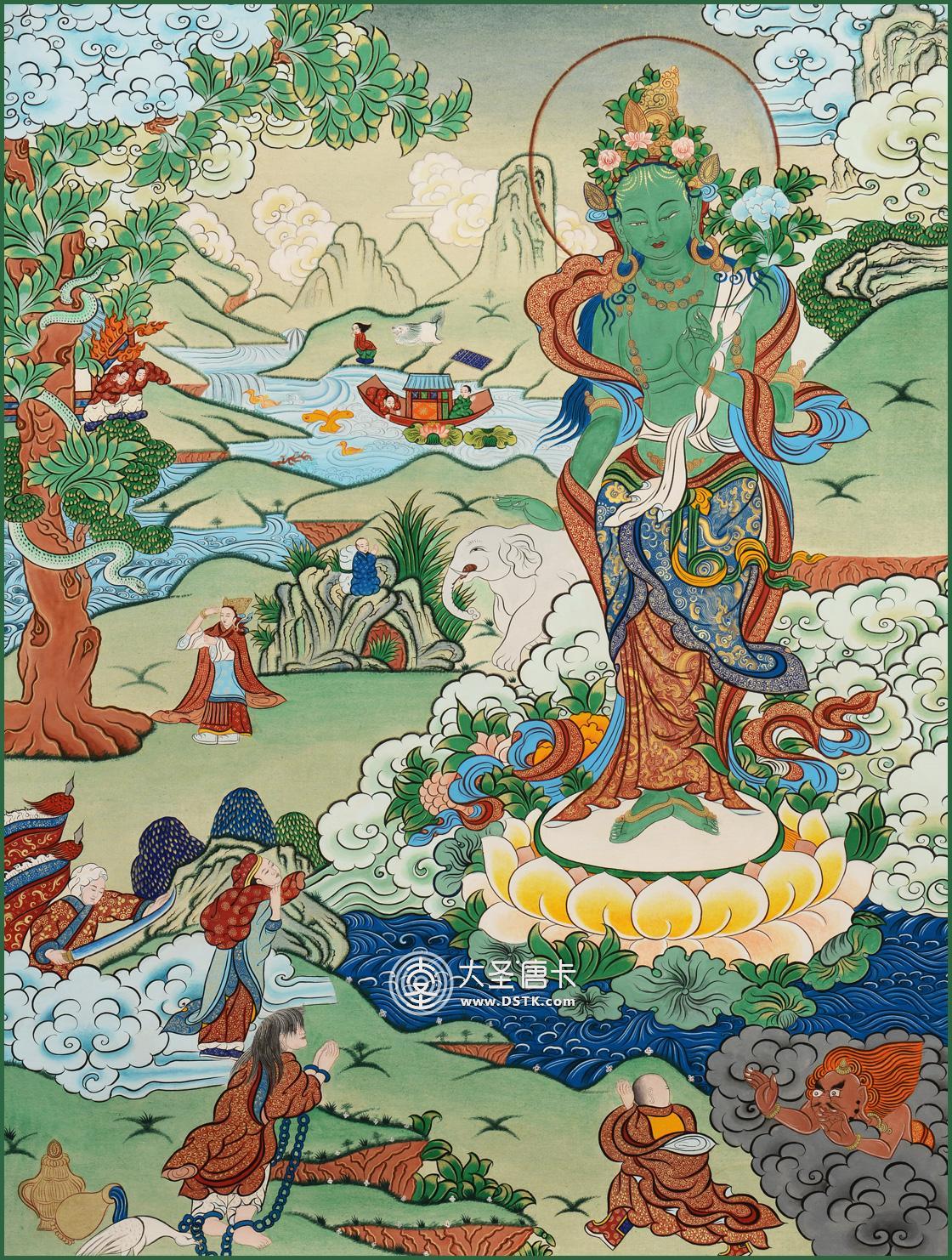 綠度母為觀世音菩薩的化身。度母,梵名Tara,全稱圣救度佛母,綠度母為所有度母之主尊,總攝其余二十尊化身之所有功德。她能救八種苦難,如獅難、象難、蛇難、水難、牢獄難、賊難、非人難,又稱為“救八難度母”。