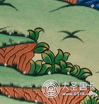 該作品在表現形式及構圖和設色上吸收了漢地工筆畫的畫風,與藏傳繪畫藝術兼容并蓄,在傳統上加進自己對繪畫和佛教的理解來創作,意境遼遠。線條的繪制手法精湛,細致而不纖弱,流暢舒緩。