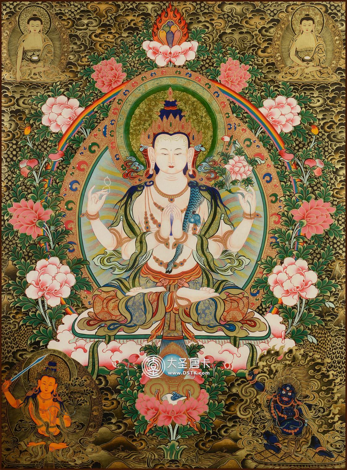 在此幅唐卡中,四臂觀世音菩薩以寂靜相于蓮花臺座結跏趺坐。左右主手當胸結一切王印,手捧摩尼寶珠。右次手捻水晶念珠,表示每撥一珠即為救度一眾生出脫輪回。左次手持蓮花,表示清凈無惱。四臂觀世音一首意為通達法性,四臂意為四無量心,身色潔白表示潔白無瑕,不被煩惱困擾。四臂觀世音菩薩雙眼注視著世間蒼生,表示被注視者可得到解脫。