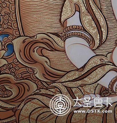 在繪制佛像服飾等位置時,用刻金技法,使圖案更具豐富的層次和立體感,用金勾勒的線條和圖案不但明亮度進一步提高,讓畫面更加燦爛,而且也使金在畫面上保持得更加長久。