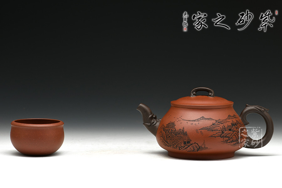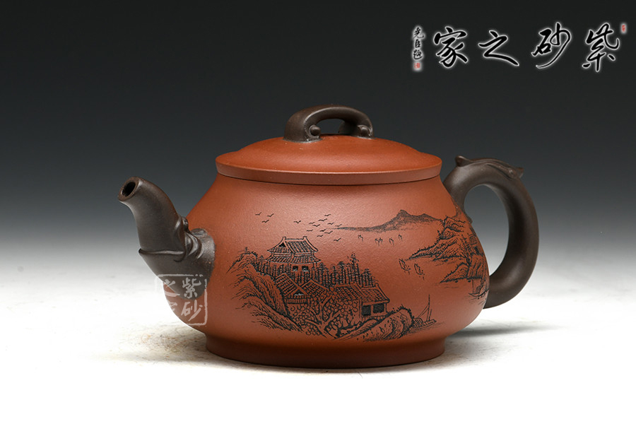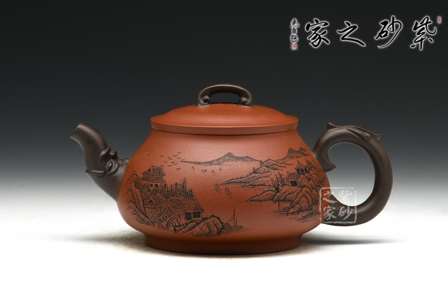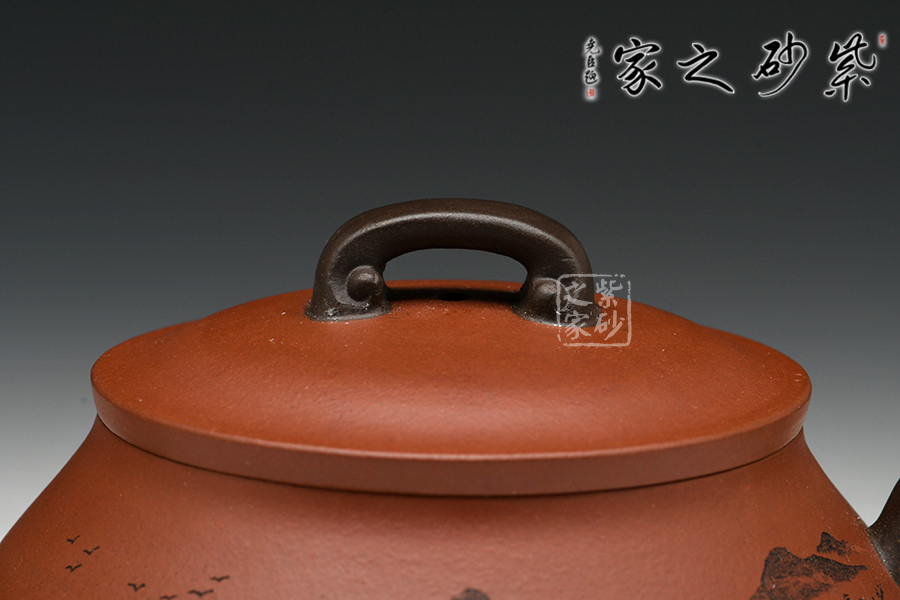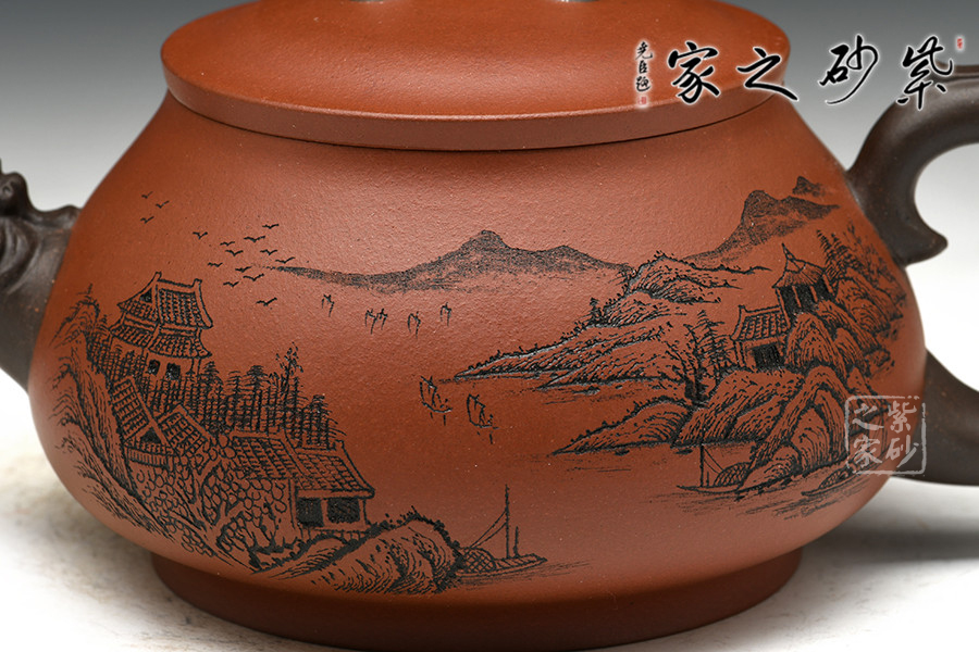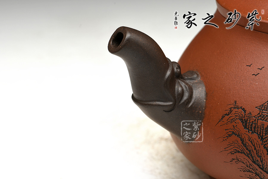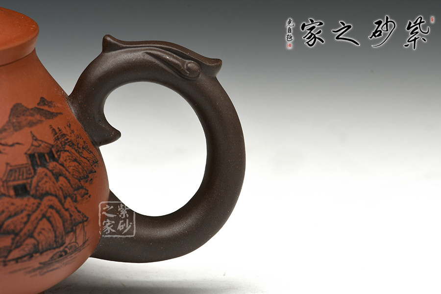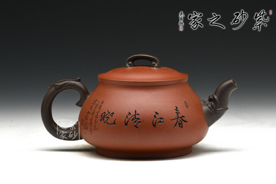 新生代優(yōu)秀陶藝家朱萍萍手制,師從其父、研高朱建偉,擅長(zhǎng)多種裝飾工藝。該作以拼紫為料,獨(dú)家的配比,呈現(xiàn)出別樣的泥色效果。借用經(jīng)典器型潘壺為基礎(chǔ),注入作者的自創(chuàng)元素,由兩種不同泥料純手工制作,且因泥料不同,收縮比和燒窯溫度的差異讓這款壺的難度倍增,壺把與壺嘴的龍紋造型設(shè)計(jì)相互呼應(yīng),完美結(jié)合,讓作品整體有了大氣,穩(wěn)重的感覺(jué)。壺身由父親省大師研究員級(jí)高級(jí)工藝師朱建偉陶刻,讓作品兼具實(shí)用與收藏價(jià)值。