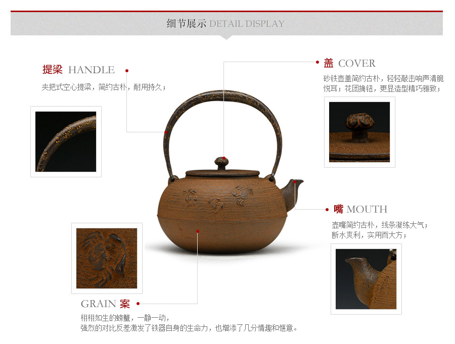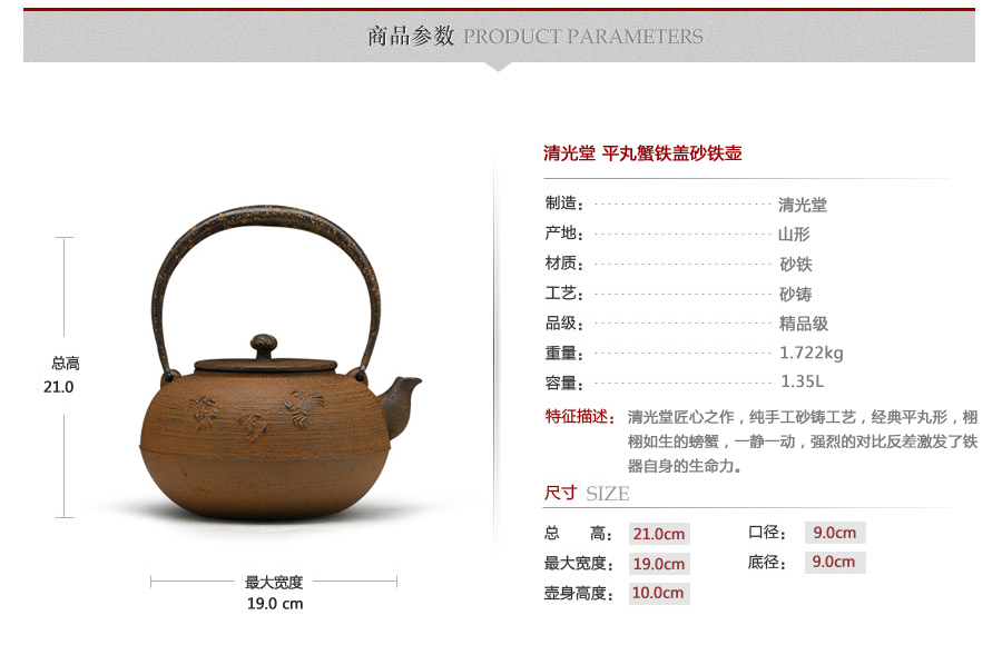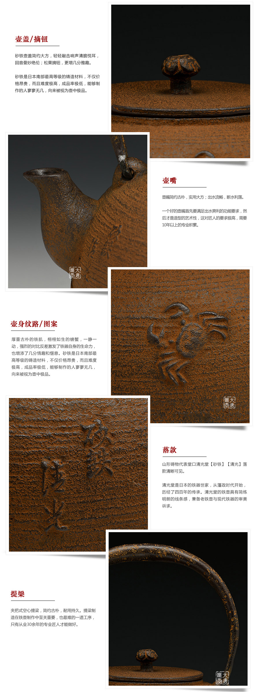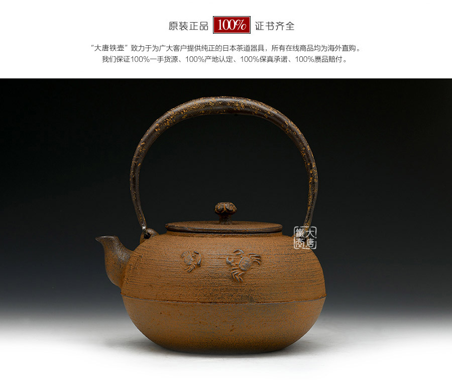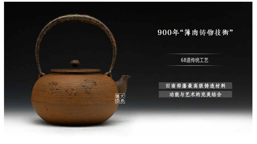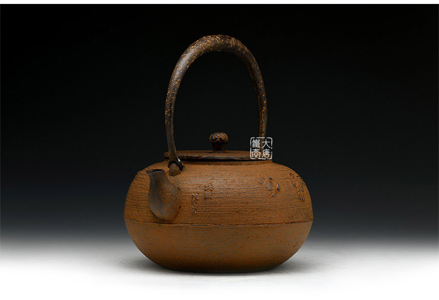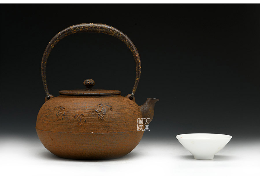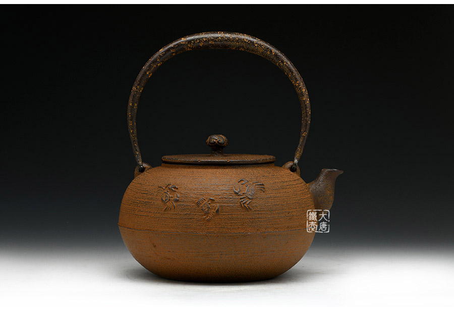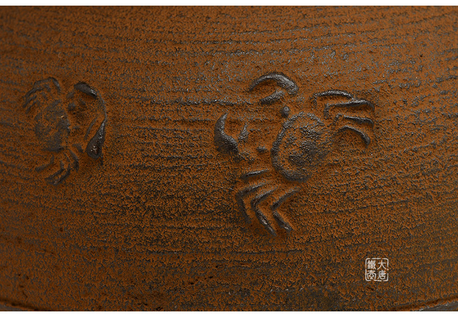 清光堂匠心之作,純手工砂鑄工藝,經(jīng)典平丸形,栩栩如生的螃蟹,一靜一動(dòng),強(qiáng)烈的對(duì)比反差激發(fā)了鐵器自身的生命力。