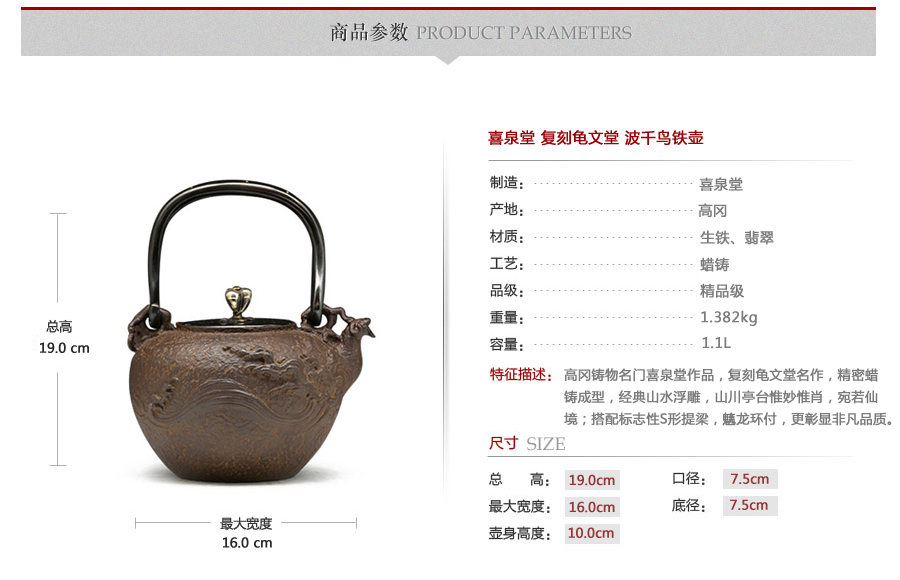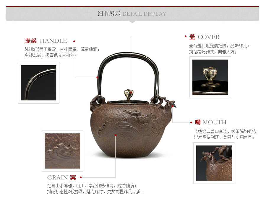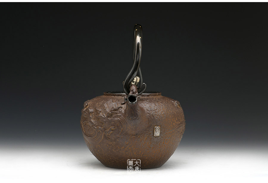 高岡鑄物名門喜泉堂作品,復(fù)刻龜文堂名作,精密蠟鑄成型,經(jīng)典山水浮雕,山川、亭臺(tái)惟妙惟肖,標(biāo)志性s形提梁,彰顯非凡品質(zhì)