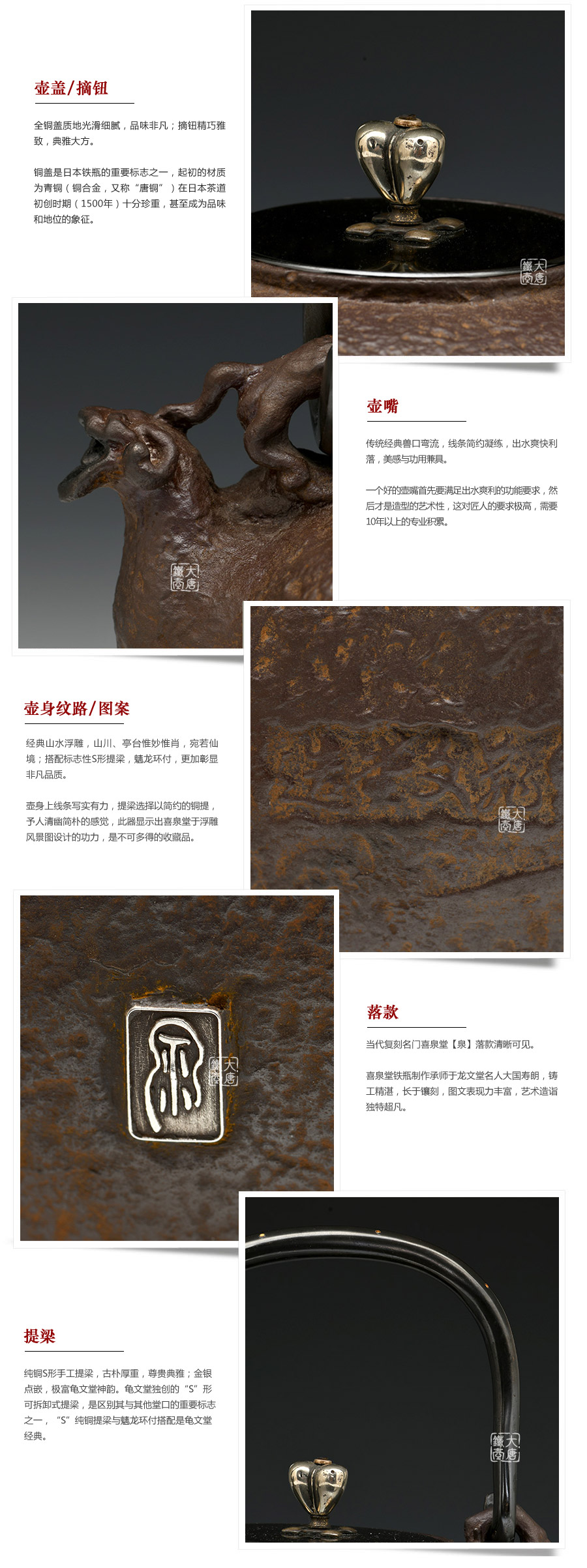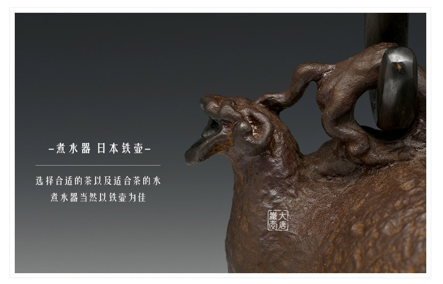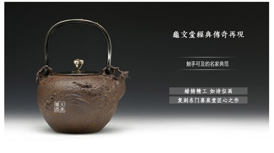 喜泉屋坐落于擁有400年鑄物歷史的富山縣高岡市, 是伴隨著一代代高岡鑄物師的自豪和榮耀流傳至今的百年堂號(hào)。幾百年來,喜泉堂繼承了金屋町匠人世代沿襲的古法技藝和審美意識(shí),不斷追求極致完美,以匠人之心巧妙融入現(xiàn)代生活元素,不斷創(chuàng)作著具有天工之美的茶道藝術(shù)和工藝品。喜泉堂鐵瓶制作承師于龍文堂名人大國壽朗,鑄工精湛,長于鑲刻,圖文表現(xiàn)力豐富,藝術(shù)造詣獨(dú)特超凡。