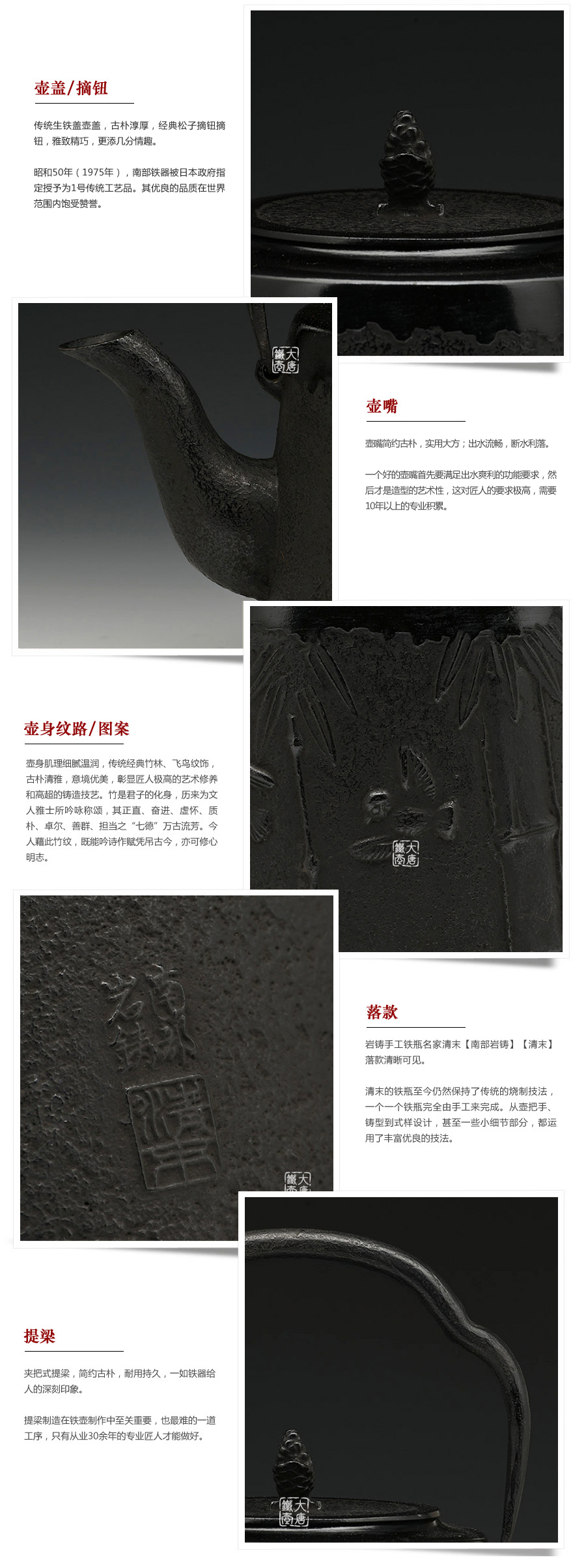 巖鑄鐵壺名家清末作品,歷經(jīng)68道傳統(tǒng)工藝,壺身肌理細(xì)膩溫潤,傳統(tǒng)經(jīng)典竹林、飛鳥紋飾,古樸清雅,意境優(yōu)美。
