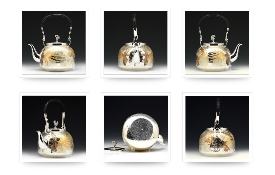 大淵銀器的作品以祥瑞擺件,餐具,佛具,金屬畫為多,主要題材有金龍,金雞,貓頭鷹,七福神,梅蘭松竹,鴛鴦,神龜,仙鶴,布袋和尚,天皇,金太郎等等。輝煌華麗,精工細(xì)作,展示了純手工超越時(shí)代的閃耀風(fēng)格。