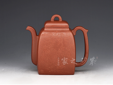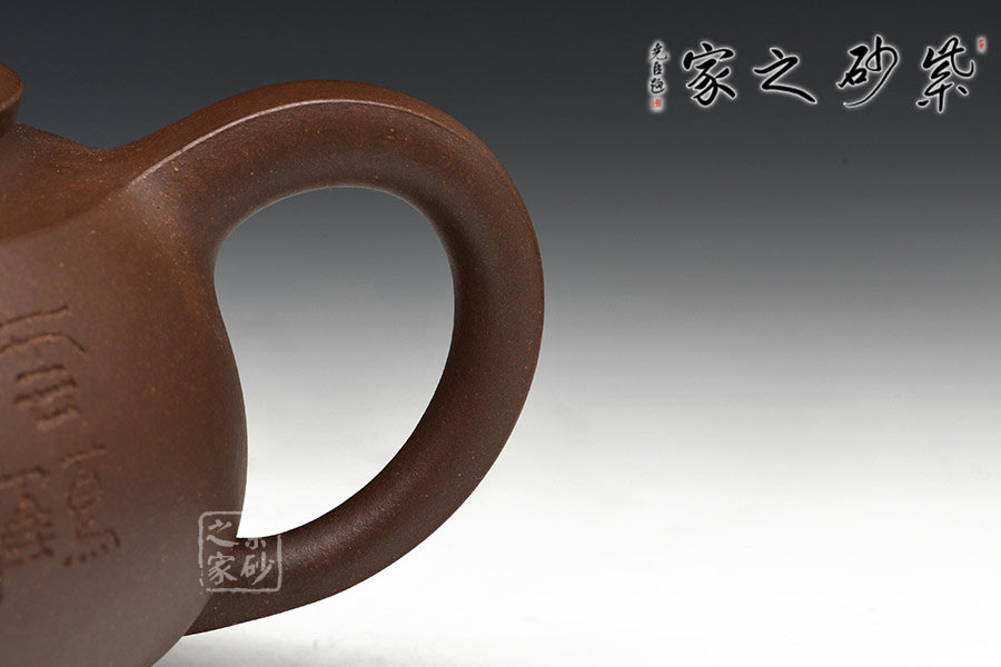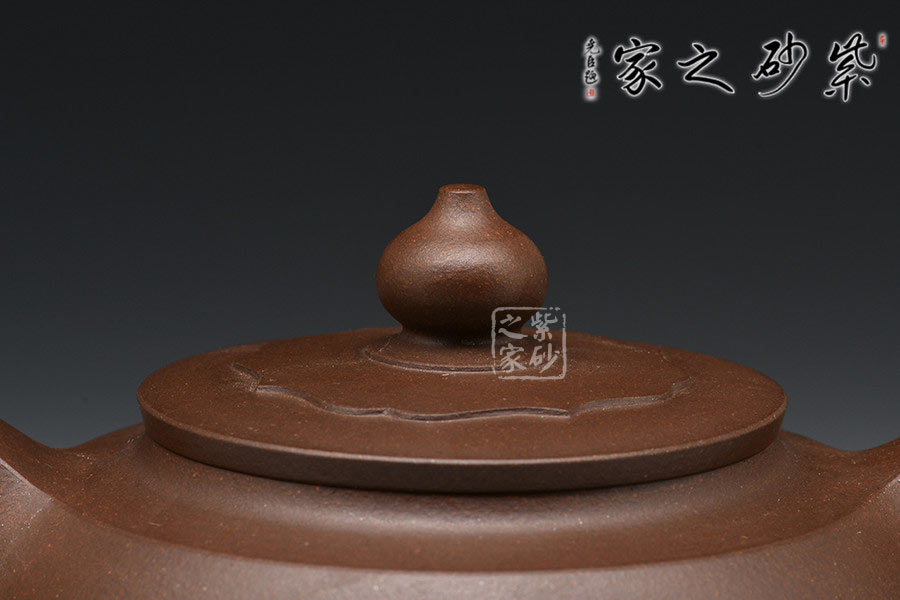 以存世量較少的拼紫泥為料,泥質(zhì)質(zhì)樸,又不失典雅大氣。該壺壺身扁圓,渾厚飽滿,中腹豐滿聚內(nèi)力。彎流壺嘴,精巧胥出,呈方形設(shè)計(jì),出水流暢爽利。四方耳形端把,銜接精湛,線條流轉(zhuǎn),端握舒適稱手。壺蓋之上圍繞壺鈕一圈飾以菱花花瓣,貼塑精巧。溫潤的泥質(zhì)給古韻深沉的此壺增添一股優(yōu)雅之氣。整器造型古樸,古韻盎然,簡潔的器型彰顯紫砂特有魅力。