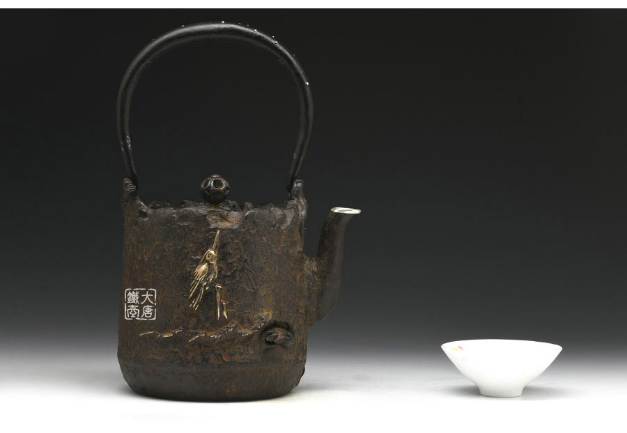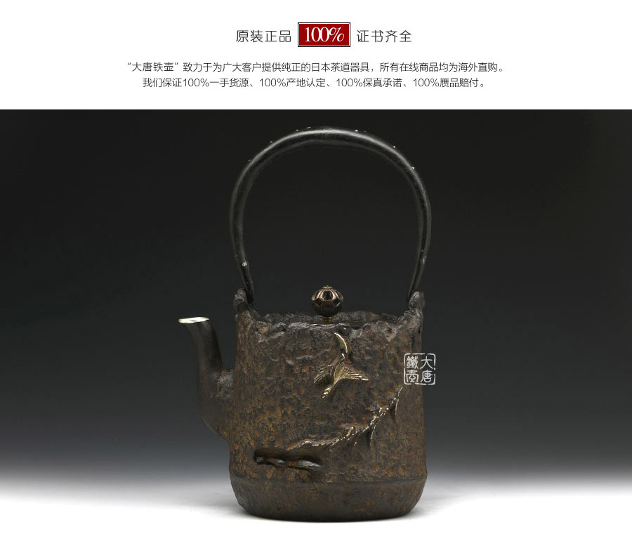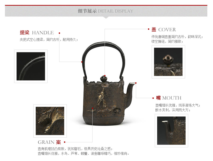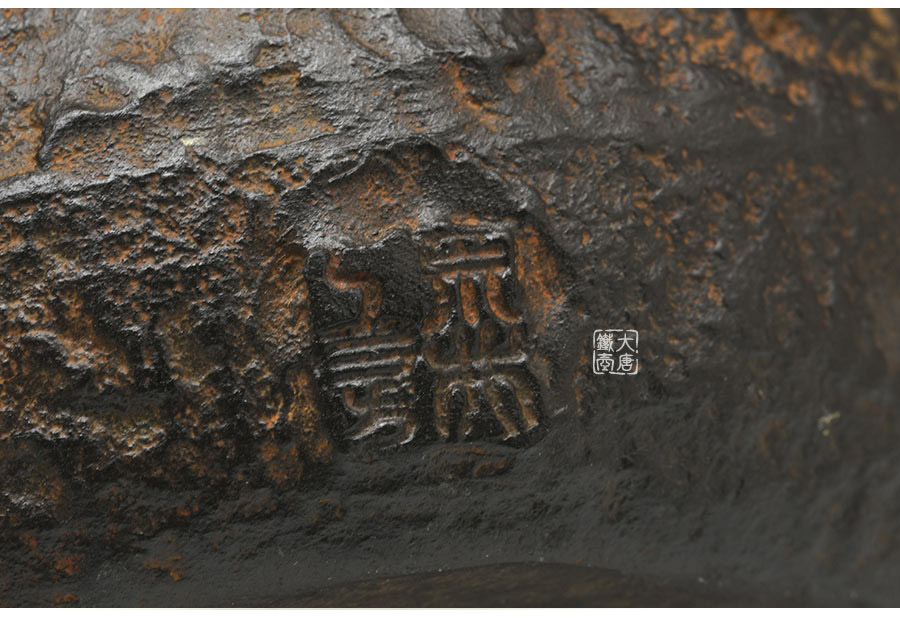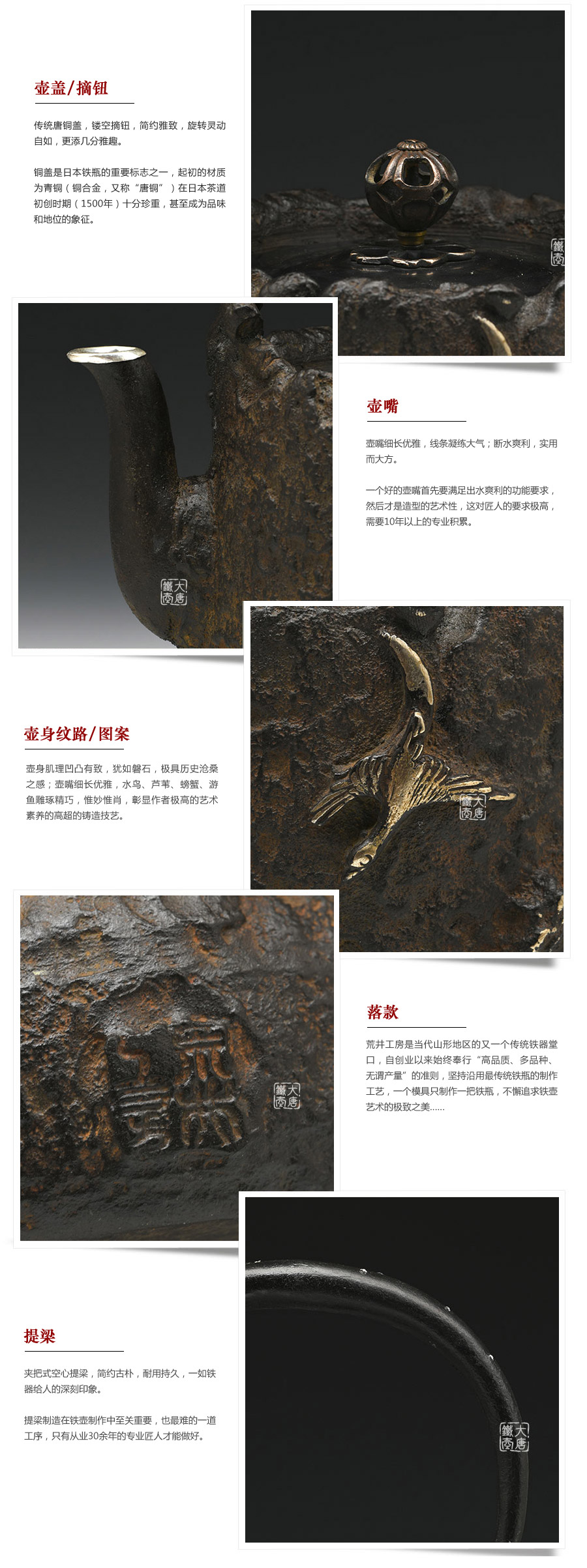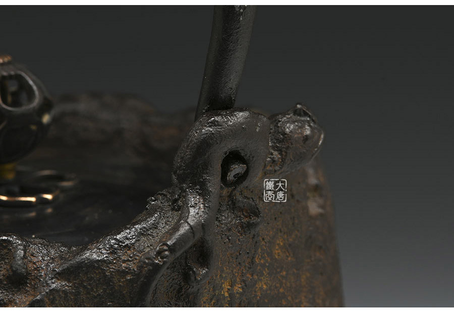 山形鑄物傳統(tǒng)鑄造工藝,一模一具,純手工蠟鑄成型。壺身肌理凹凸有致,猶如磐石,極具歷史滄桑之感;壺嘴細(xì)長優(yōu)雅,水鳥、蘆葦、螃蟹、游魚雕琢精巧,惟妙惟肖,彰顯作者極高的藝術(shù)素養(yǎng)的高超的鑄造技藝。