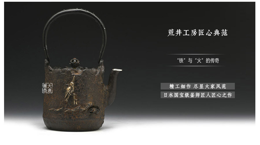 為了追求更為精致的紋理和細(xì)節(jié),當(dāng)代堂主荒井干雄孜孜不倦的將全部精力投入鐵瓶的創(chuàng)作之中,每一作品都經(jīng)由精心醞釀,純手工精心制作,不僅將荒井一家的祖?zhèn)骷妓嚢l(fā)揚(yáng)光大,同時也在鐵瓶界闖出了自己的名聲,成為當(dāng)代的釜師名家。