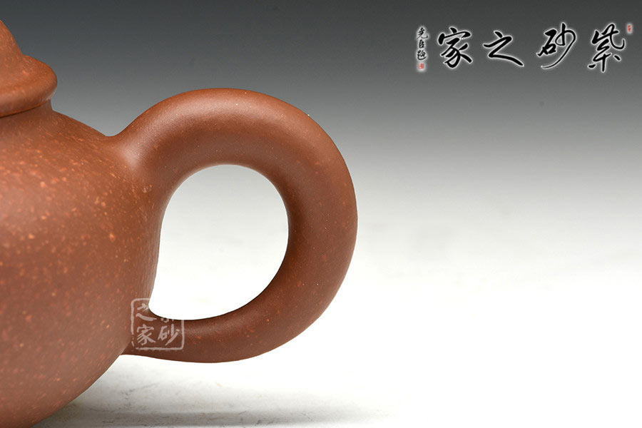 此尊蔣小彥老師的沁怡壺,壺式端莊古樸,于靜默中蘊(yùn)涵動感。壺蓋與壺身銜接緊密,渾然一體;三彎壺流線條流暢,整體動勢有向上挺拔之力感。壺把粗大呈圓形,從上之下粗細(xì)漸變,不僅有線條的流暢之美,又富于動感,手感舒適。整壺端正圓渾、協(xié)調(diào)得體、穩(wěn)重大方,線條于變化中彈性十足。此壺通體無其他刻畫裝飾,以裸胎之美,玉潤內(nèi)斂之材質(zhì)彰顯紫砂之美。