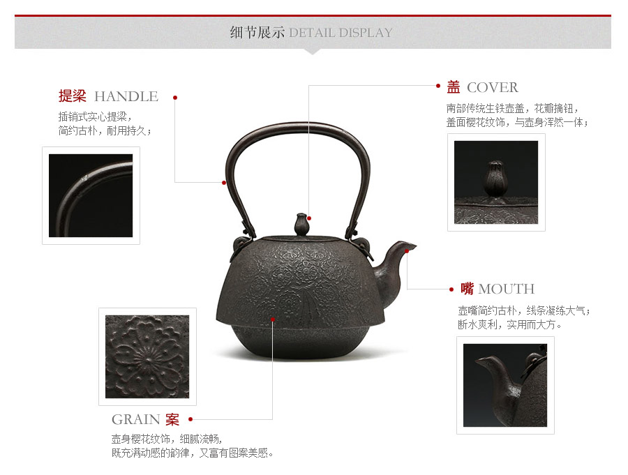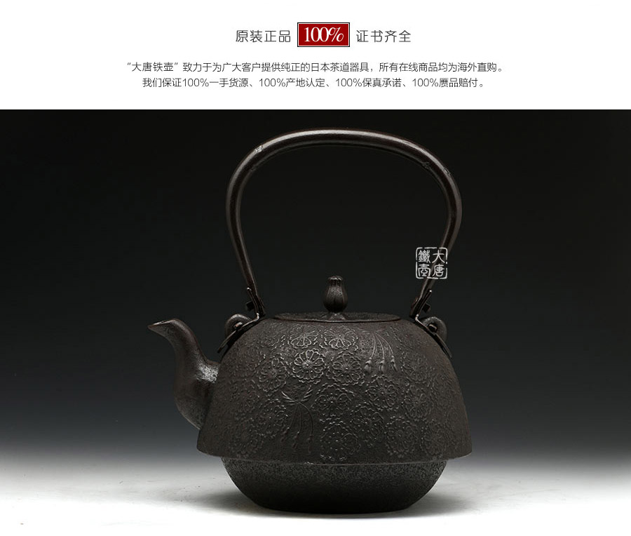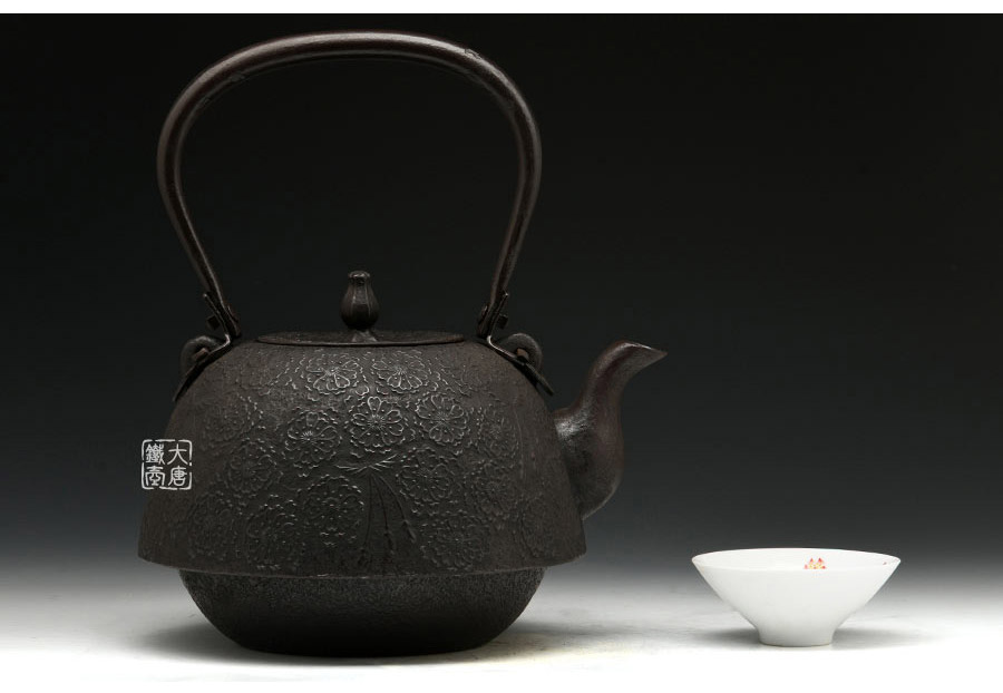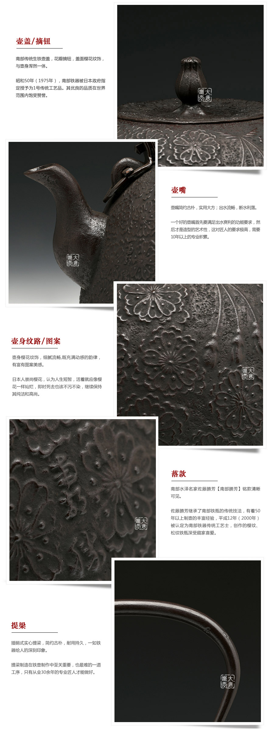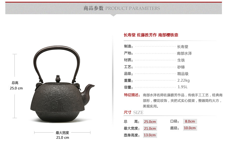 南部水澤名師佐藤勝芳作品,傳統(tǒng)手工工藝,經(jīng)典南部形,櫻花紋飾,插銷式實(shí)心提梁,整器簡約大方,美觀實(shí)用。