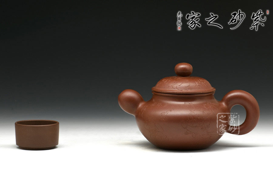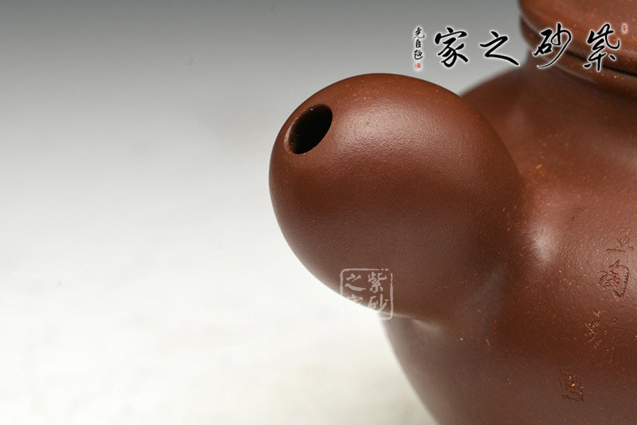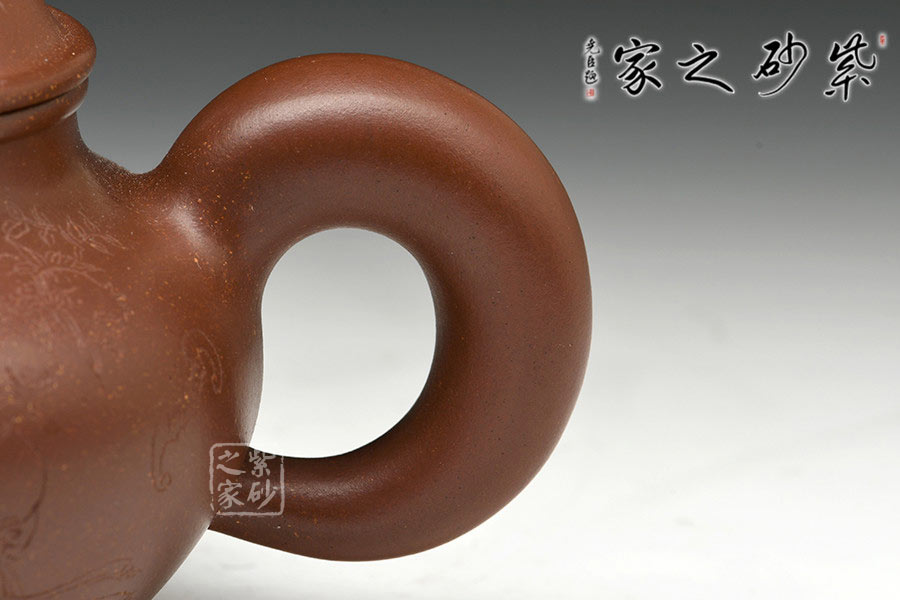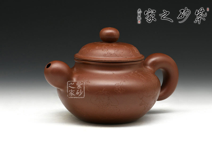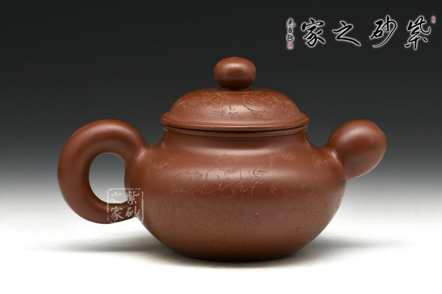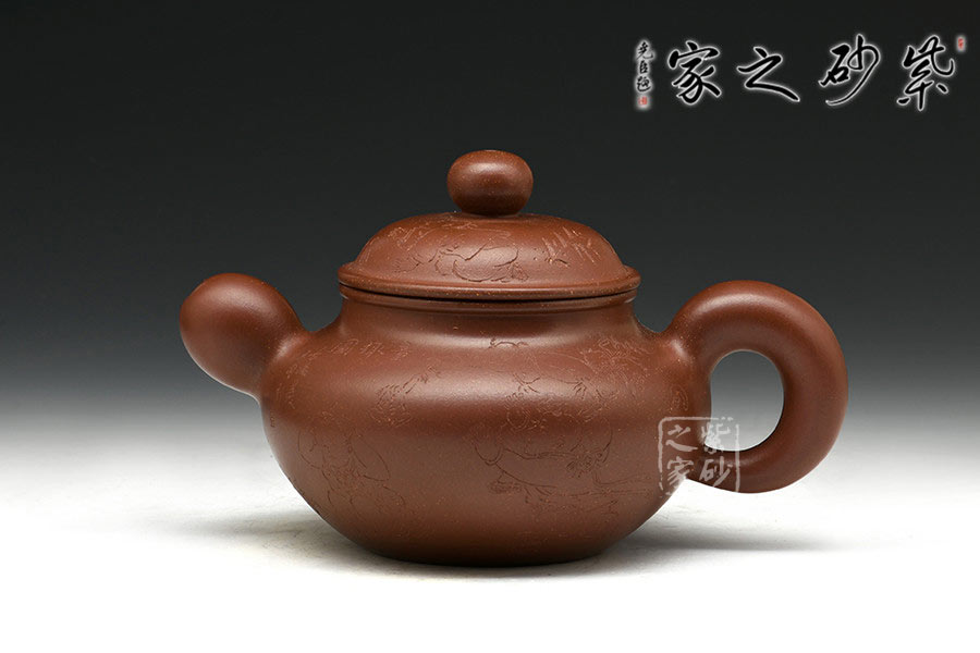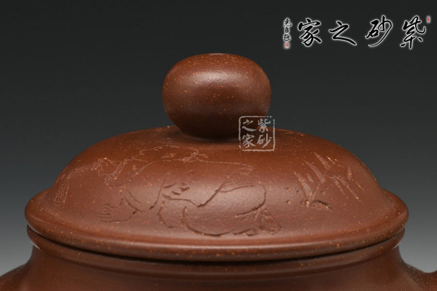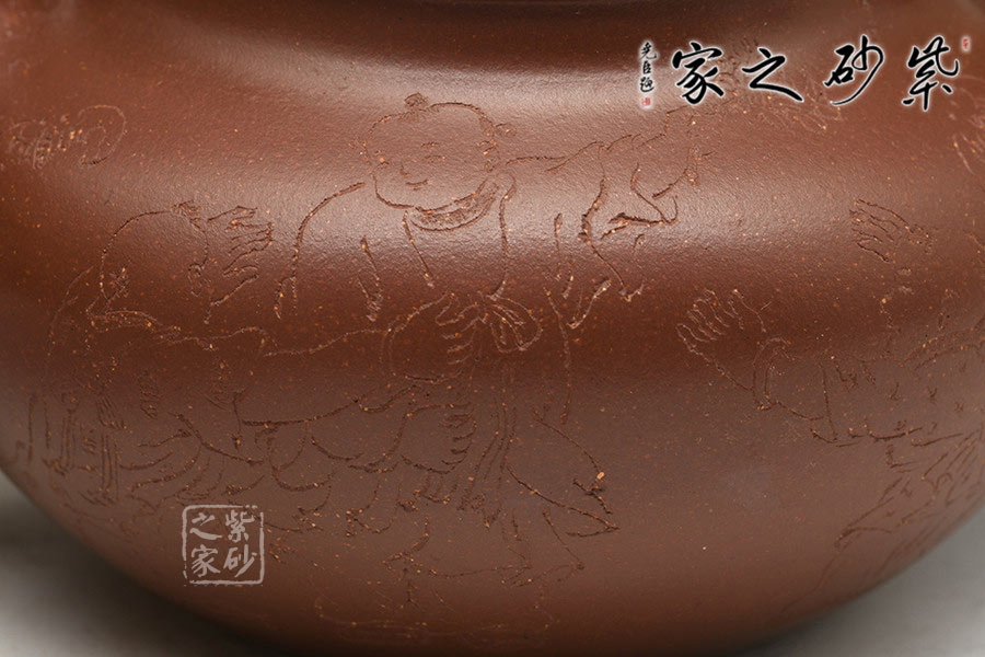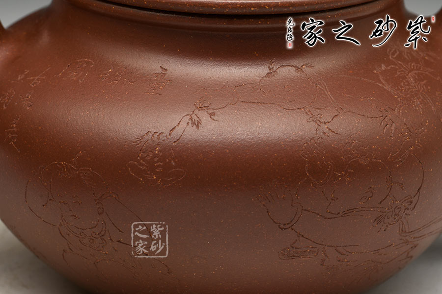 制壺陶刻雙杰藝師莊青,擅長大品壺制作,作品自制自銘,人物工筆畫功底深厚,是宜興新一代知名陶藝家。以高端泥料龍血砂制作,總量極少,宜興人認(rèn)為這是龍的血脈,寓意旺財(cái)降富。壺型源于紫砂傳統(tǒng)之形,器品瑩潤如玉,造型古樸端莊,氣度不凡,充分展示了作者精妙絕倫的制壺技藝。壺身豐厚飽滿,以夸張的手法設(shè)計(jì)壺嘴、把及壺鈕,顯得格外憨厚可愛,增添趣味性的同時(shí)又不失實(shí)用性。壺身素刻百子圖,寓意多子多福的美好幸福生活。