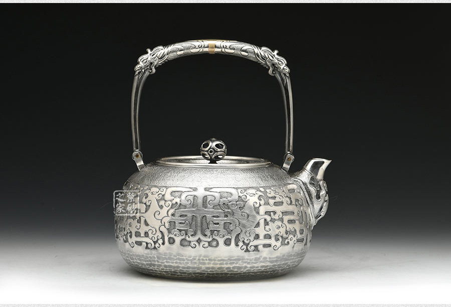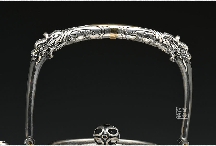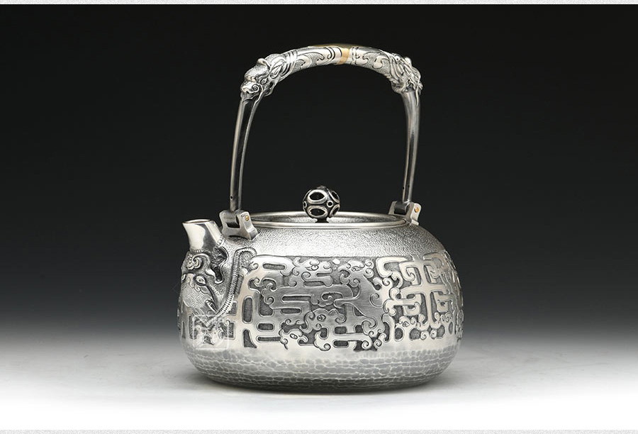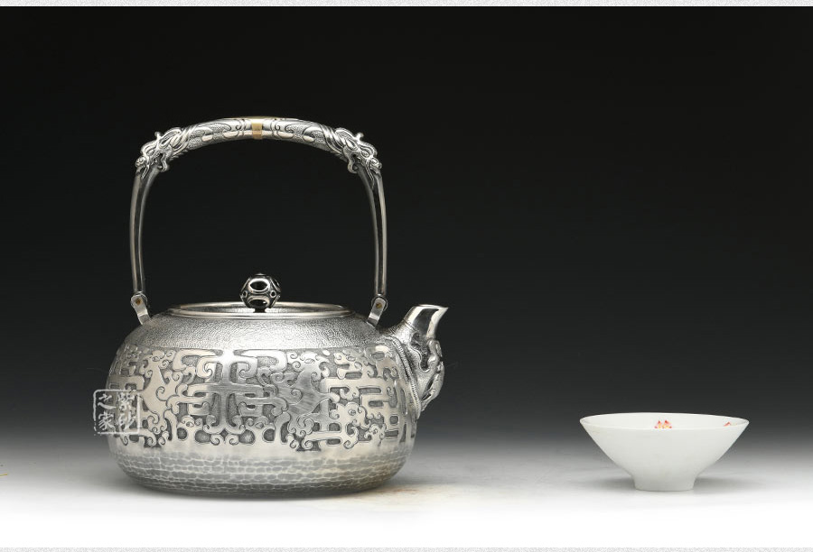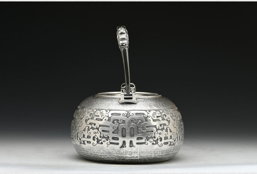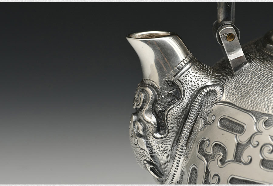 中國頂級銀壺大師段六一匠心手作,S999超高純度銀料,壺身古龍紋純手工鏨刻,罕見高難度二彎“口打出”壺嘴,獸口修飾,整器端莊威嚴,霸氣雄壯,搭配雙龍鑲銅提梁,更顯富貴大氣,實為難得之收藏佳品。