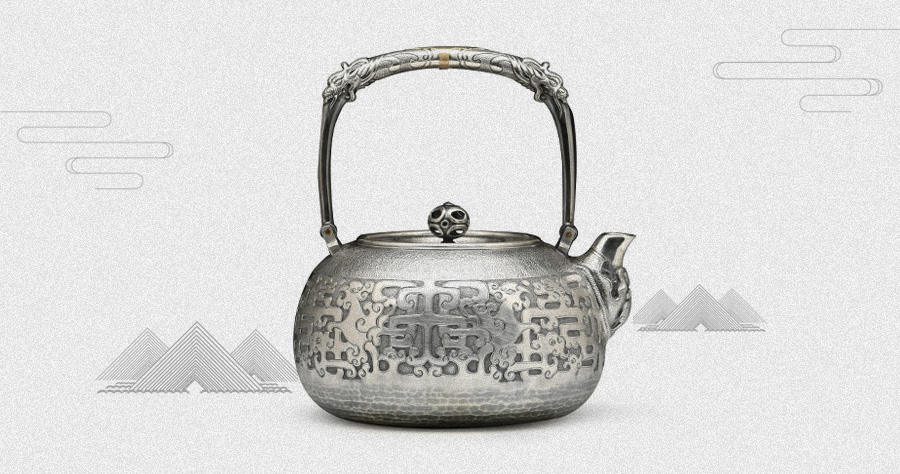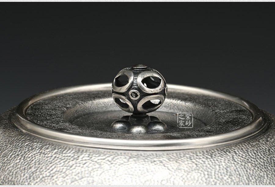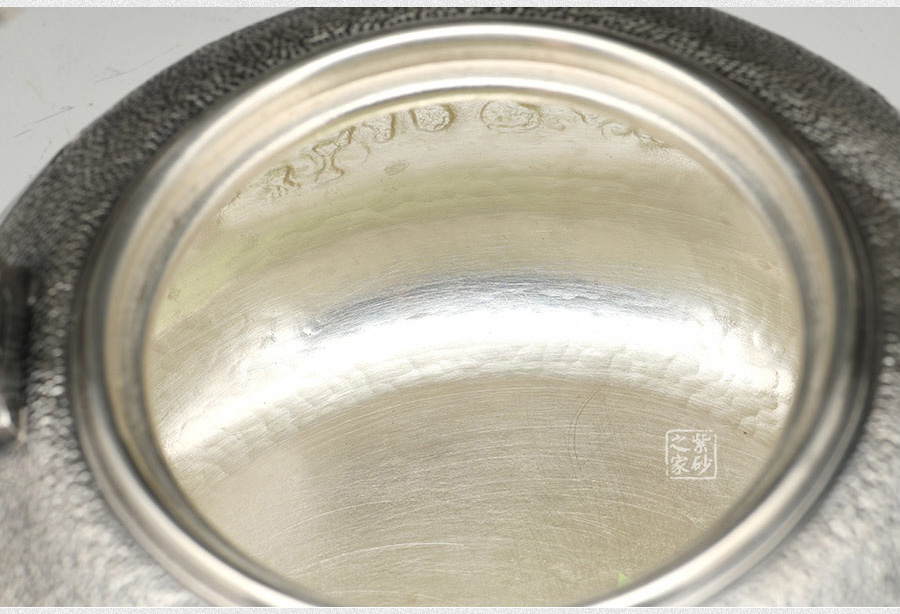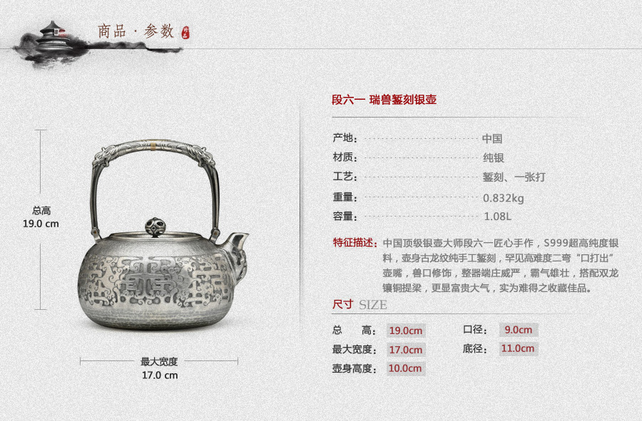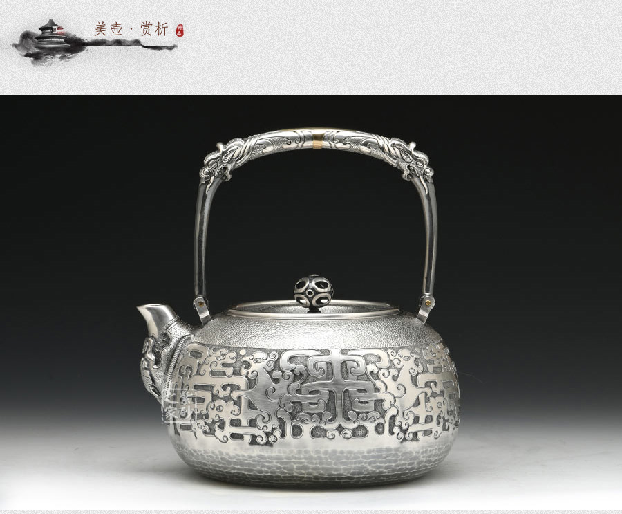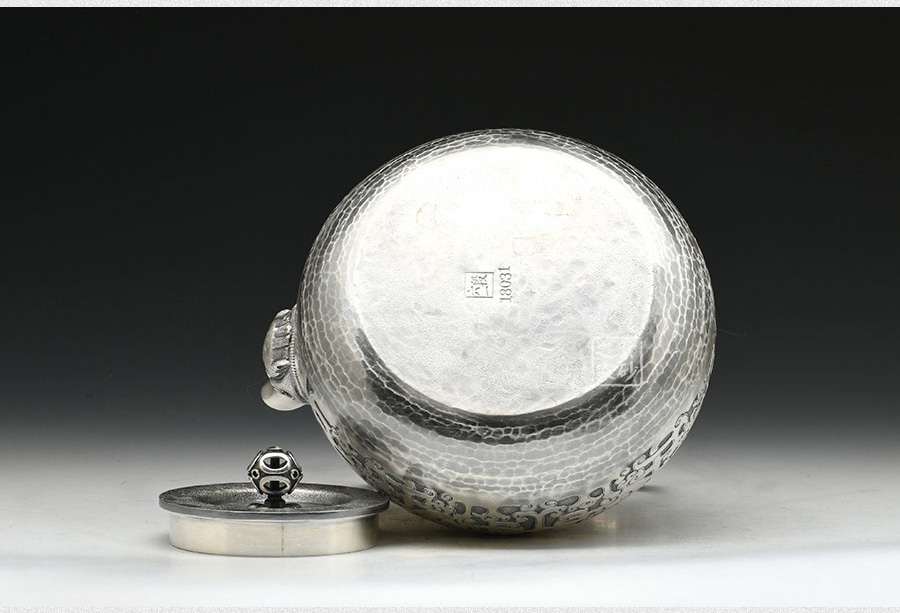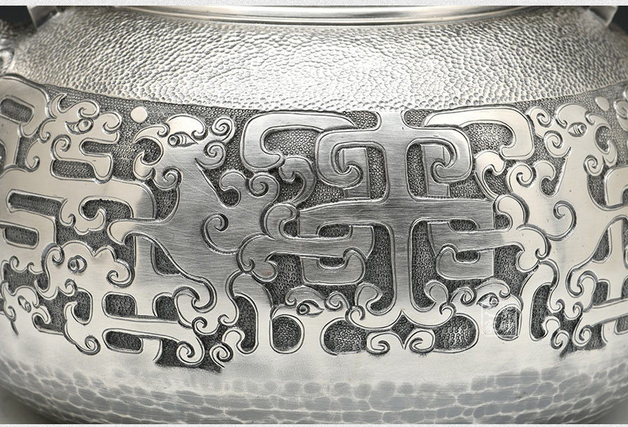 中國頂級銀壺大師段六一匠心手作,S999超高純度銀料,壺身古龍紋純手工鏨刻,罕見高難度二彎“口打出”壺嘴,獸口修飾,整器端莊威嚴,霸氣雄壯,搭配雙龍鑲銅提梁,更顯富貴大氣,實為難得之收藏佳品。