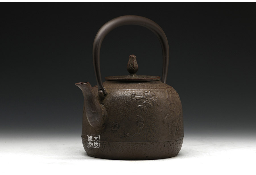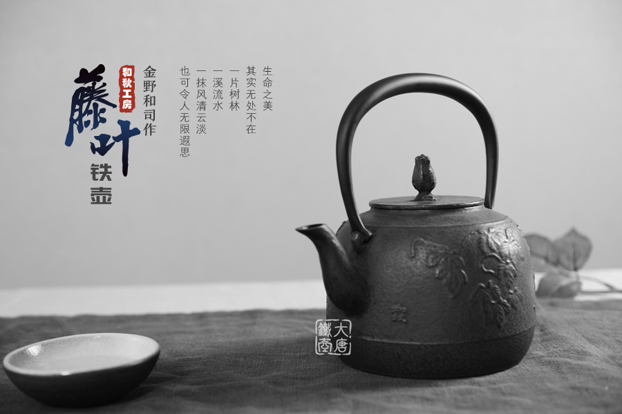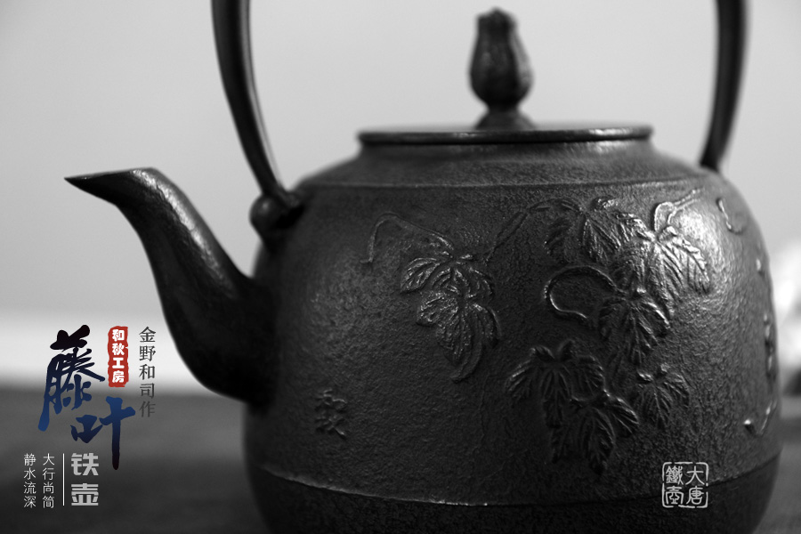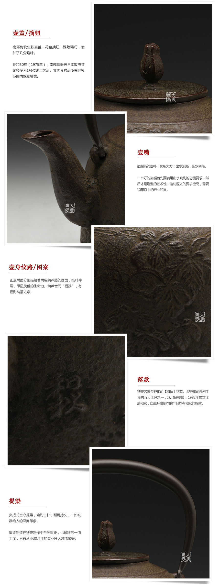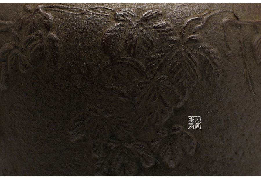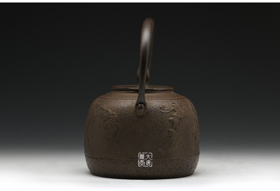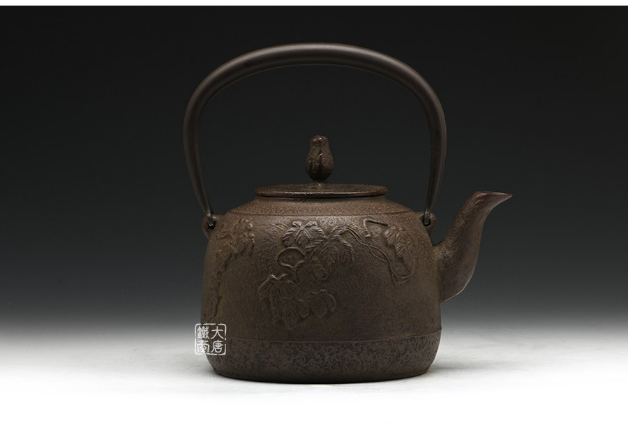 鐵壺名家金野和司匠心之作,壺身正反兩面分別描繪著兩幅葫蘆藤的畫面,枝葉伸展,盡顯茂盛的生命力。葫蘆音同“福祿”,有招財納福之意。