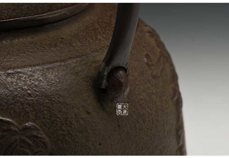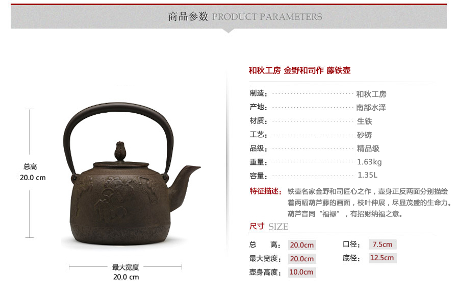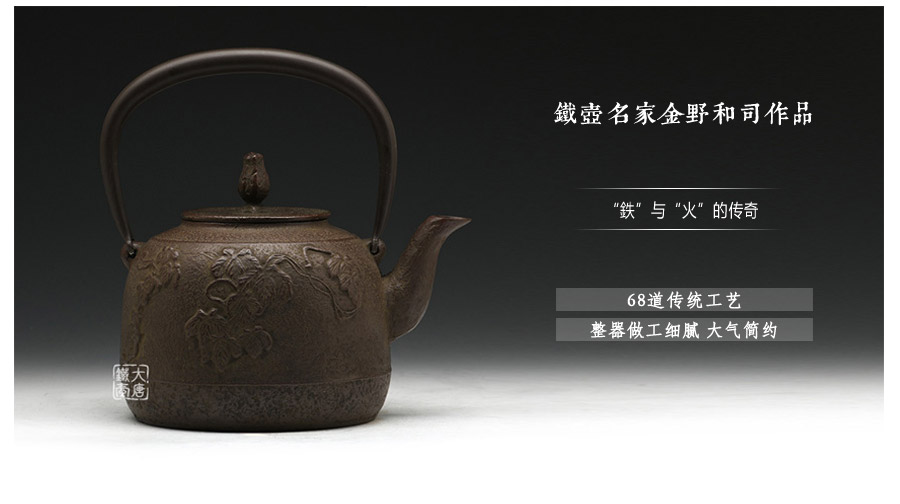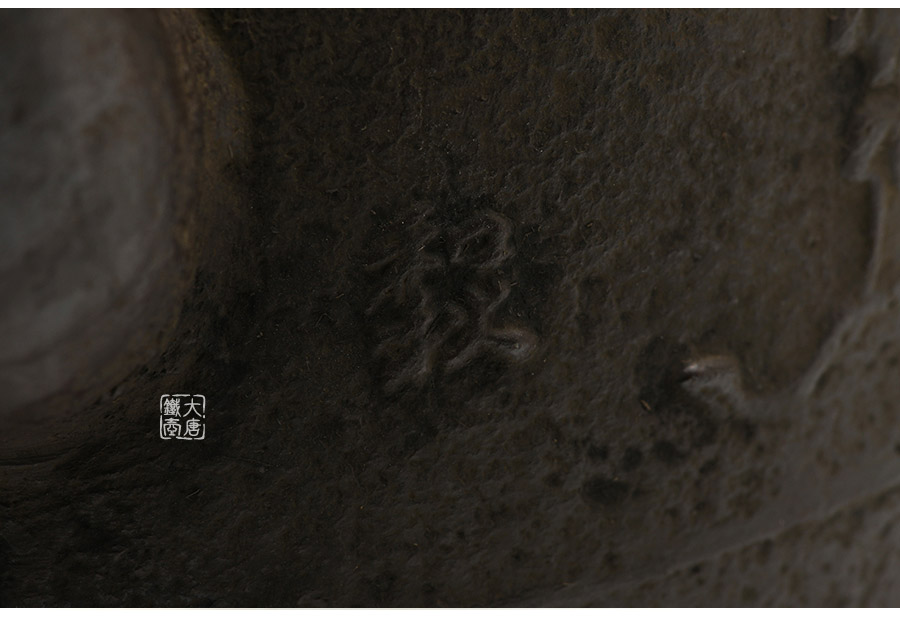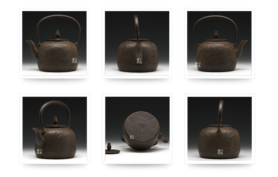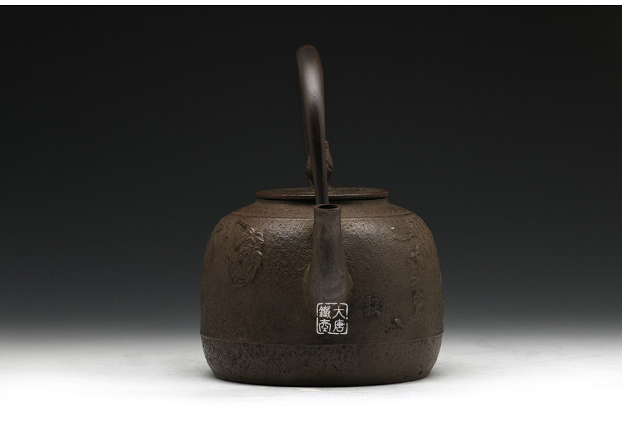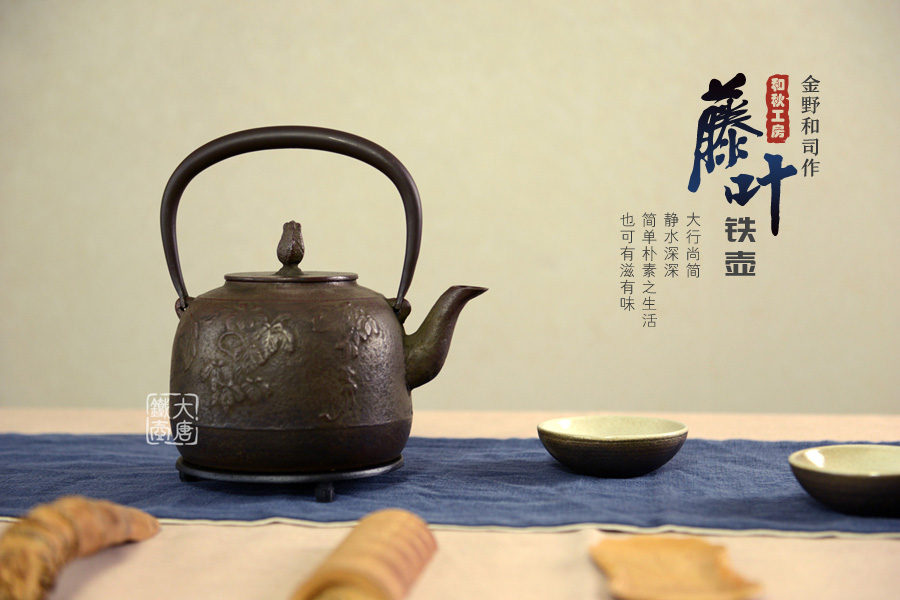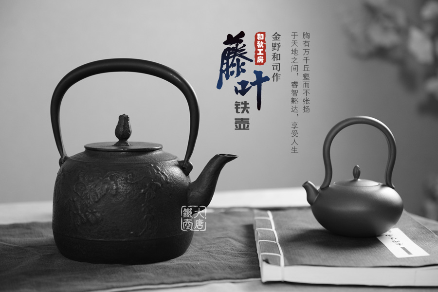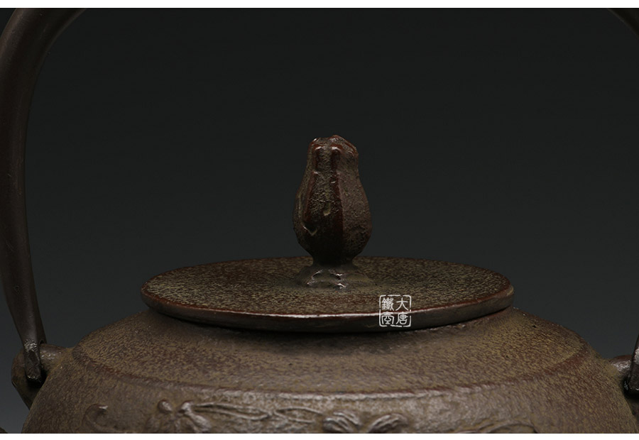鐵壺名家金野和司匠心之作,壺身正反兩面分別描繪著兩幅葫蘆藤的畫面,枝葉伸展,盡顯茂盛的生命力。葫蘆音同“福祿”,有招財納福之意。