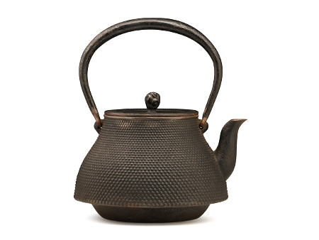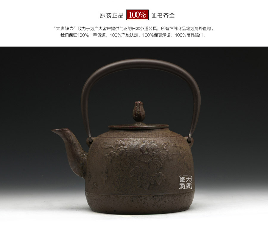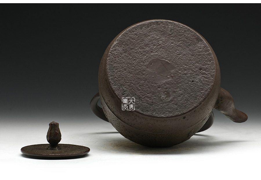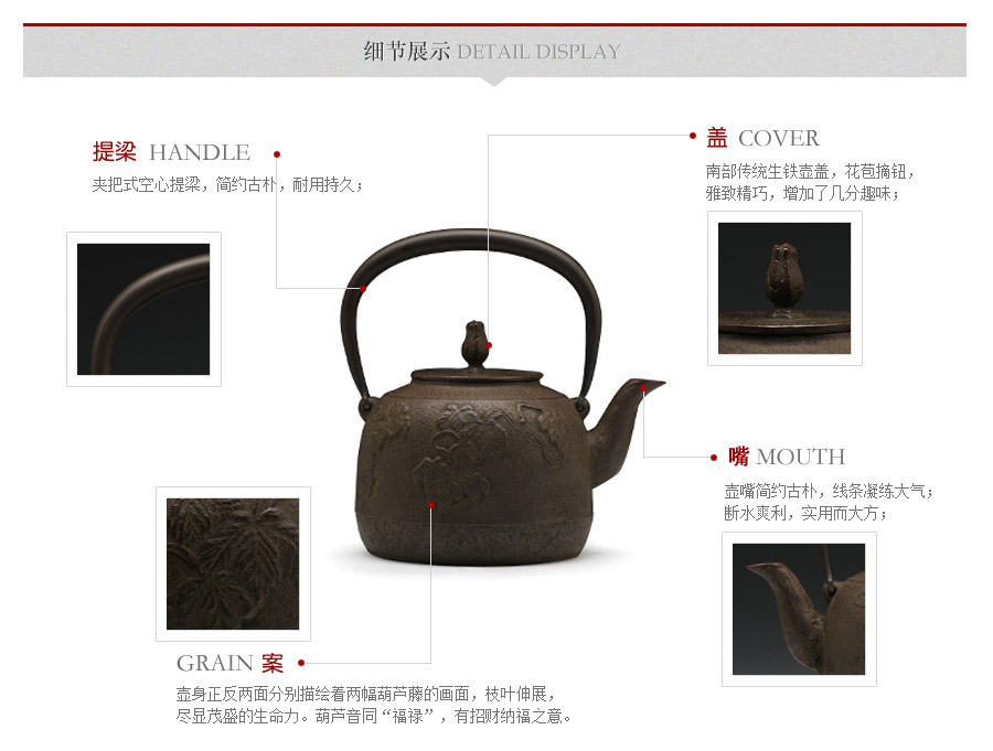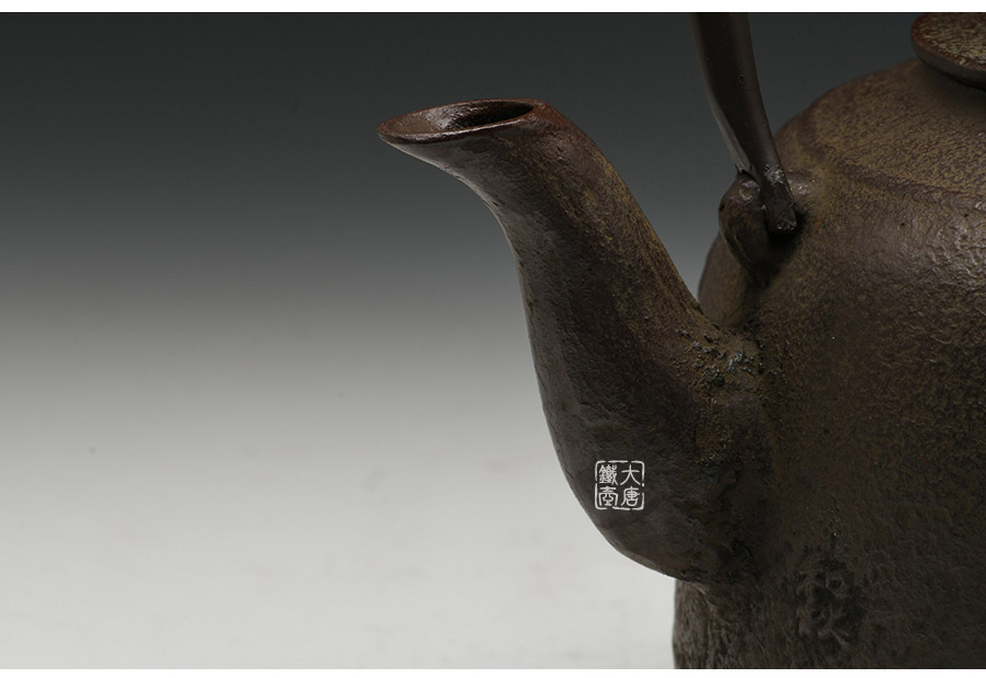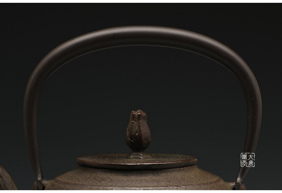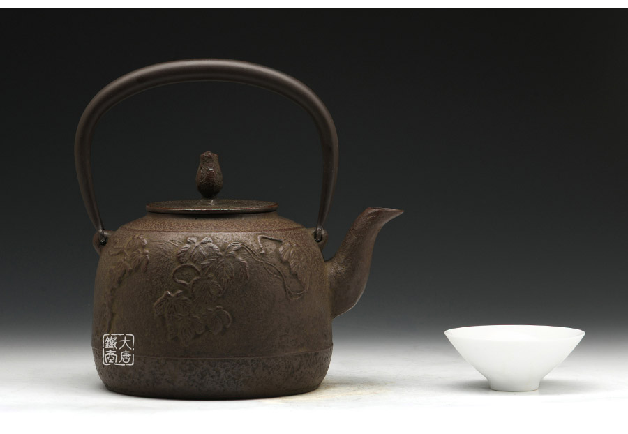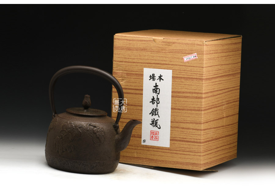 鐵壺名家金野和司匠心之作,壺身正反兩面分別描繪著兩幅葫蘆藤的畫面,枝葉伸展,盡顯茂盛的生命力。葫蘆音同“福祿”,有招財納福之意。