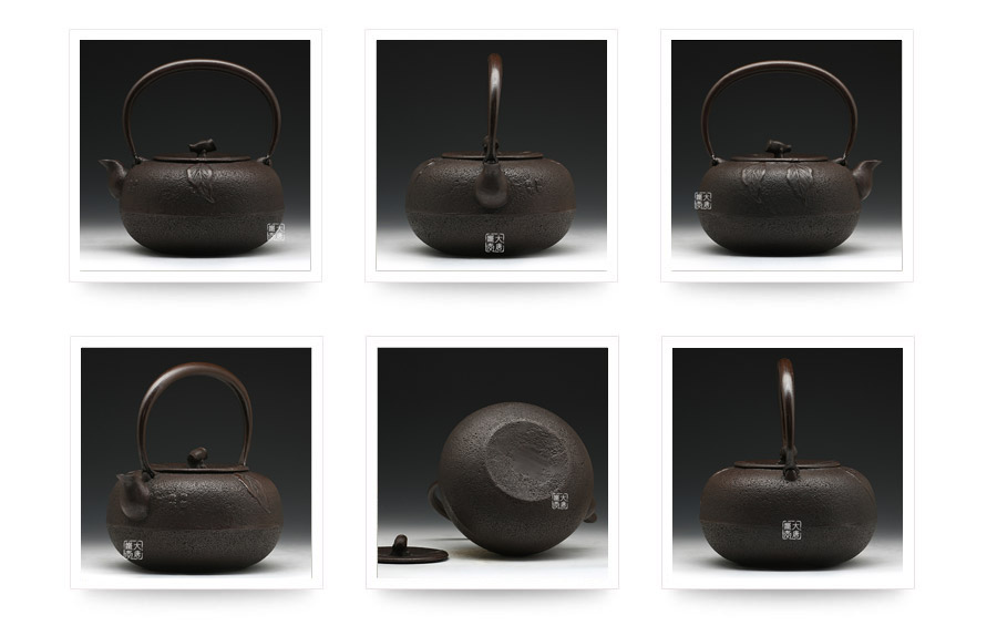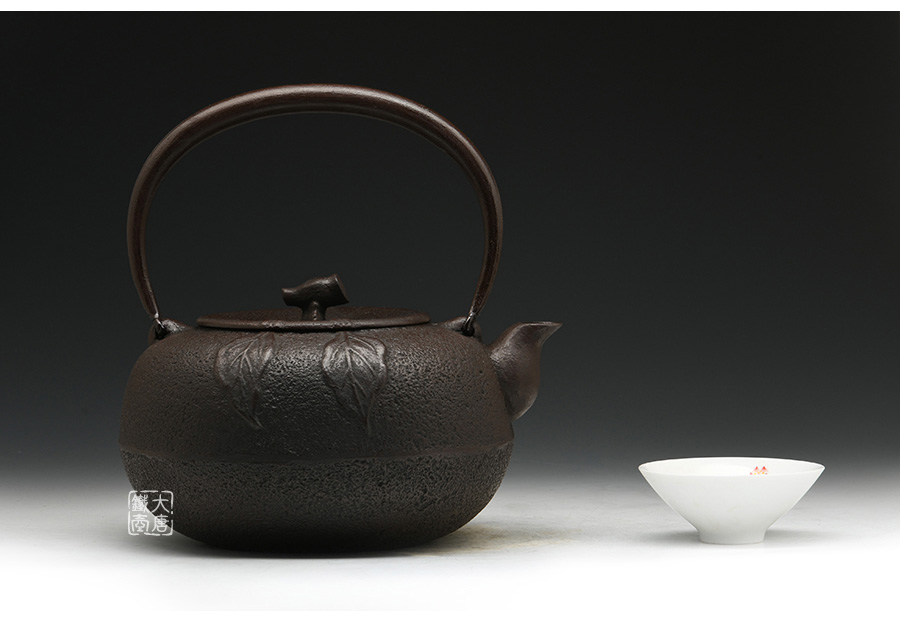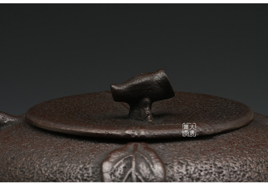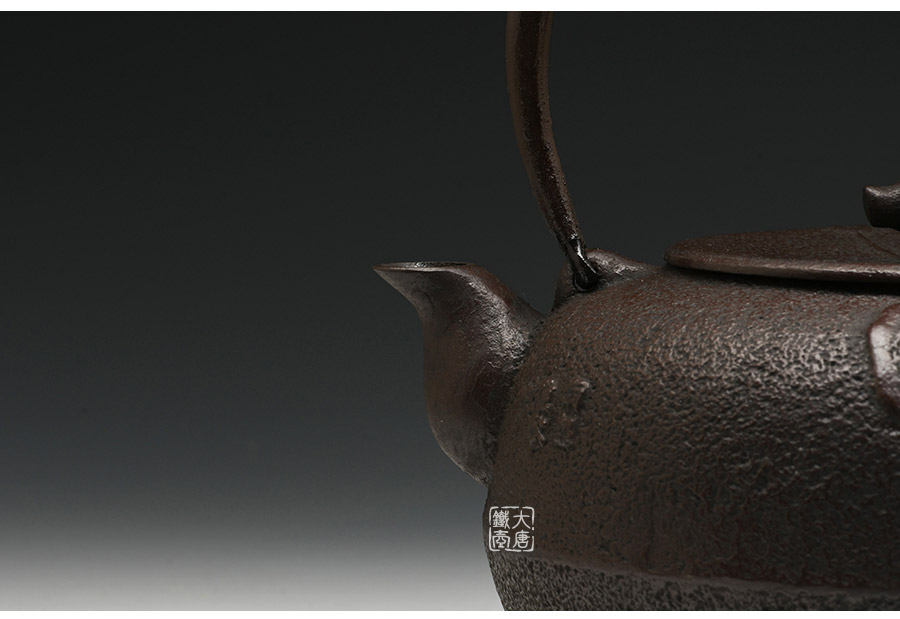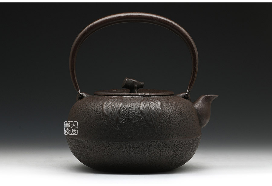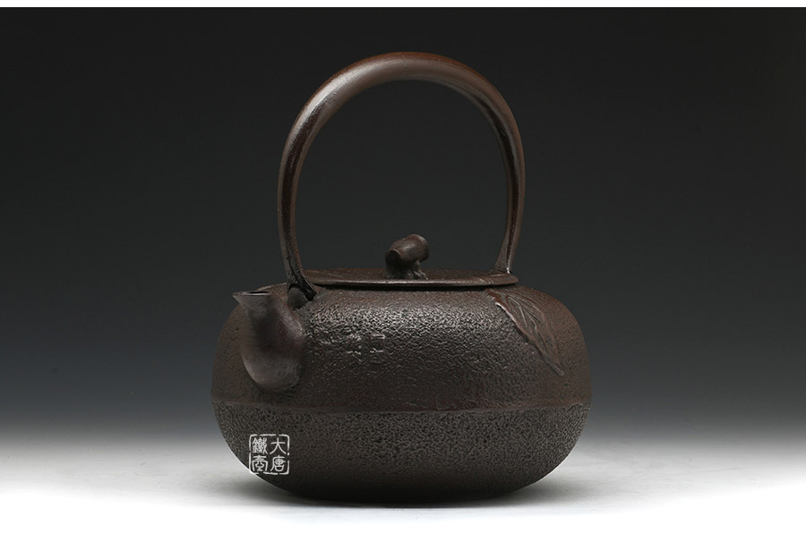 南部鐵壺新銳佐藤圭作品,整壺以飽滿的蜜柑果實(shí)為器型,果柄摘鈕,三片葉子將壺身與壺蓋融為一體,更有田園風(fēng)趣,亦使鐵壺充滿活力。
