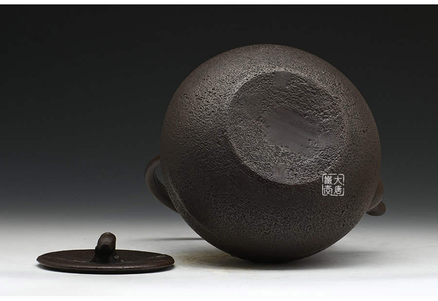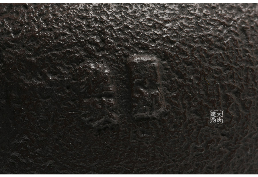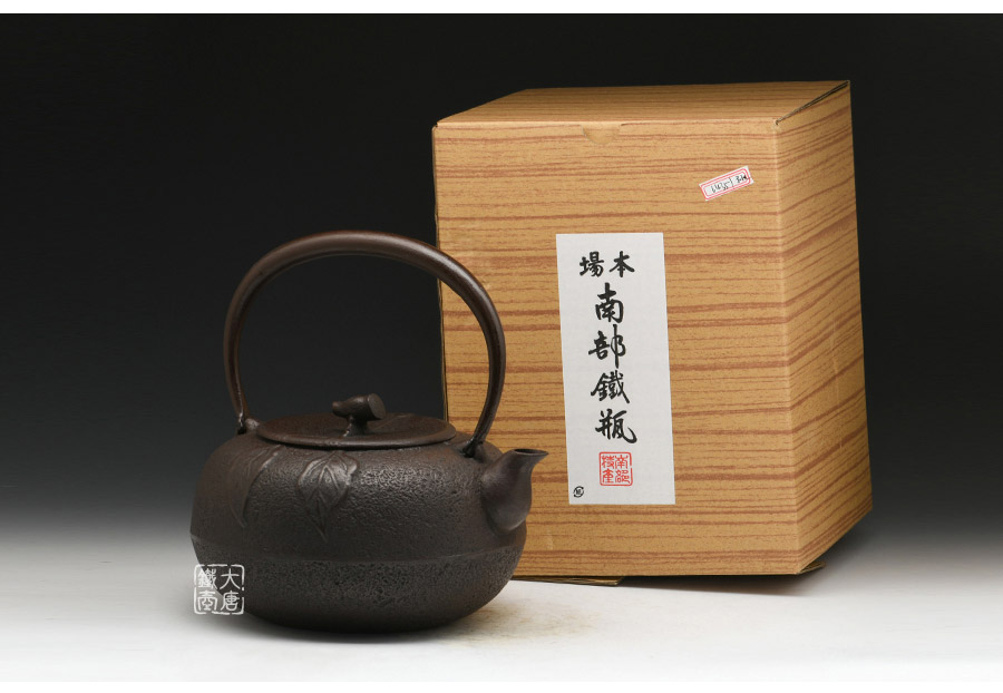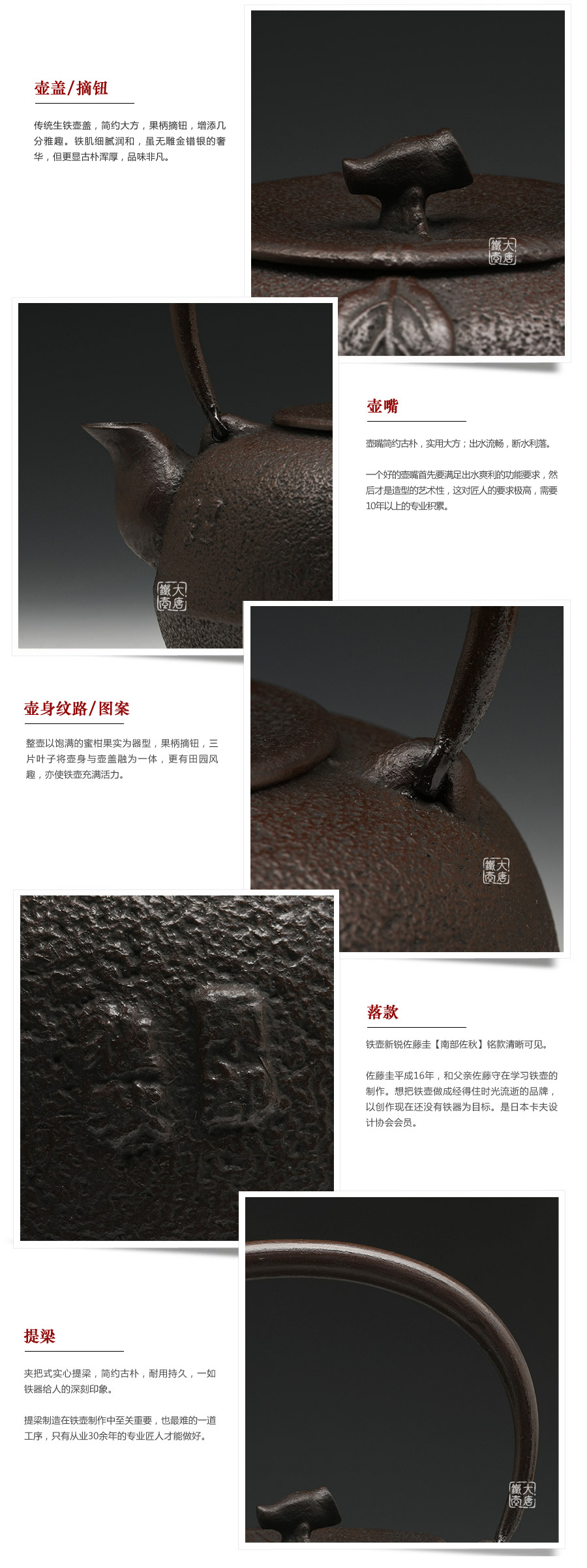 南部鐵壺新銳佐藤圭作品,整壺以飽滿的蜜柑果實(shí)為器型,果柄摘鈕,三片葉子將壺身與壺蓋融為一體,更有田園風(fēng)趣,亦使鐵壺充滿活力。
