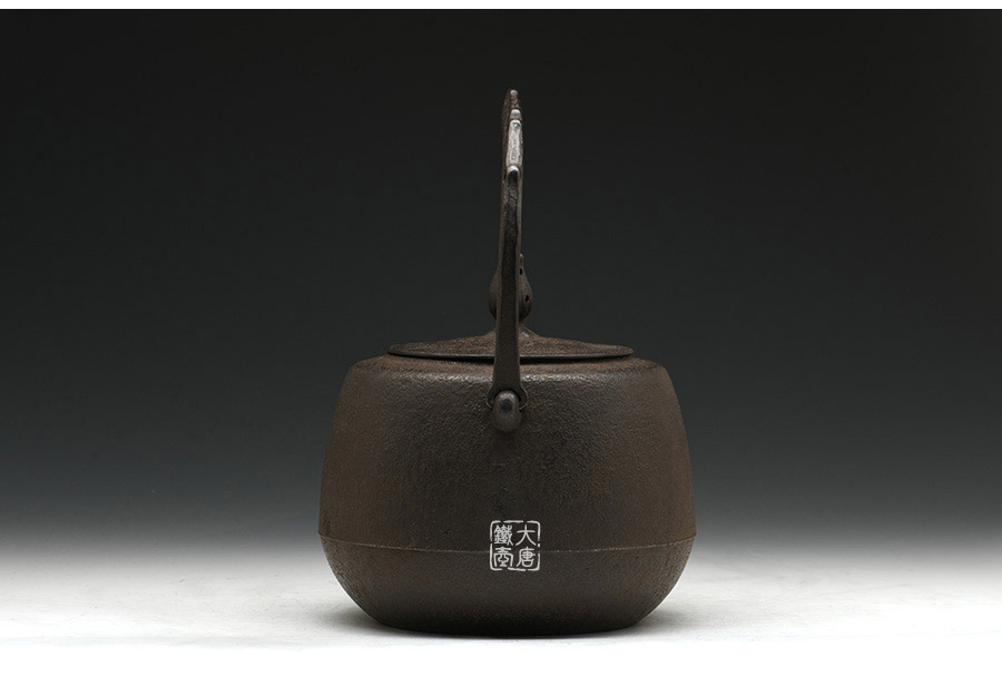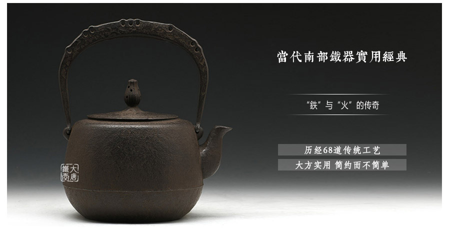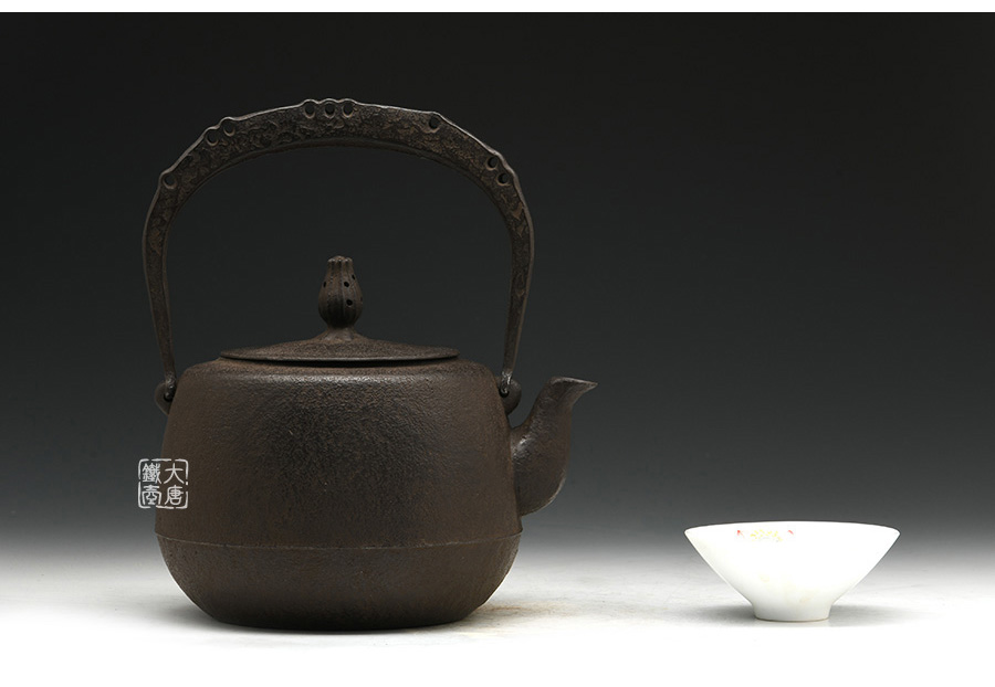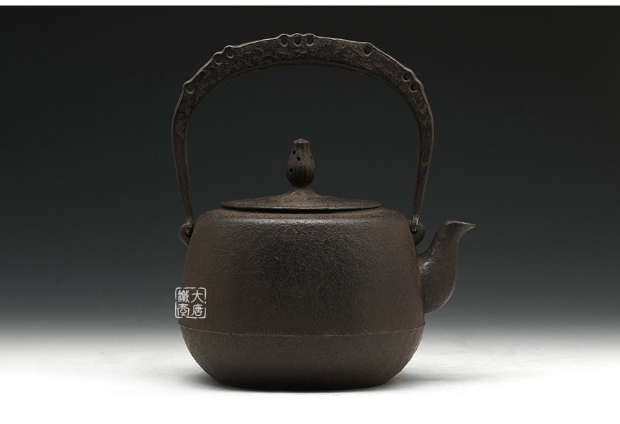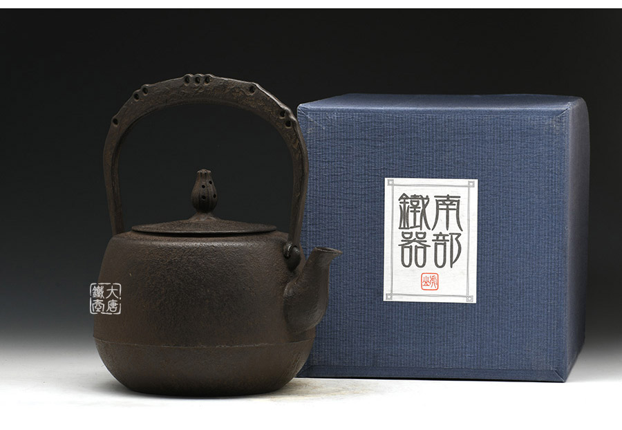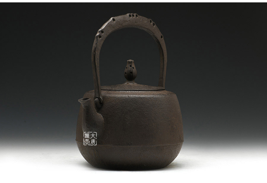 南部鐵器知名堂口虎山工房作品,純手工工藝,高溫氧化無涂層內壁,肩衝型,素紋,搭配特制實心提梁,渾厚古樸,韻味深長。