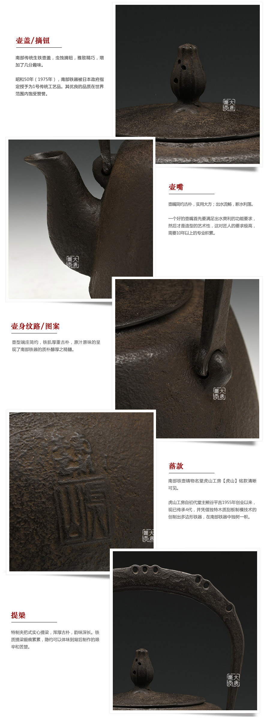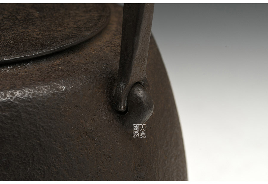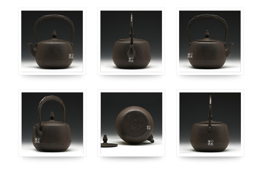 虎山工房創(chuàng)立于1955年,位于盛岡市手作村,是日本南部鐵器中的重要代表?!被⑸健敝从诔醮獛熜芄绕郊某錾厥且郧澳喜糠曫B(yǎng)老虎的地方,故取“虎山”作為工房的名字。熊谷平吉擅長印刻湯釜和鐵瓶上的圖案,制作的鐵器帶有濃厚的藝術氣息,被視為鐵和火融合于一身的茶道藝術品?;⑸焦し恐谱鞯蔫F瓶,主要以砂模澆鑄的方法為主,但是改進了木質刮板的制模技術,從而得以制作出多邊形的鐵器,在南部鐵器中獨樹一幟。