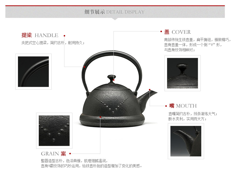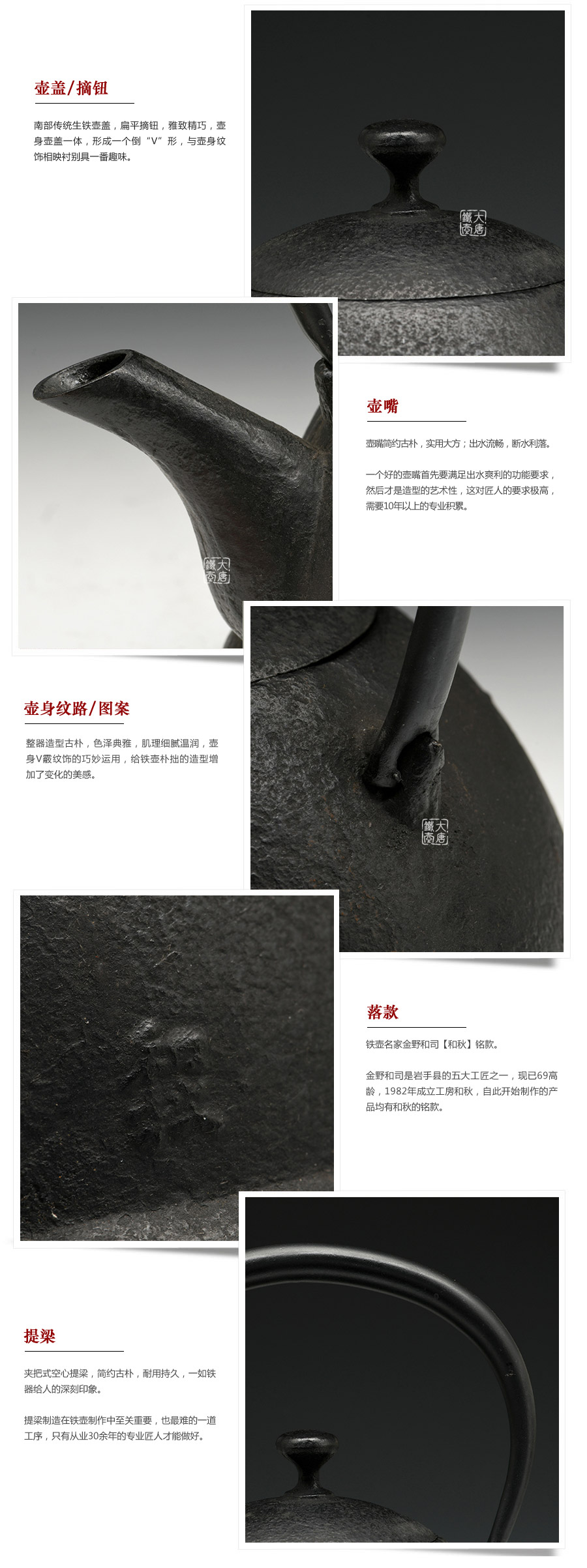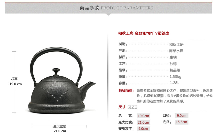 鐵壺名家金野和司匠心之作,整器造型古樸,色澤典雅,肌理細(xì)膩溫潤(rùn),壺身v霰紋飾的巧妙運(yùn)用,給鐵壺樸拙的造型增加了變化的美感。