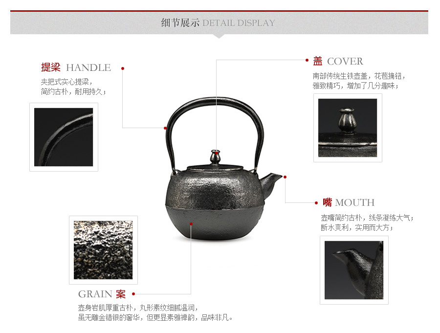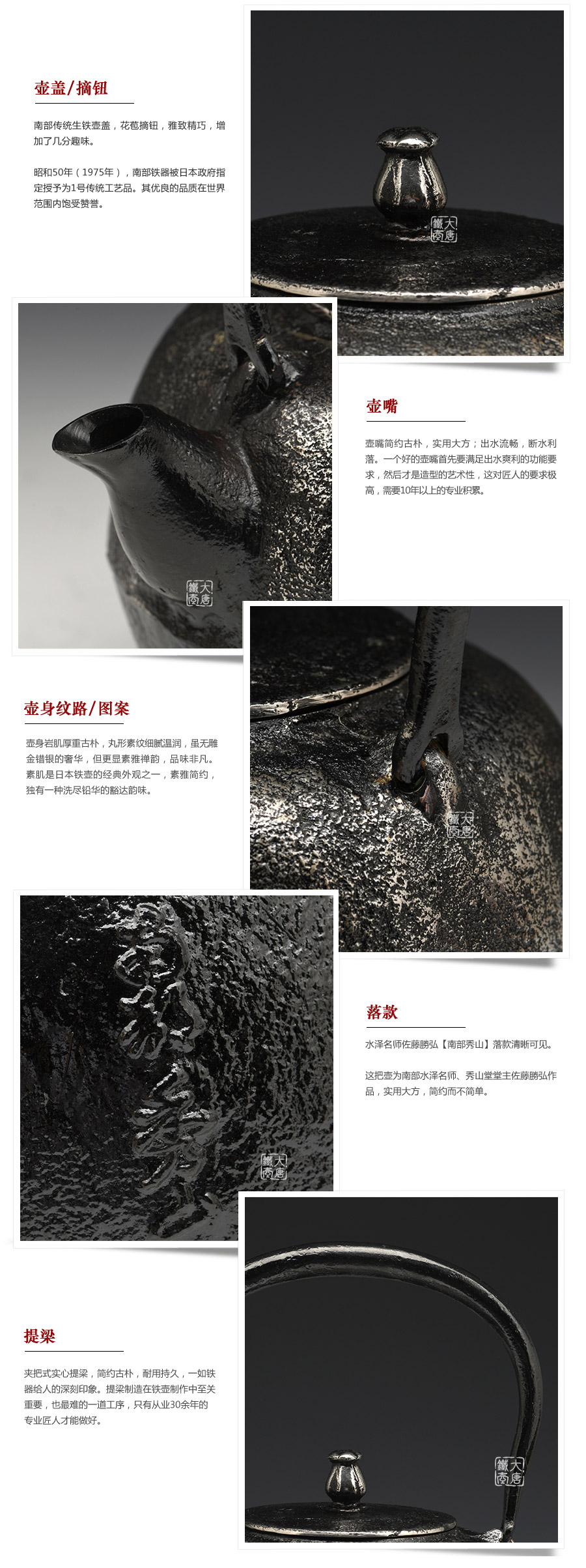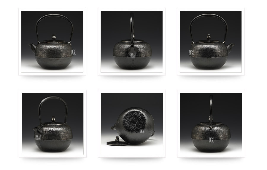 南部是鐵瓶的發(fā)祥地,御釜屋三代仁左衛(wèi)門(mén)將“手取釜”改造成鐵瓶,并固定了這種形式。所以從南部鐵瓶中可以明顯地看到茶釜的樣子。南部鐵器的追求古奧深沉的特點(diǎn),大多以黑色來(lái)裝飾鐵瓶的表面,以期達(dá)成如長(zhǎng)期受炭火熏燎的樣子。