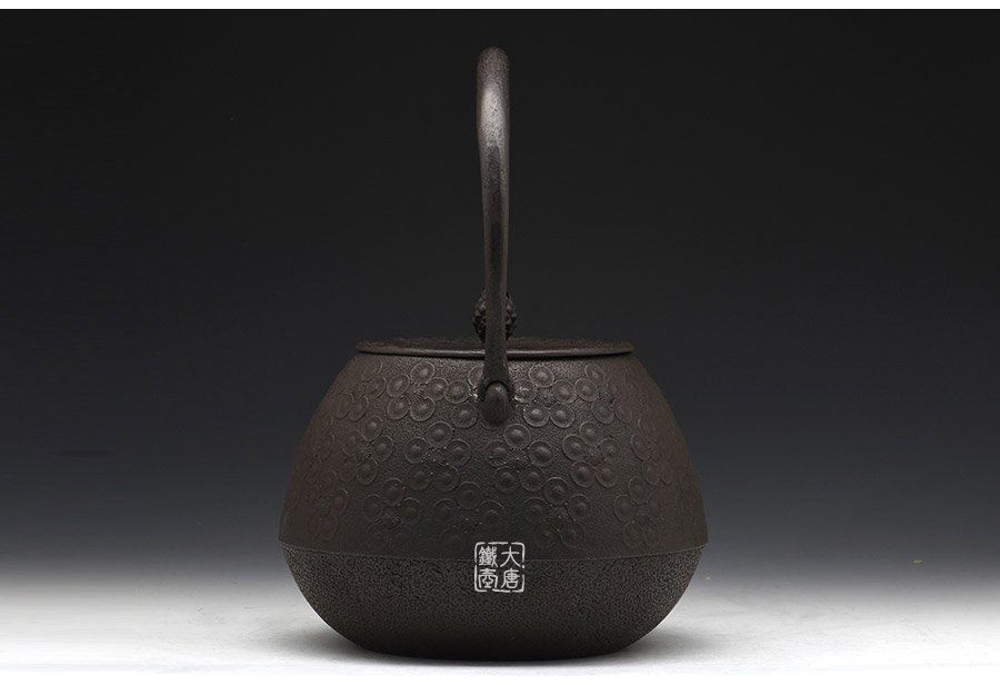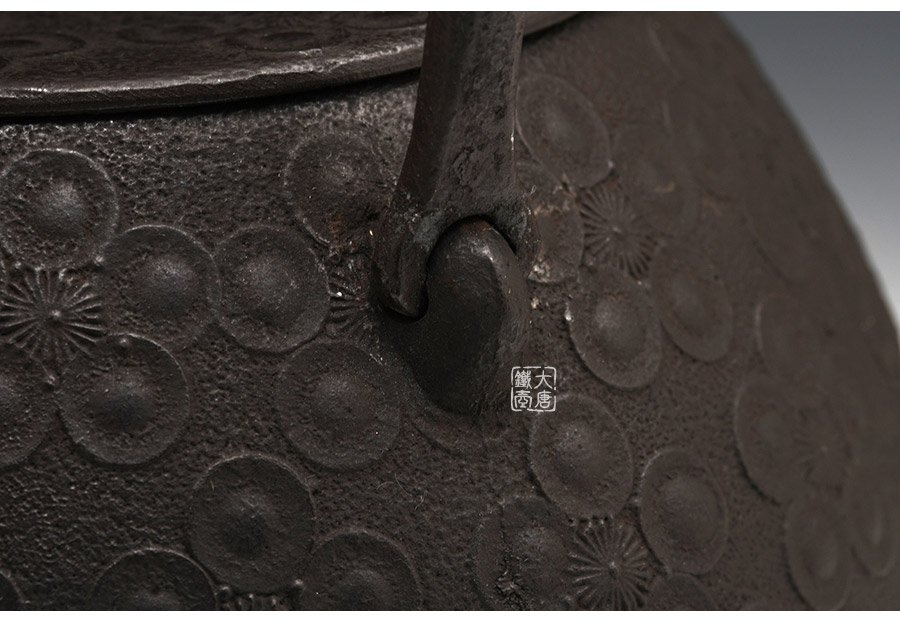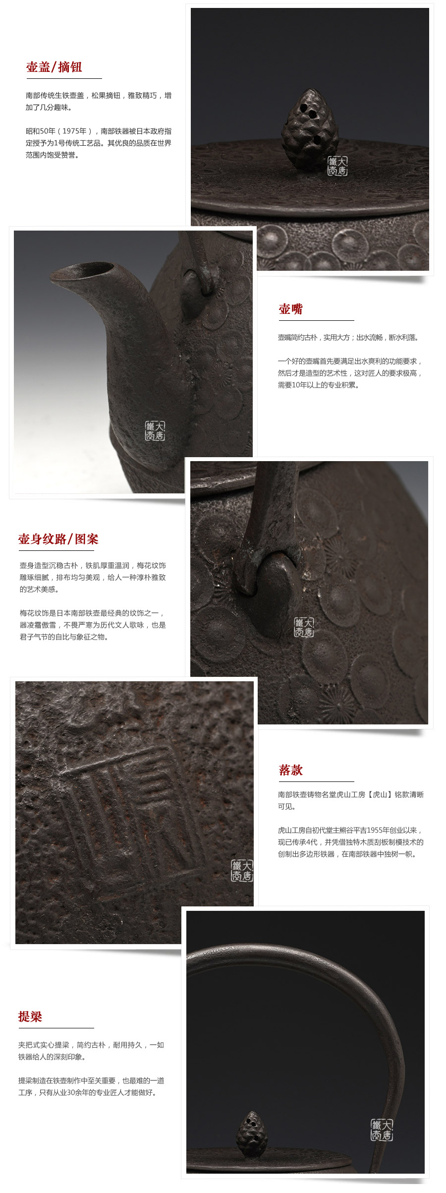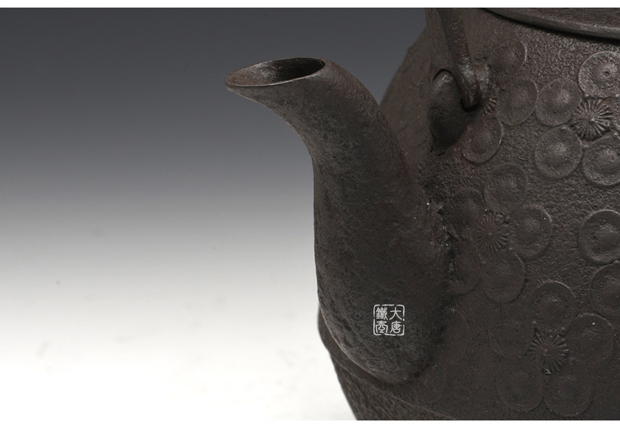 當(dāng)代釜師名堂虎山工房手工精品,壺身造型沉穩(wěn)古樸,鐵肌厚重溫潤,梅花紋飾雕琢細(xì)膩,排布均勻美觀,給人一種淳樸雅致的藝術(shù)美感。