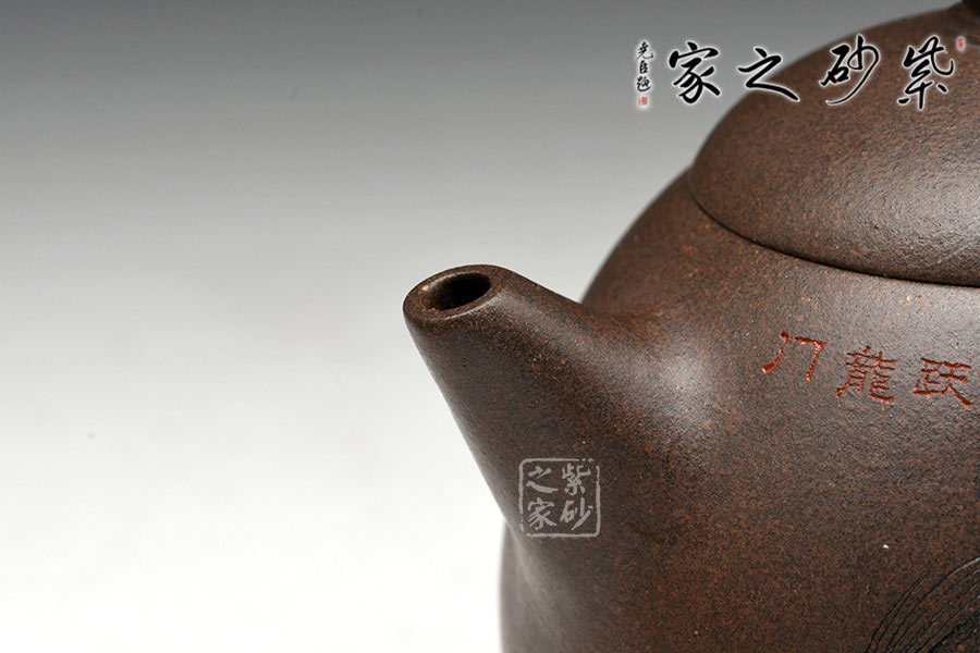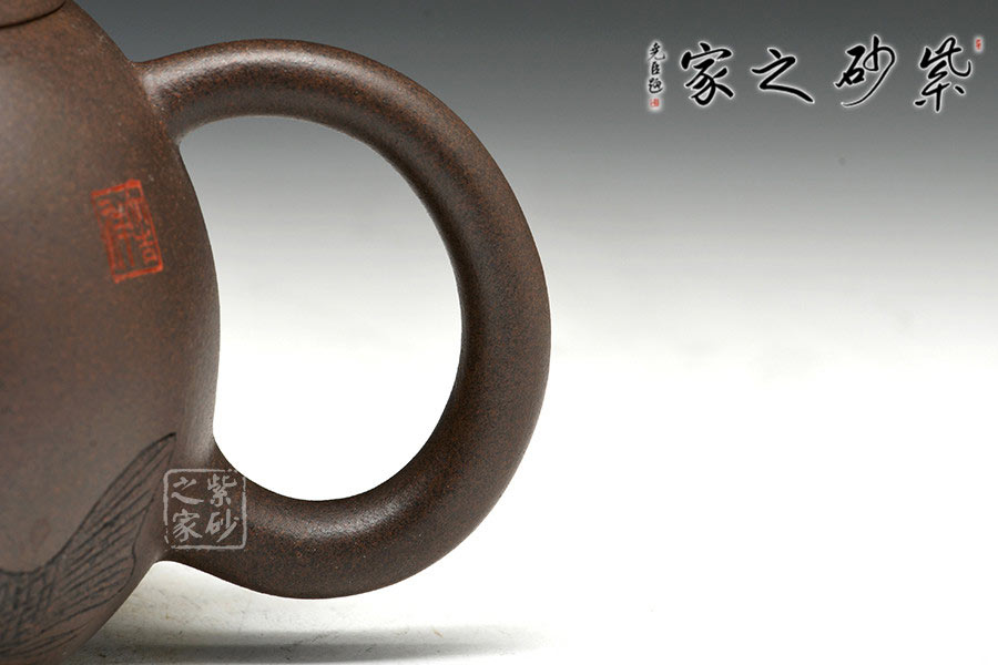張菊仙老師制作的此款壺不但繼承了傳統(tǒng)的的精髓,亦融入自己的思想,如此一把創(chuàng)作出新的器型更典雅與生動(dòng),此款龍旦壺以橢圓線構(gòu)成基本輪廓,造型單純、流暢,粗獷敦厚,整體感強(qiáng)。此壺形大開大闔,豪放瀟灑。通體狀似蛋形,嵌蓋,橄欖形壺鈕,修長(zhǎng)彎流壺嘴配以雕刻,形制優(yōu)雅古樸,大圈把勢(shì)與壺體趁勢(shì),亦以雕刻配飾,與壺嘴對(duì)應(yīng)而出,壺體下部過渡平緩。全器平添一種拙味和稚氣的親切感。