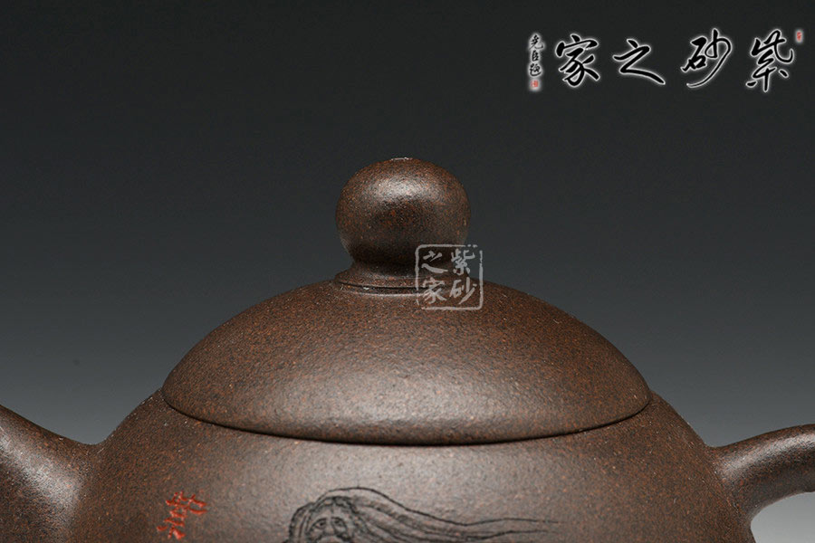 張菊仙老師制作的此款壺不但繼承了傳統(tǒng)的的精髓,亦融入自己的思想,如此一把創(chuàng)作出新的器型更典雅與生動,此款龍旦壺以橢圓線構成基本輪廓,造型單純、流暢,粗獷敦厚,整體感強。此壺形大開大闔,豪放瀟灑。通體狀似蛋形,嵌蓋,橄欖形壺鈕,修長彎流壺嘴配以雕刻,形制優(yōu)雅古樸,大圈把勢與壺體趁勢,亦以雕刻配飾,與壺嘴對應而出,壺體下部過渡平緩。全器平添一種拙味和稚氣的親切感。