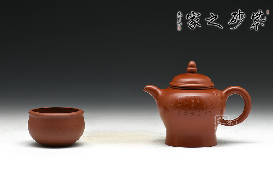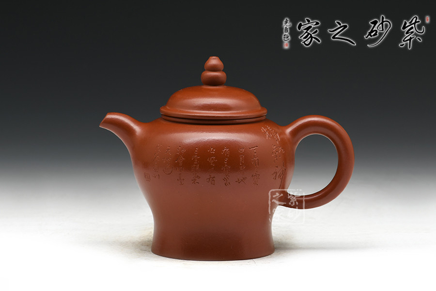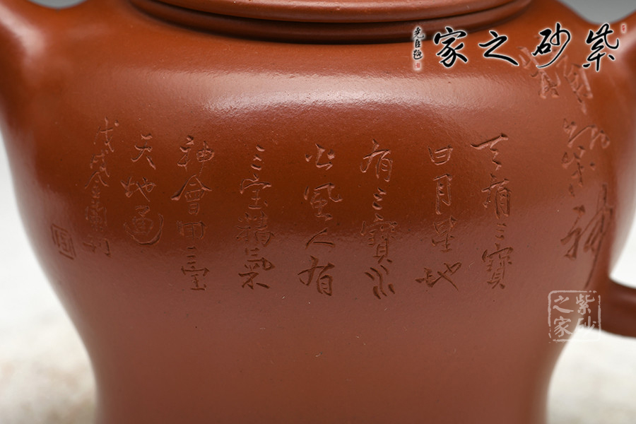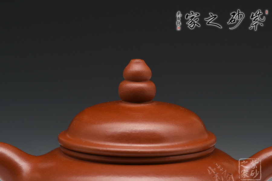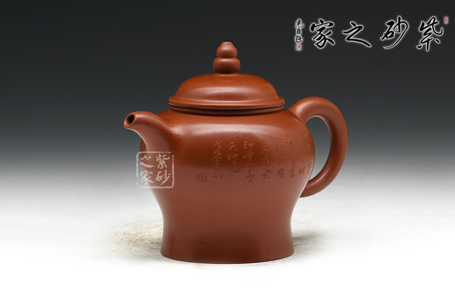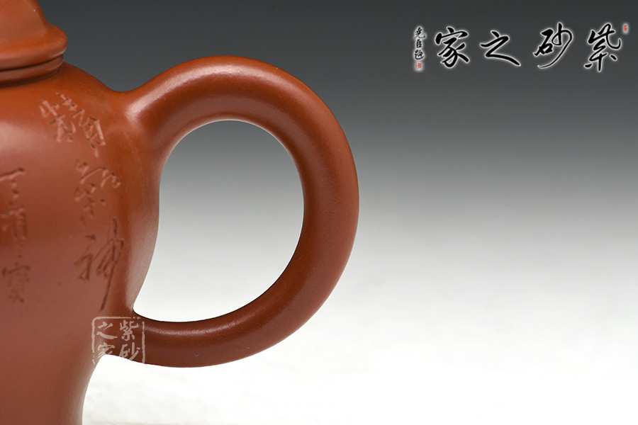 實力派陶刻家陶金蘭,師從當(dāng)代陶刻大家吳永寬,制壺陶刻雙通,作品細(xì)膩,實用性佳,是位勢頭正紅的女陶藝家。紅艷奪目的大紅袍為料,為瀕臨絕跡的極品朱泥,養(yǎng)成之后扎實沉重,細(xì)膩紅潤。壺式為高燈形,無論從泥料還是做工都極為講究,腹鼓,往下略收斂,一溜肩設(shè)計秀美絲滑。蓋鼓鈕力度十足,壺鈕似葫蘆狀,高高聳起,如燈塔般立于高處,指引遠(yuǎn)方歸途游子。整器點、線、面處理得清晰流暢,明針到位,真正達(dá)到了形、氣、神、貫穿一體。