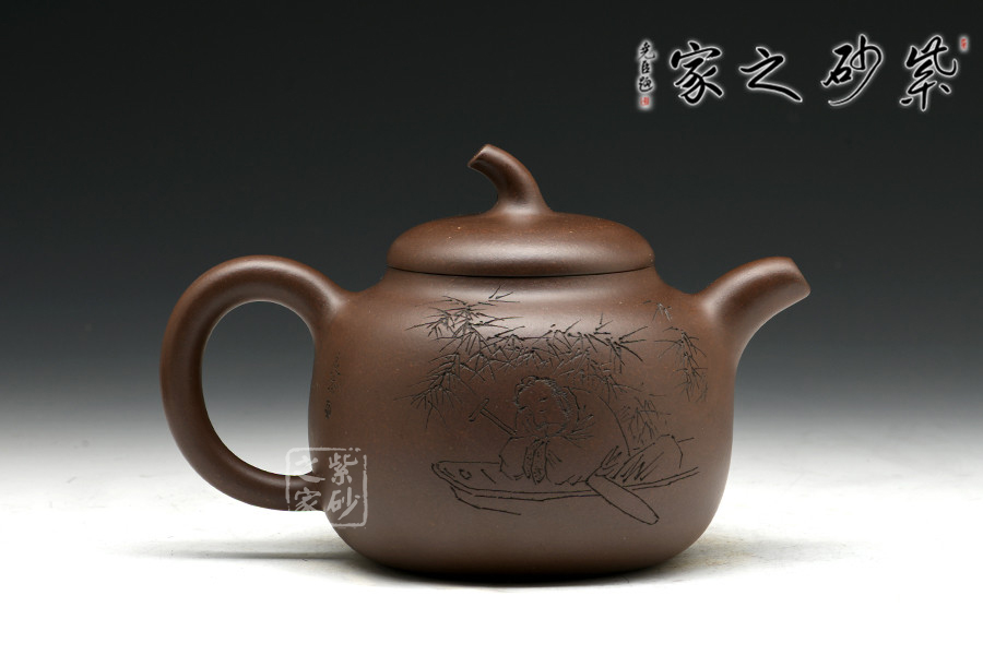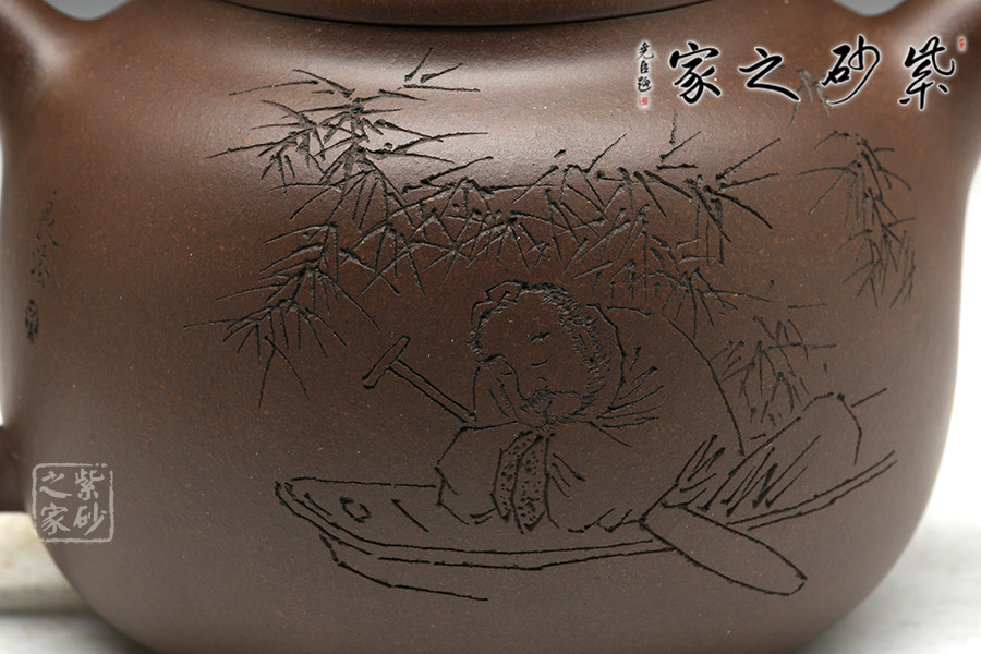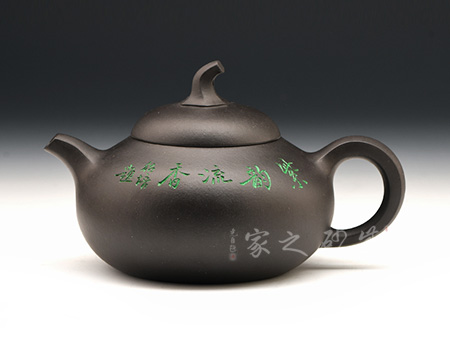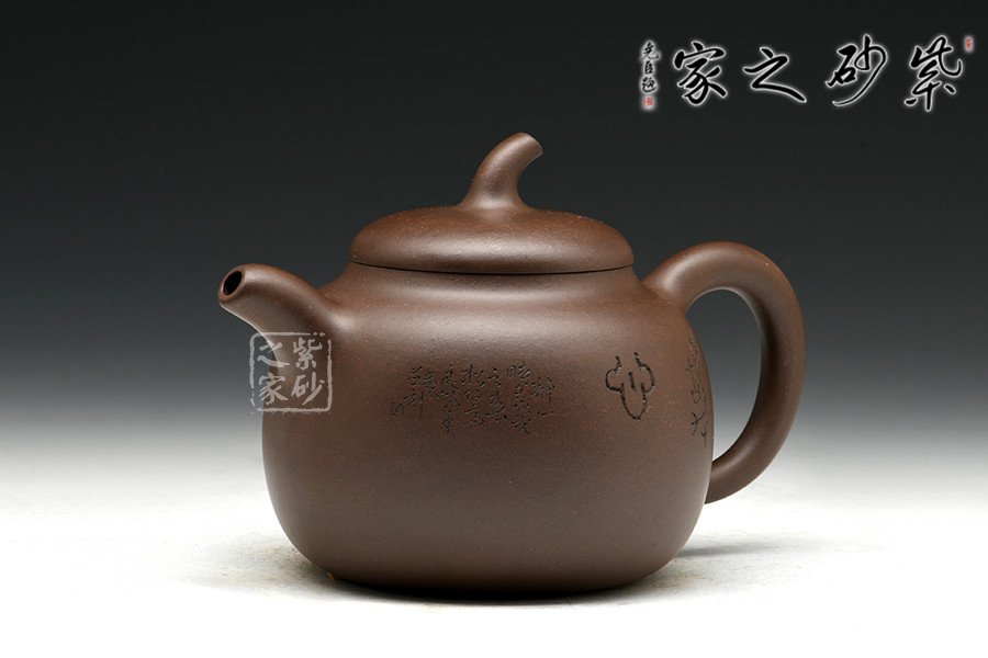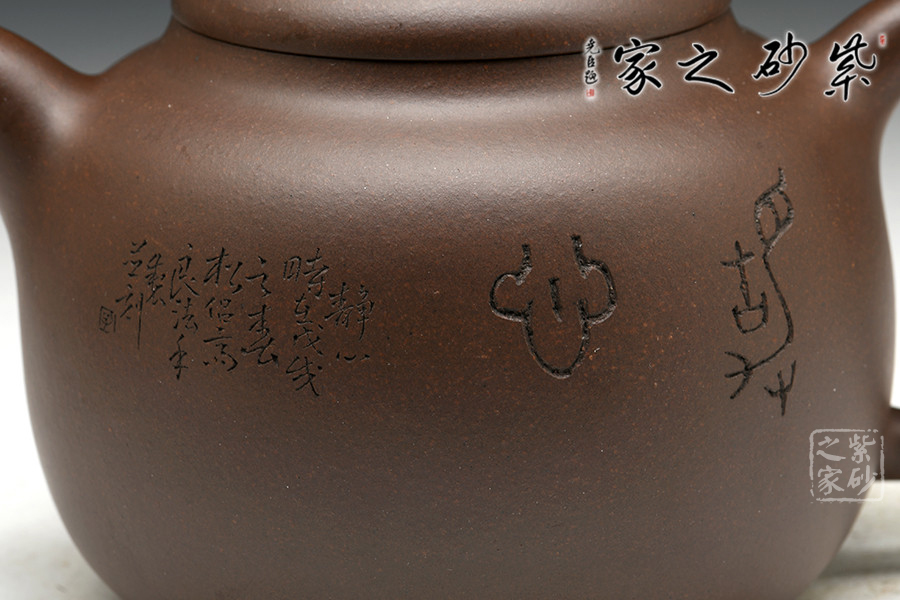 江蘇省陶瓷藝術(shù)名人孔良法,又為著名書畫家,作品將詩書畫完美結(jié)合,充滿浪漫唯美的文人氣息,集賞玩用于一體。以典茄段為型,作品于抽象中得靈氣,有丈夫清高內(nèi)斂之氣,令觀者叫絕。渾圓素樸的造型,淳樸自然,大巧若拙。圓弧型壺蓋,壺鈕似茄蒂,二彎壺流與耳狀壺把以壺身中線呈對(duì)稱呼應(yīng),壺身線條過渡自然流暢,非影像器材能詮釋。壺面充分表現(xiàn)出紫砂的種種優(yōu)越屬性,色澤暗淡沉樸,如紫水晶深邃,如古玉溫潤。