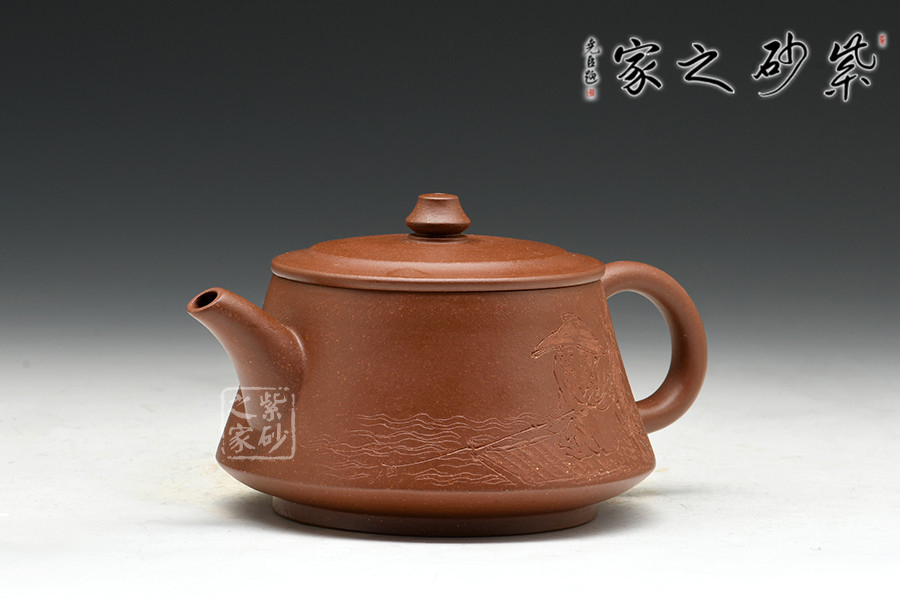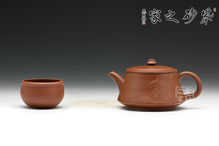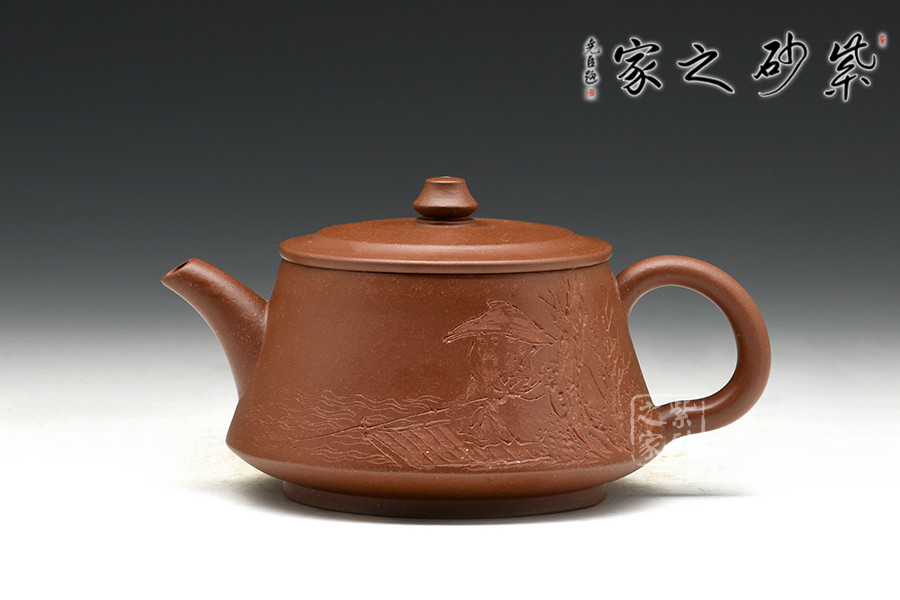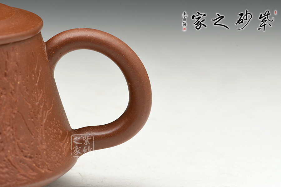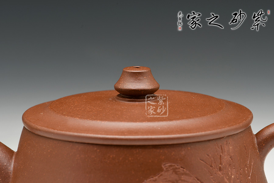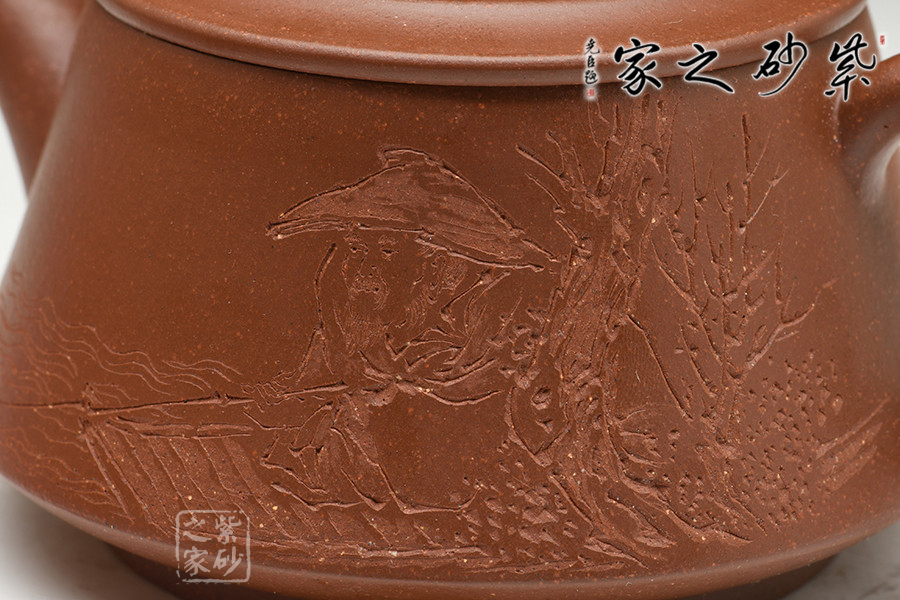 實(shí)力派陶刻名家邵雪群,書(shū)法刻繪卓絕,在業(yè)內(nèi)亨有聲譽(yù),陶刻作品雅韻橫生,集藝術(shù)性、觀賞性、實(shí)用性于一體。此作格調(diào)高雅,色調(diào)清逸質(zhì)樸,溫婉平和。壺身中部微斂,上下皆豐,造型美觀。彎流壺嘴,壺把彎曲有致,造型古雅,底蘊(yùn)十足。壺鈕若縮小版的壺身,精致可愛(ài)。嵌蓋設(shè)計(jì),與壺身混若一體,天衣無(wú)縫,氣密性良好。壺身雙面刻繪,一書(shū)一畫(huà),從意境到內(nèi)涵,從細(xì)微之處到渾然整體,都呈現(xiàn)出俊逸超拔的氣韻。