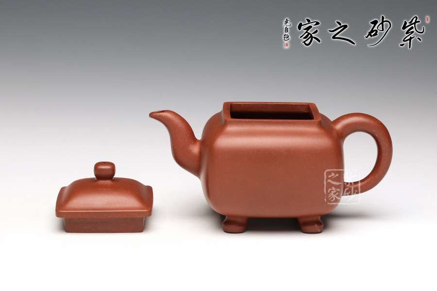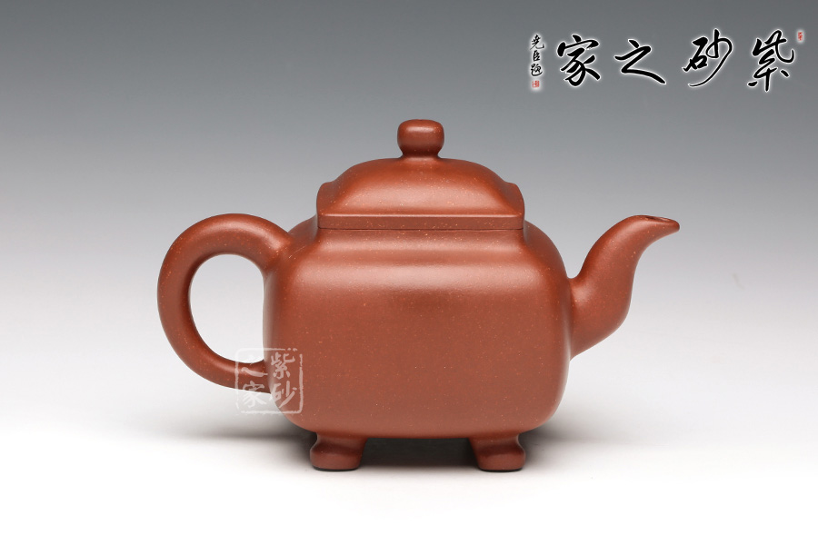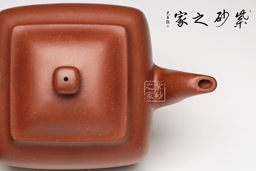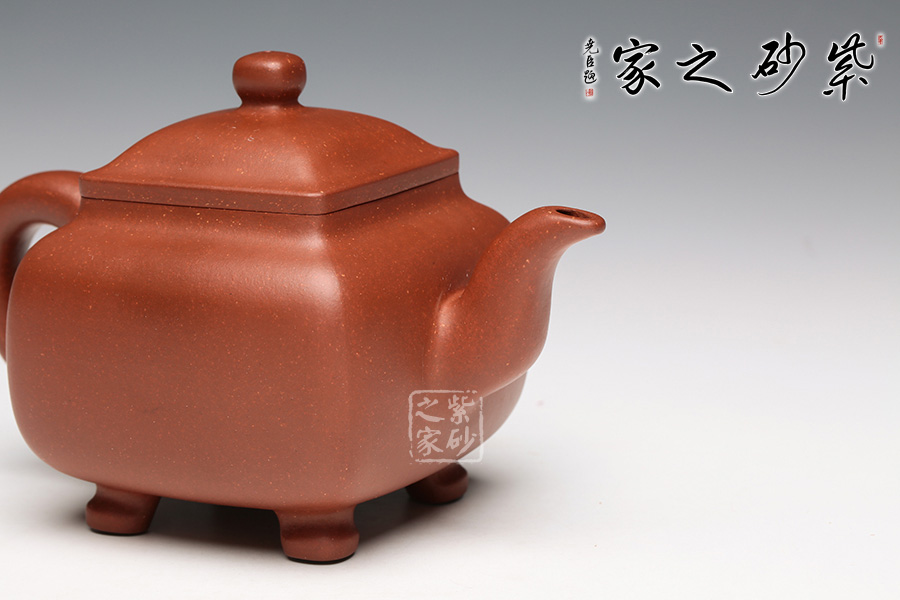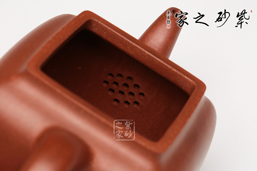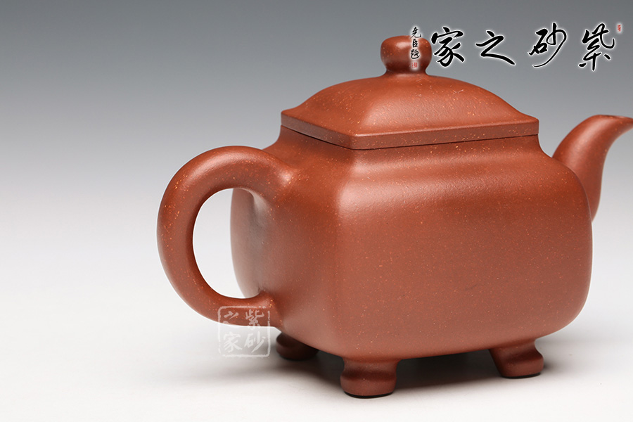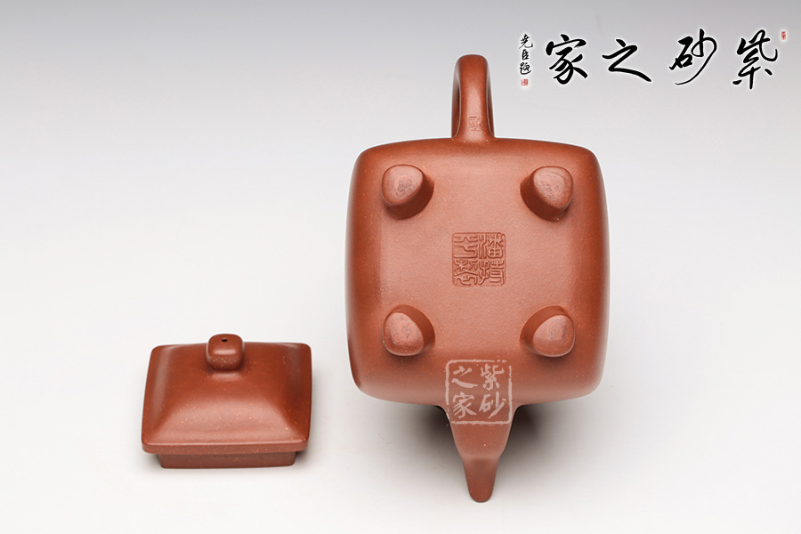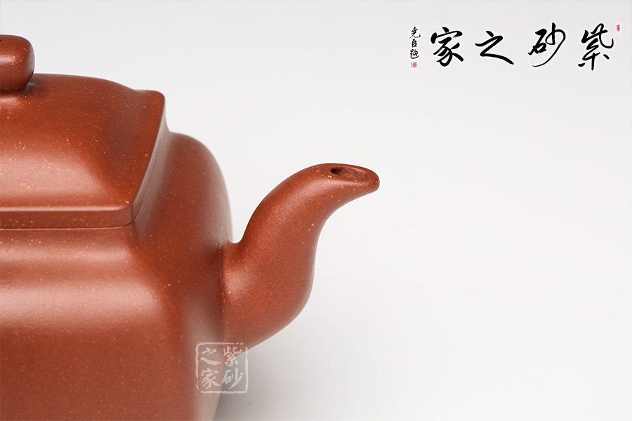 此壺是潘持平老師《鼎爐壺》的小款壺,壺身采用中國古代鼎的造型加以改良,通體火紅,似爐中焰火,經(jīng)久不息。壺口四方,大而不闊,鈕蓋渾圓光亮如珠,三彎壺嘴,氣韻流暢直至底足,頗有君子一言九鼎之氣度。讓人觀而生威,玩而生趣,愛不釋手。