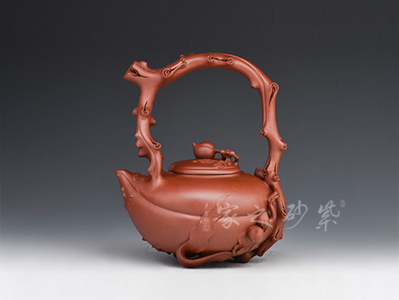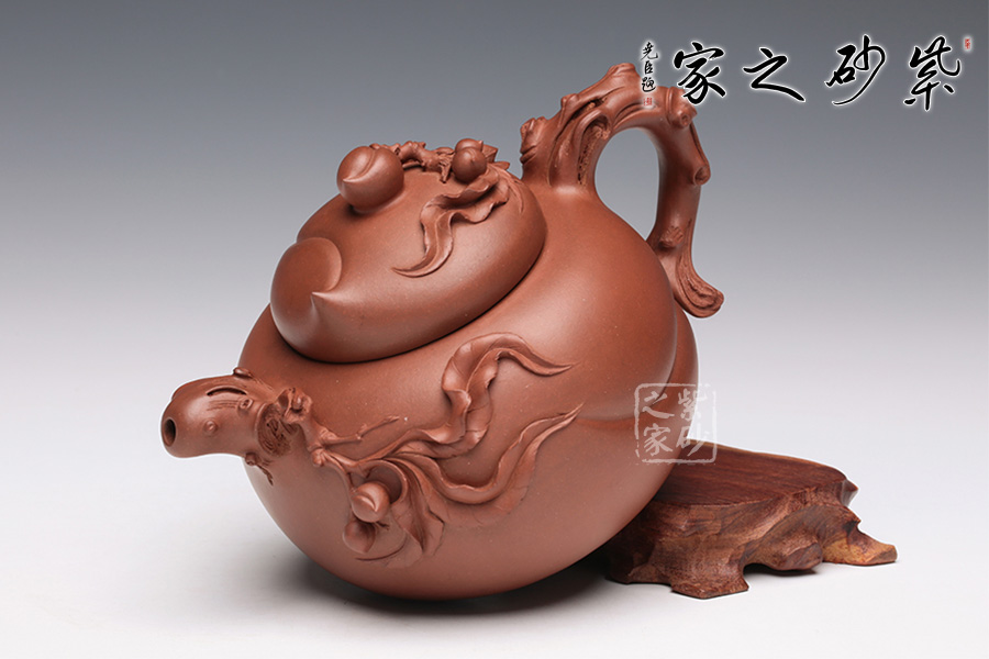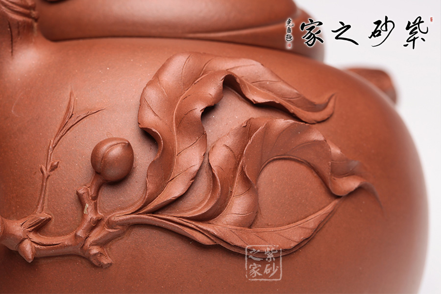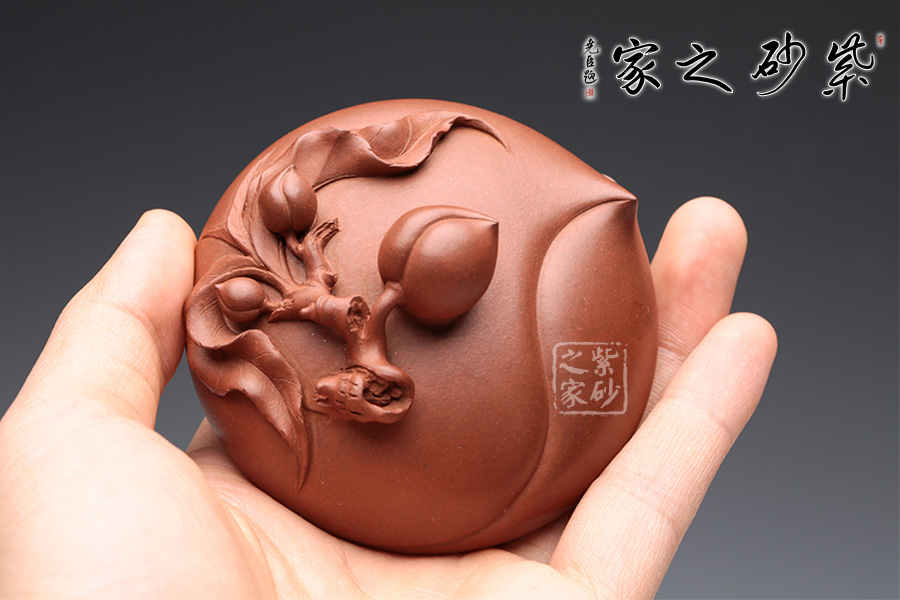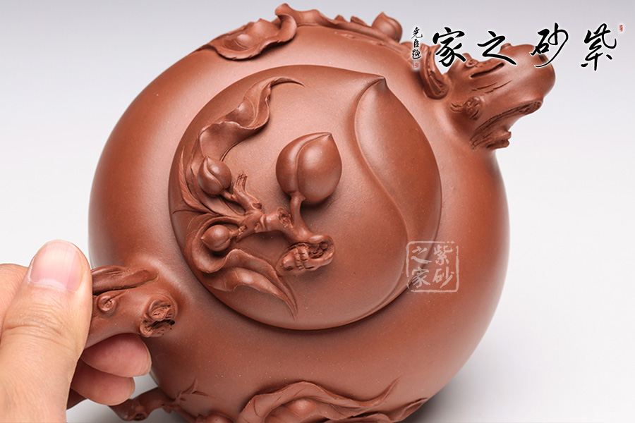 此壺采用原礦紅泥,色澤光潤,整體以桃為主題構(gòu)造,鈕蓋用一顆桃子做鈕,接連桃枝處又與兩顆小桃子爭相輝映,生動可愛。壺蓋渾然天成,用一顆大壽桃銜接完美無瑕。壺嘴、壺把造型逼真,似一彎桃木與壺身攜兩條桃枝交融,總共七顆仙桃隱匿于枝葉之中,搖搖欲墜。頗有齊天大圣初闖蟠桃園之狀,眼花繚亂又心生喜歡,不忍離去。