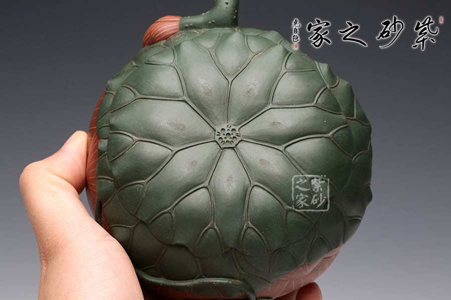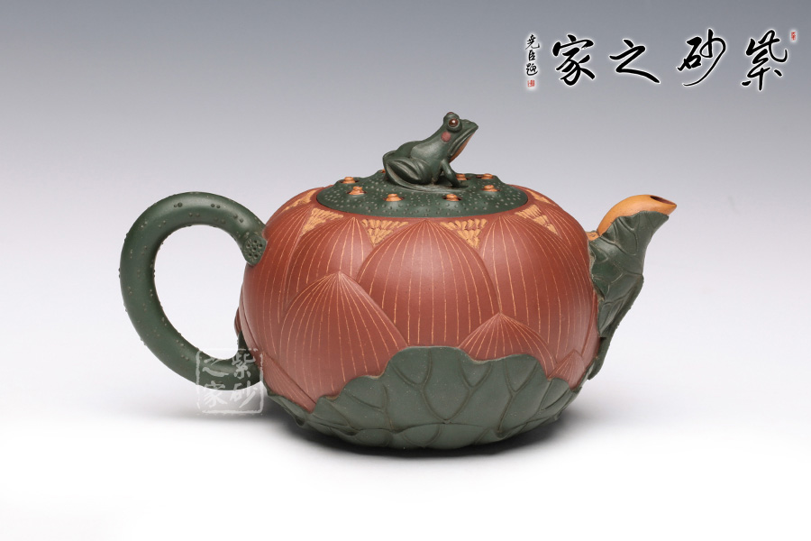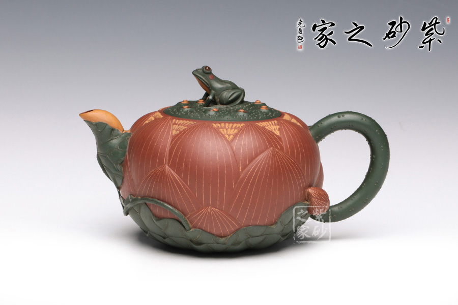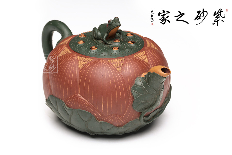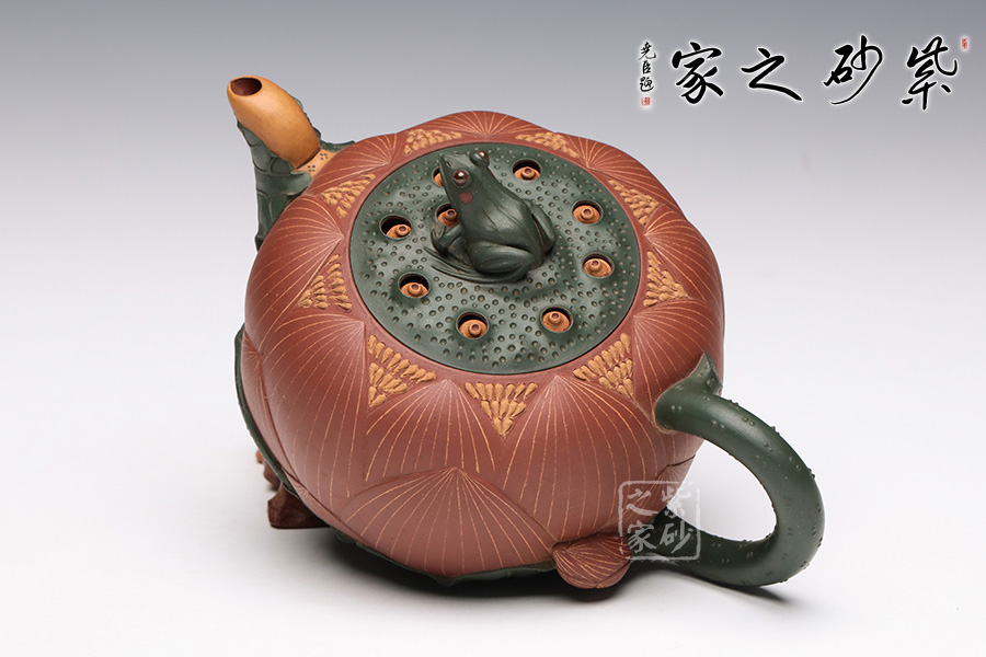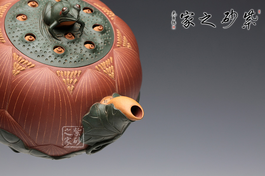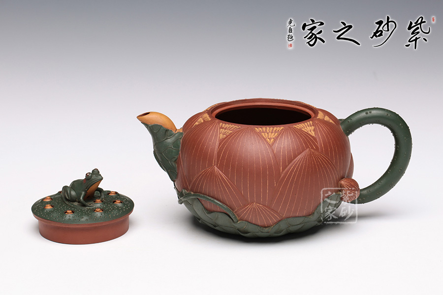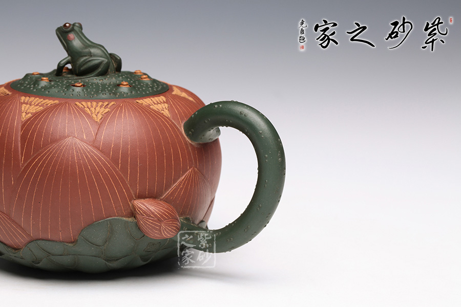 此把壺用泥大膽,色澤豐富,一朵嬌艷的荷花出淤泥而不染,佇立在夏日荷塘中。