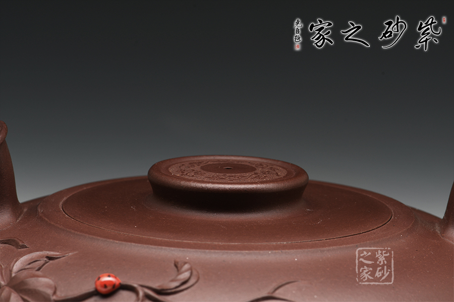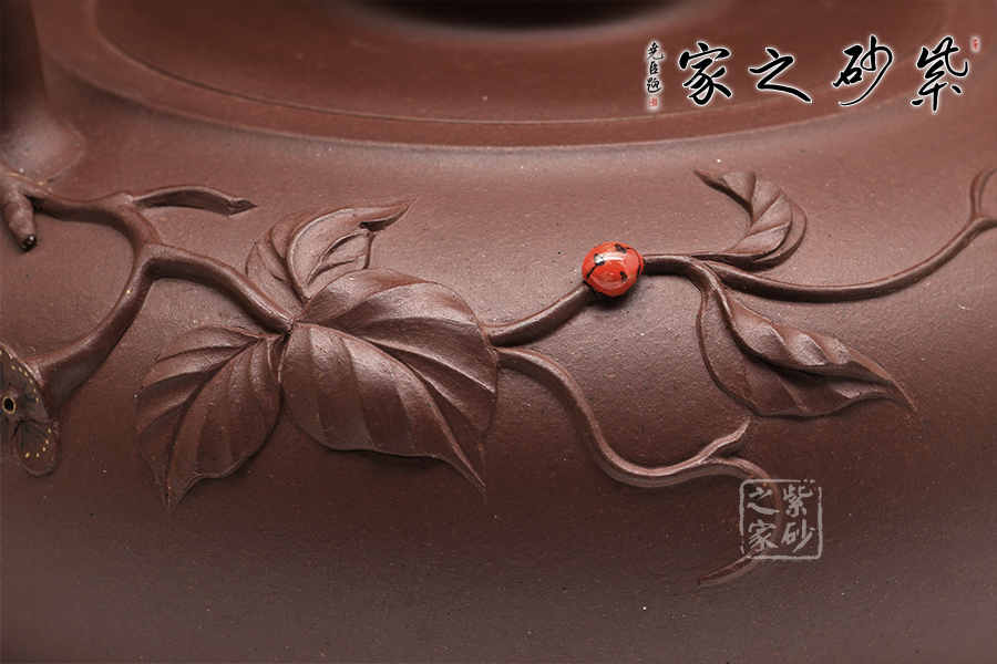 整體壺型扁平矮小,壺身一朵牽?;ò迪闶㈤_,枝蔓處點綴一只昆蟲,嬌小可愛,童趣躍然。不為人知的枝蔓纏繞而上依把攀巖,自然簡樸,一只發(fā)紅的七心瓢蟲靜悄悄的在枝蔓上熟睡,這是一個安靜的夏天。