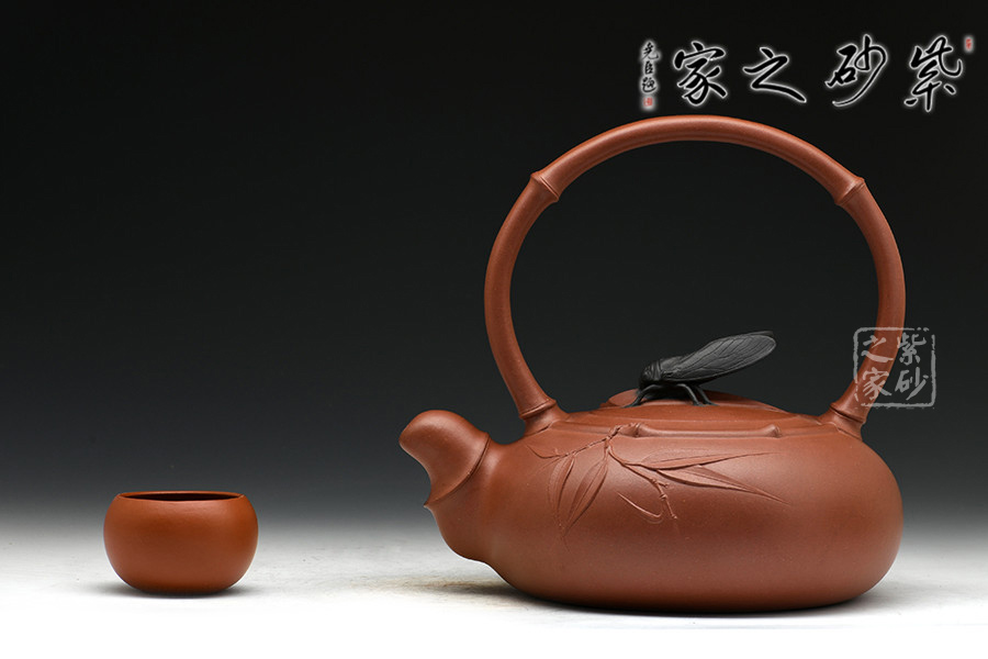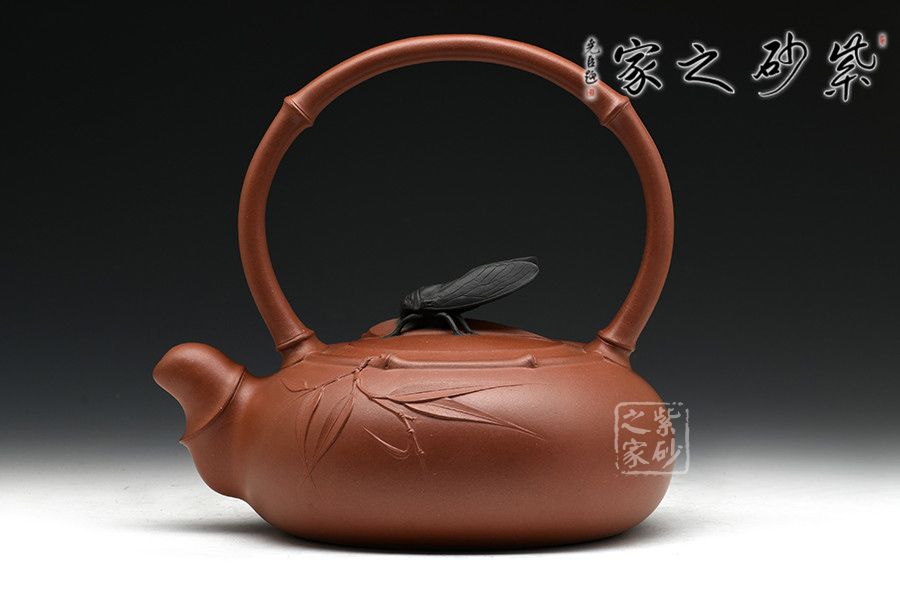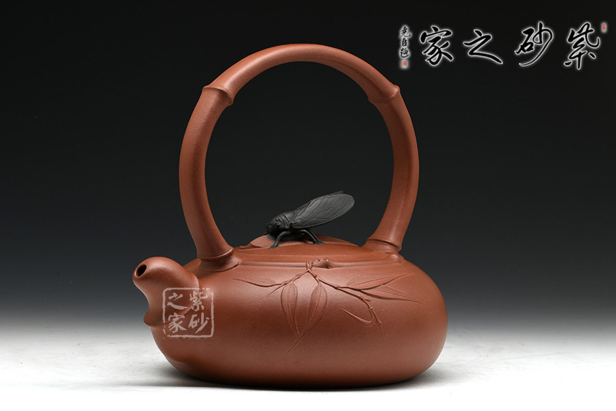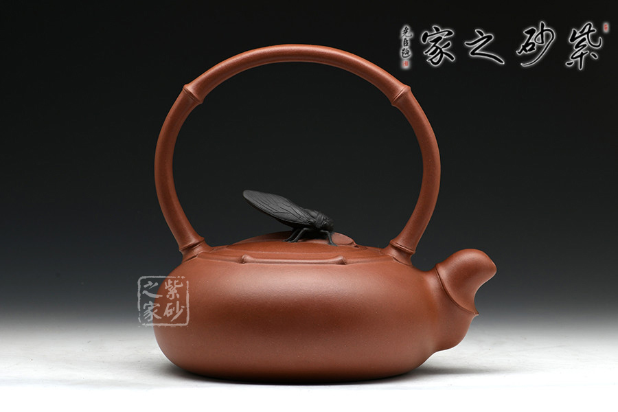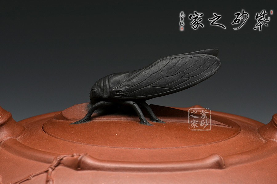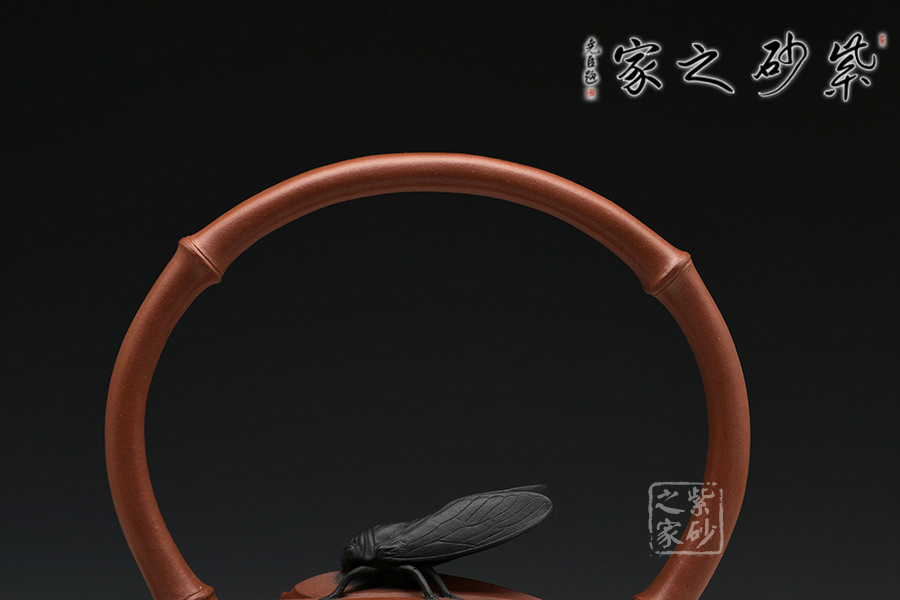 鈕蓋獨(dú)具匠心,新穎別致,黑色知了停于蓋上,栩栩如生。竹節(jié)提梁,優(yōu)雅彎曲,壺嘴做短小節(jié)流,創(chuàng)意唯美。圈肩環(huán)繞于壺口處,收縮有度,手法自然,整把壺渾然天成無手作痕。