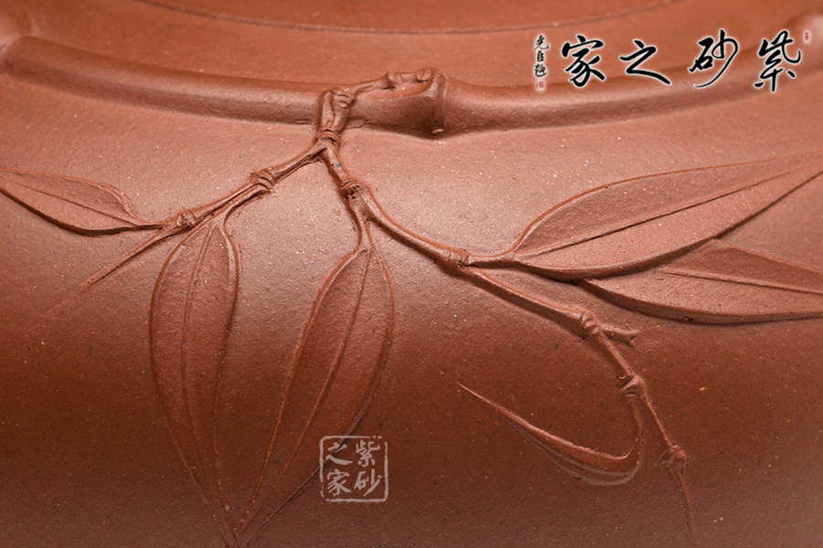 此壺是季益順大師的得意之作,壺身偏而不塌,圓潤有度,整把壺以竹為主題,高潔儒雅,氣節(jié)清幽。竹與“足”諧音,知了躍然壺上,寓意“知足常樂”。