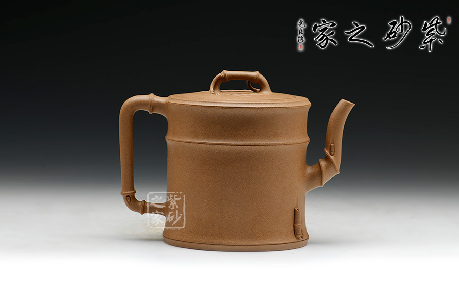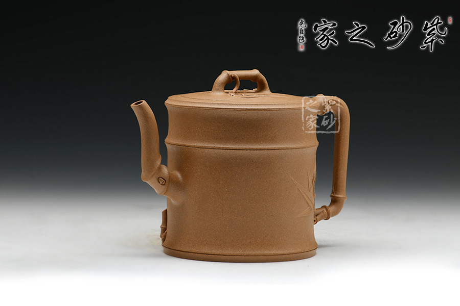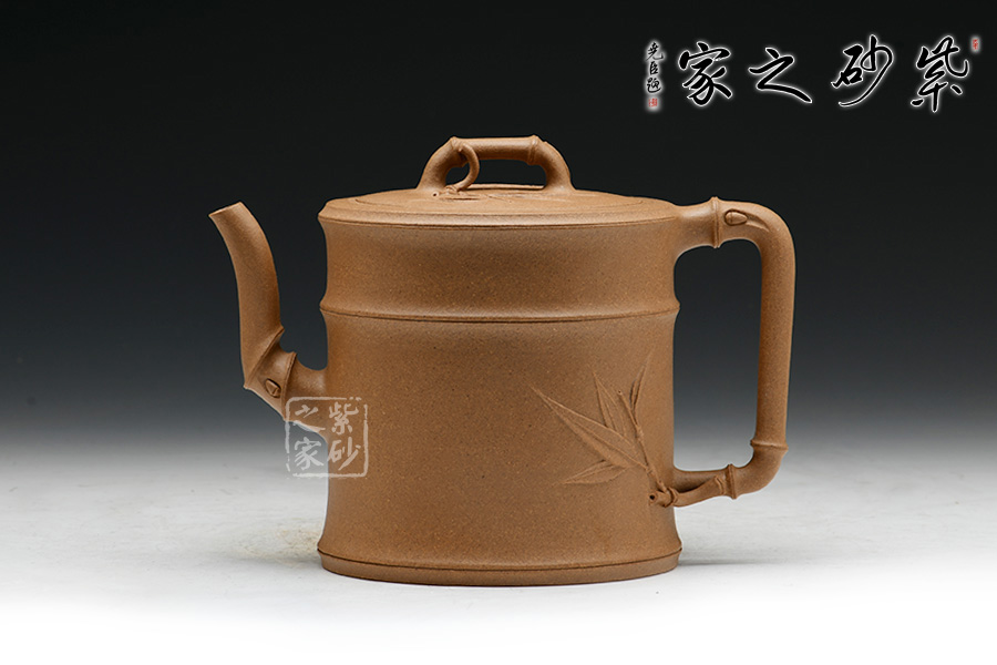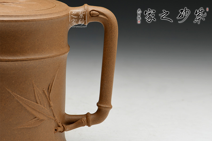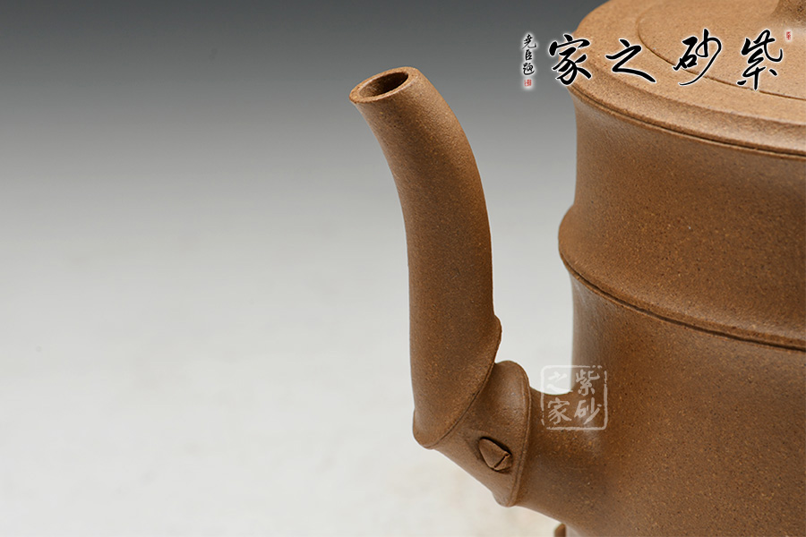 此壺身高口大,嘴長(zhǎng)流彎,直把竹韻。整把壺采用竹節(jié)造型,壺鈕意蘊(yùn)自然,取竹節(jié)造型,壺嘴彎曲,在傳統(tǒng)三彎流的基礎(chǔ)上,獨(dú)創(chuàng)新意,將竹子的造型印活于鈕處,過(guò)度自然,韻味知足。