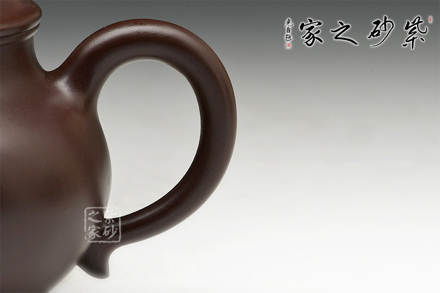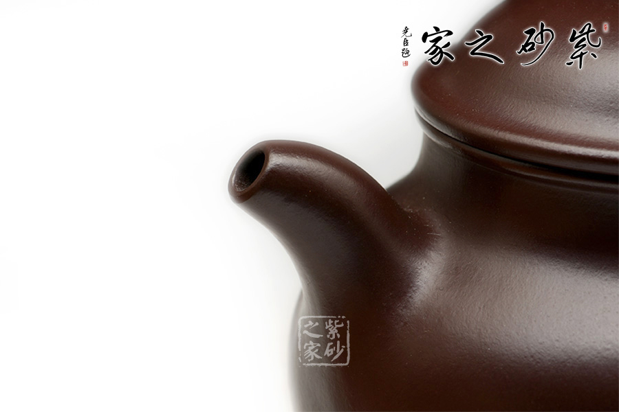 經典器型,線條流暢潤澤,略顯頎長的壺身十分秀雅,很是耐看。一彎流自然胥出,與壺把及壺鈕遙相呼應,協(xié)調不亂。壺蓋微鼓,子母線嚴絲密縫,圓珠鈕飽滿挺立。整款器型匠心獨運,心思巧妙,此乃潘壺中的又一經典之作,藏用皆宜!