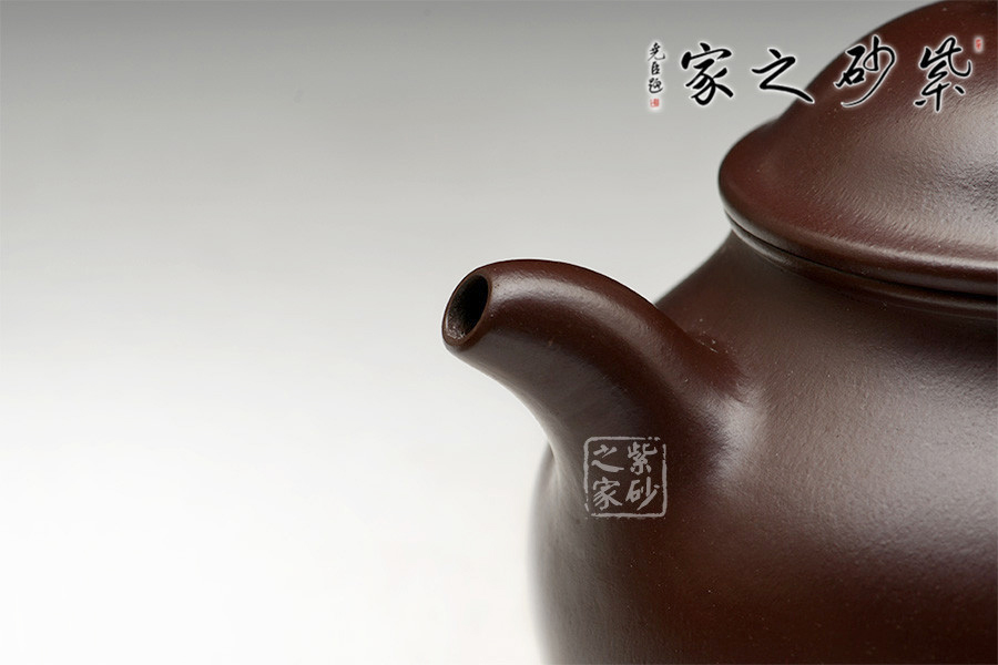 經(jīng)典器型,線條流暢潤澤,壺身十分秀雅略短,很是耐看。一彎流自然胥出,與壺把及壺鈕遙相呼應(yīng),協(xié)調(diào)不亂。壺蓋微鼓,子母線嚴(yán)絲密縫,圓珠鈕飽滿挺立。整款器型匠心獨(dú)運(yùn),心思巧妙,此乃潘壺中的又一經(jīng)典之作,藏用皆宜!