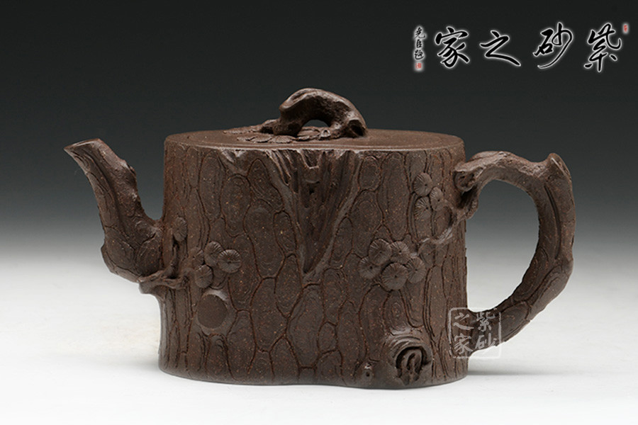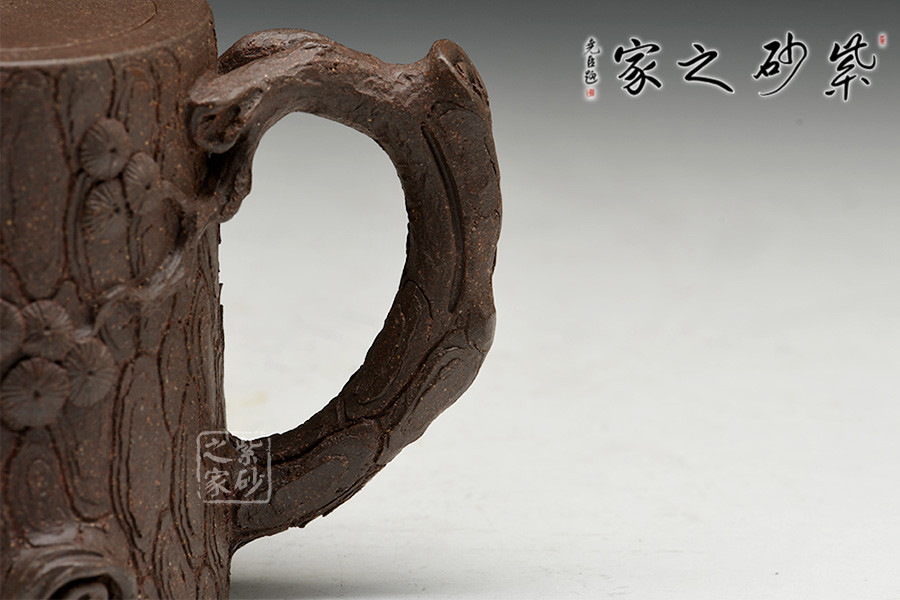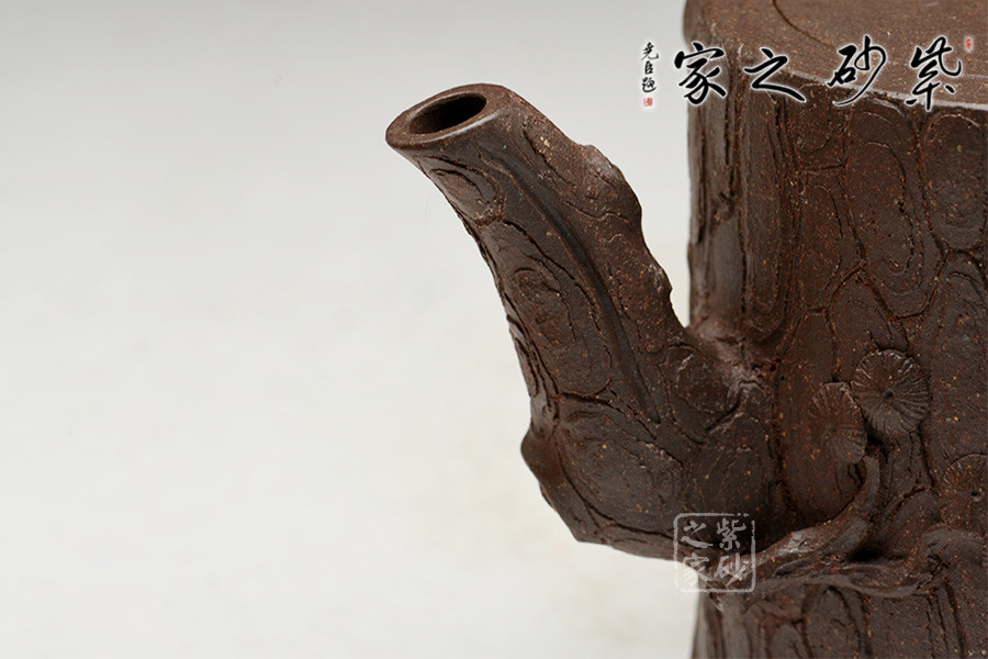 年輕實力派藝師孫長書代表作品,通過泥料創(chuàng)作出色澤柔和、質(zhì)感強烈的松題材作品,造型以松段一截做壺身,結(jié)構(gòu)極嚴謹,壺嘴、壺把做得穩(wěn)妥古拙、枝干蒼勁。用堆繪、貼塑的手法做出松針枝表示它的常青,寓意人生命的長壽長青。在一些地方留出粗糙的原胎,讓人品味松樹生長中所經(jīng)歷的滄桑歷程,寓意生命的苦難和堅強。 整體氣勢古樸,樹皮斑駁蒼勁,松枝虬盤其上,針葉寫形寫意,整器形意俱佳。