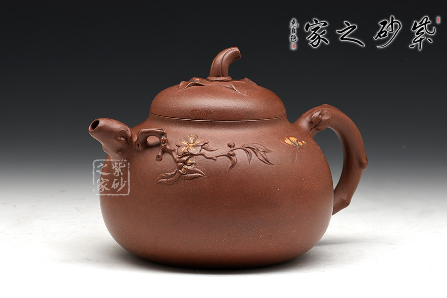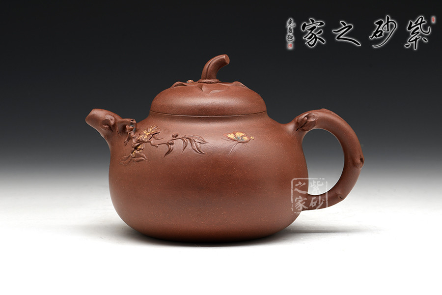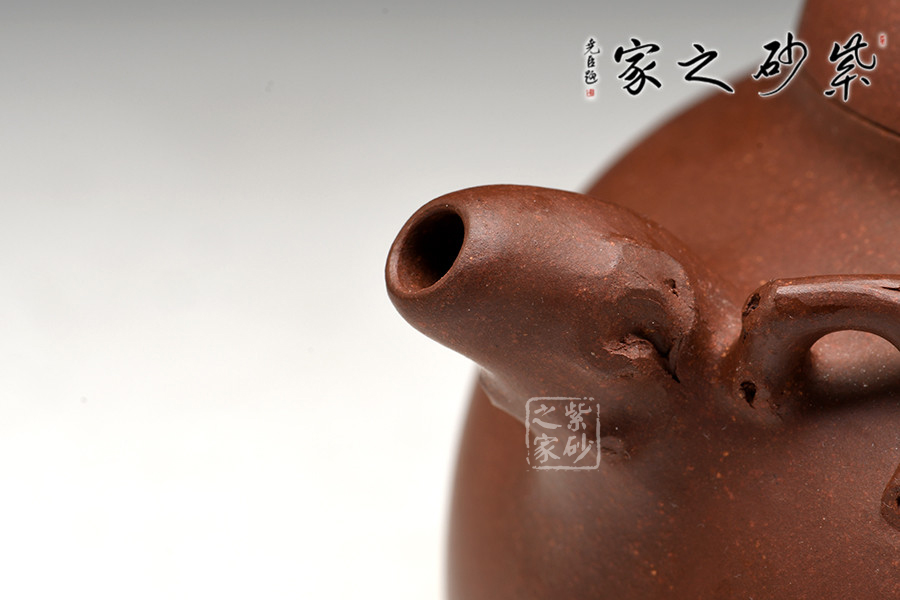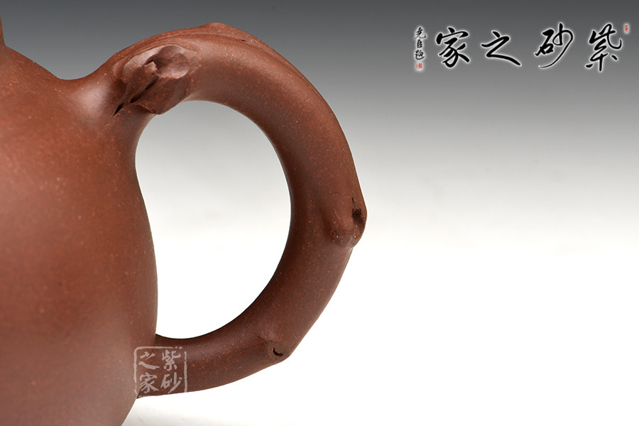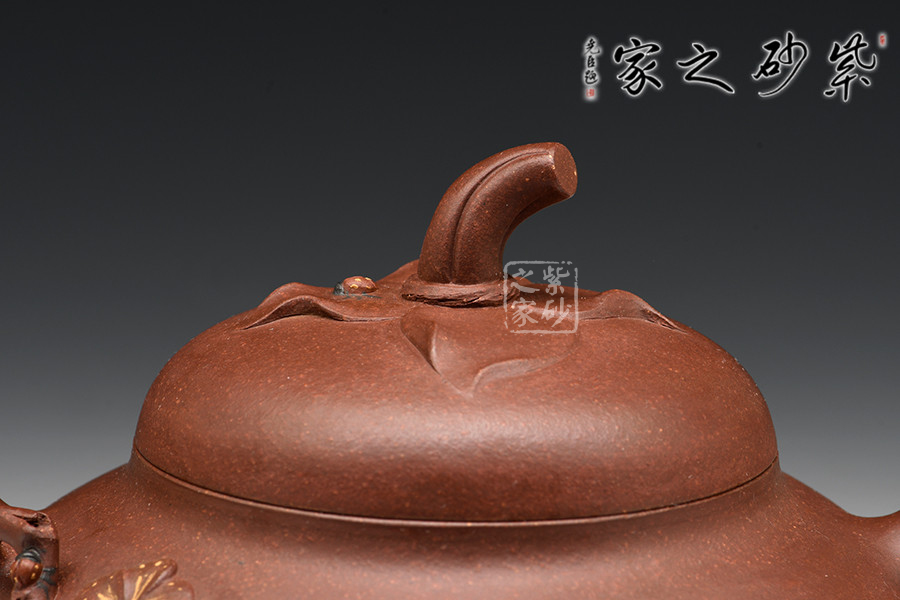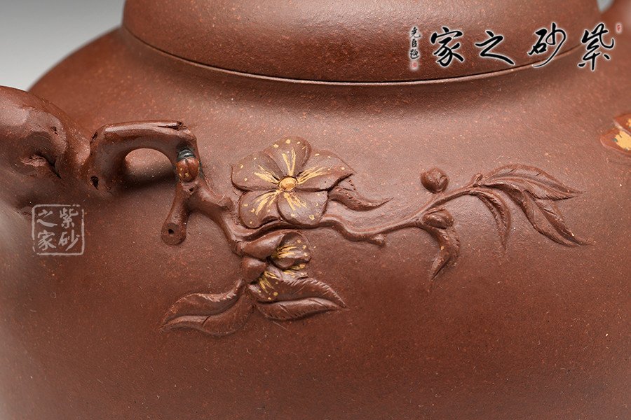 采用色澤紅潤(rùn)的純凈紫砂泥全手工制作,壺身與壺蓋合拼為一 碩大的瓜果形,短嘴和環(huán)把以桃枝為形,從壺嘴的“枝干”上引伸出縮放的花朵和花蕾,嫩葉塑與壺面,用段泥捏塑一翩翩起舞的蝴蝶為點(diǎn)綴,桃枝隨風(fēng)飄搖,蝴蝶穿梭忙碌,整器造型勾勒出了一幅春光明媚、桃花盛開、清香四溢的“春風(fēng)”圖。這件作品運(yùn)用了傳統(tǒng)光器素技法。以及紫砂貼塑、絞泥等技法,設(shè)計(jì)意圖是讓品茗者共享江南之美景。