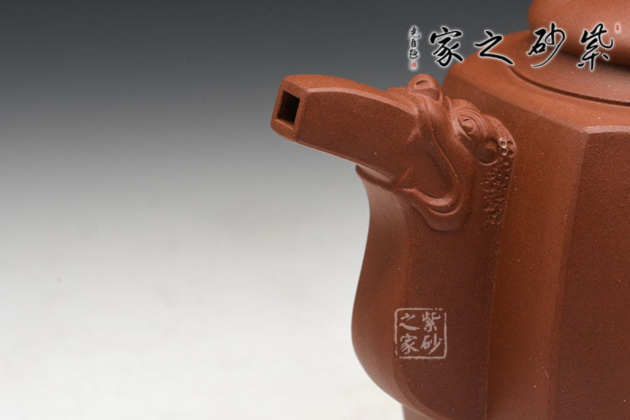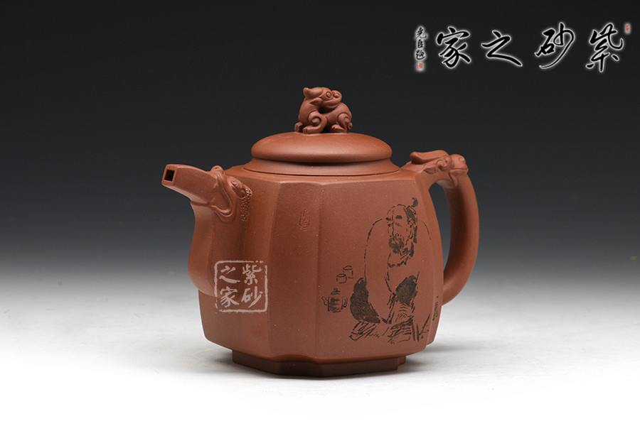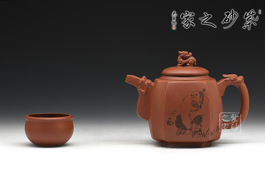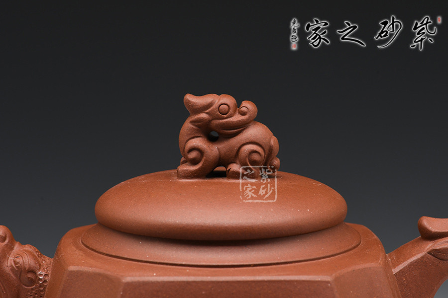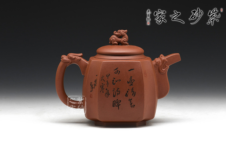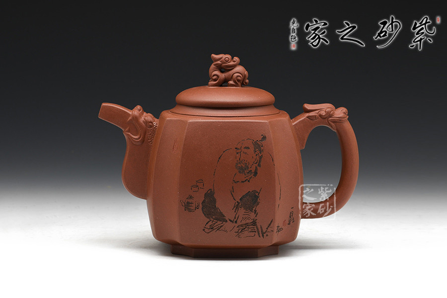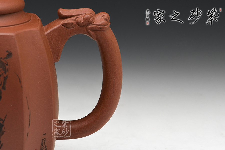 徐赟,工藝美術(shù)師,精于陶刻,師從陶刻大家錢一清和中國工藝美術(shù)大師曹亞麟,又得中國工藝美術(shù)大師鮑志強(qiáng)指點(diǎn),陶刻制壺雙精。 該壺名為高瞻遠(yuǎn)矚,可謂是寄寓深刻。壺身高挺,壺嘴和壺把處皆有一貔貅頭,呈吐納一切的姿勢,氣勢磅礴。壺鈕為貔貅做回望狀,形象逼真,高高在上的姿勢,恢宏大氣,和此壺所表達(dá)主題完美呼應(yīng)。加之,壺身正反面深厚的刻繪,意蘊(yùn)深遠(yuǎn)。該壺,實(shí)用和把玩皆宜,值得推薦。