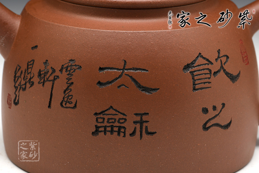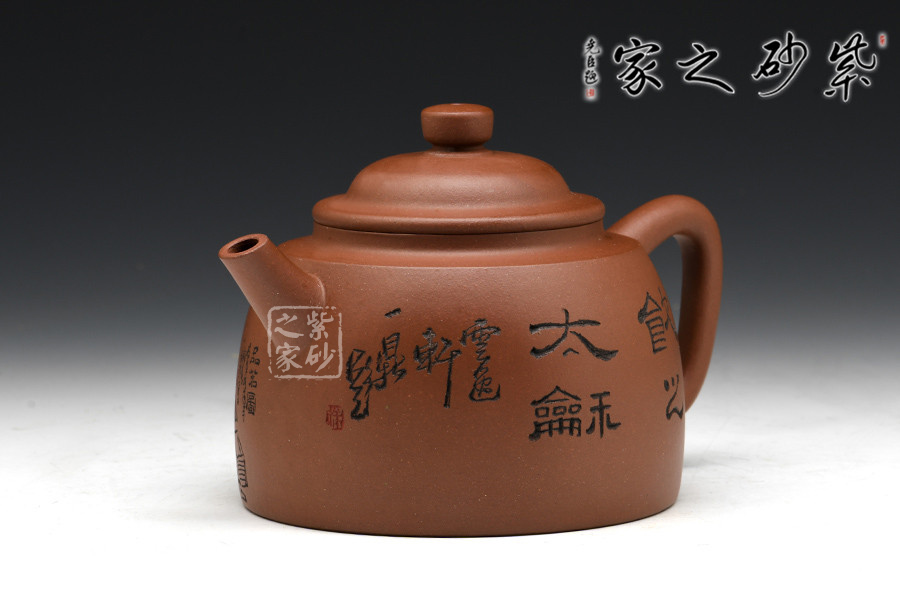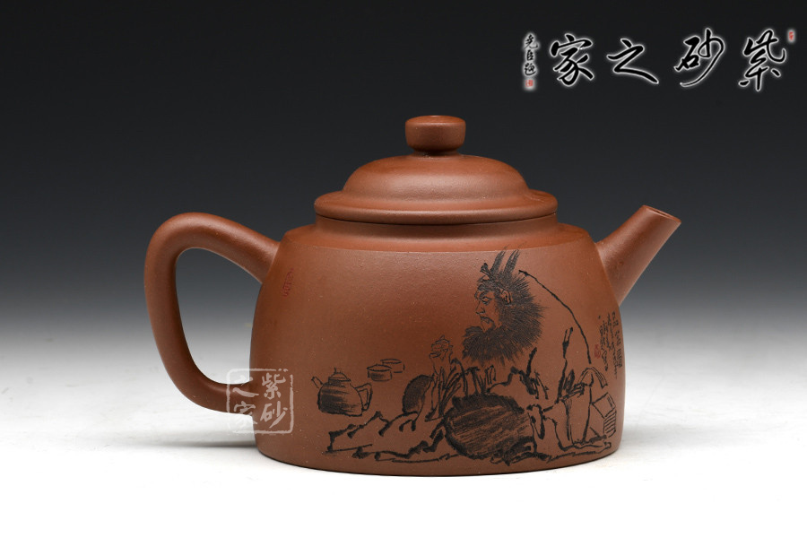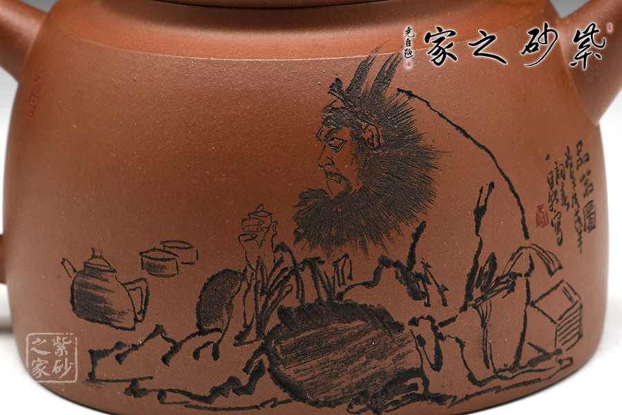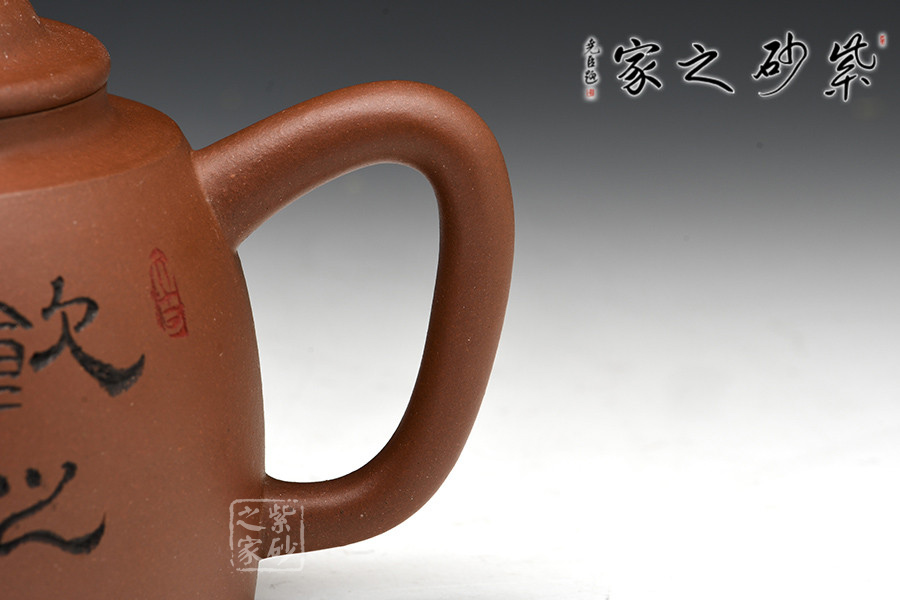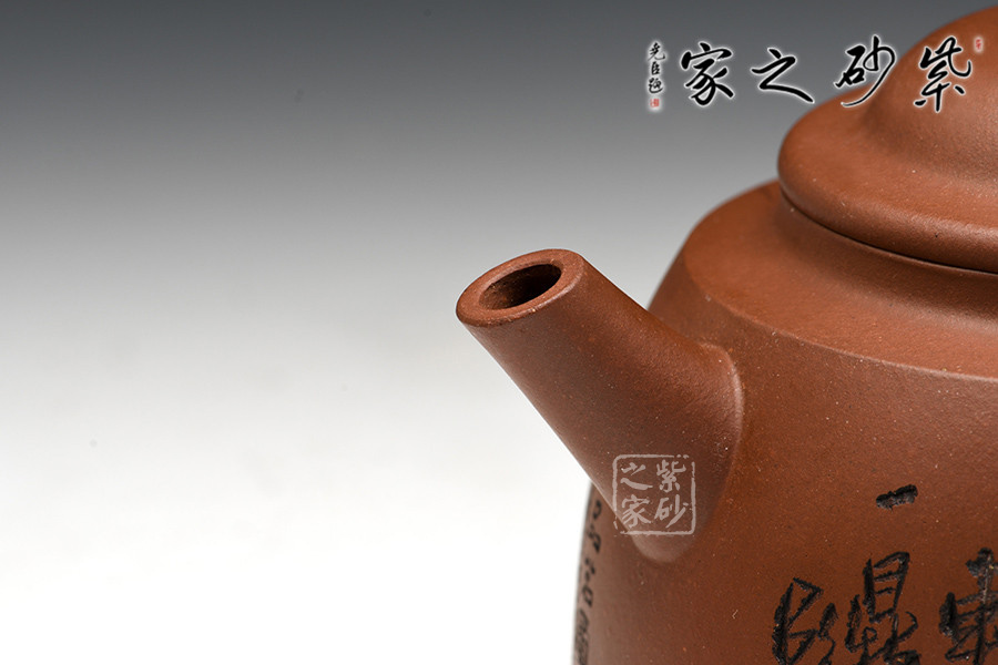徐赟,工藝美術(shù)師,精于陶刻,師從陶刻大家錢一清和中國工藝美術(shù)大師曹亞麟,又得中國工藝美術(shù)大師鮑志強(qiáng)指點(diǎn),陶刻制壺雙精。此壺精選原礦底槽青精制而成,質(zhì)地特純,泥質(zhì)細(xì)膩、成色穩(wěn)重。整器渾圓飽滿,福氣滿乾坤,有如一股內(nèi)氣通透;壺鈕設(shè)計(jì),簡單大方,與整體器形協(xié)調(diào)統(tǒng)一。壺蓋與壺口嚴(yán)絲密合,做工精細(xì)。壺嘴壺把挺翹,壺嘴出水有序,水勢洶涌;壺把捏握舒適。