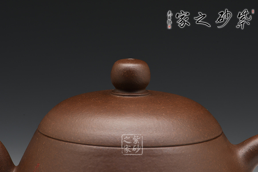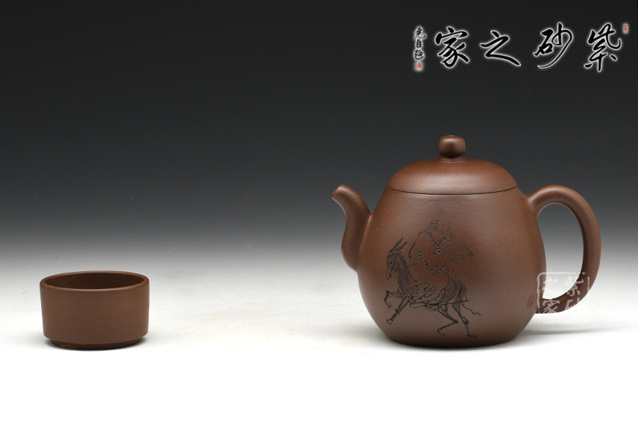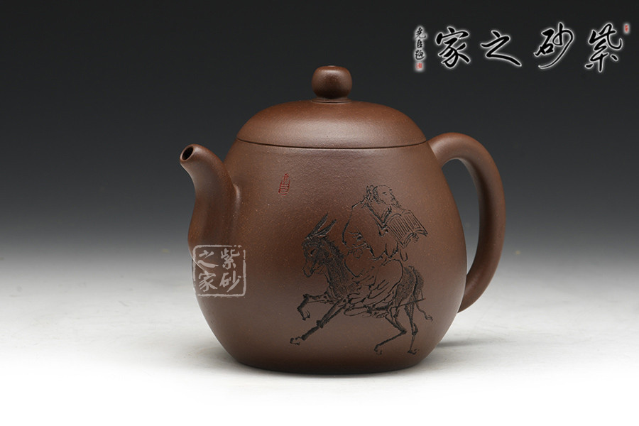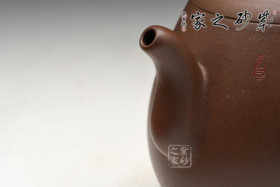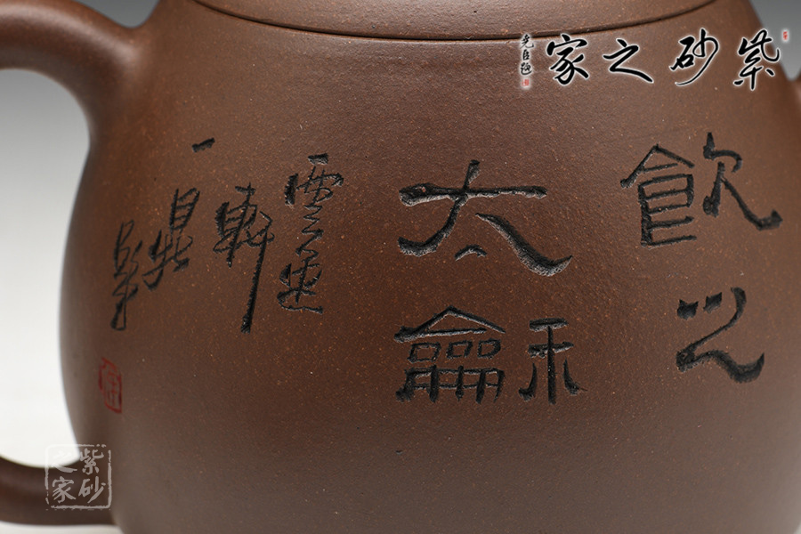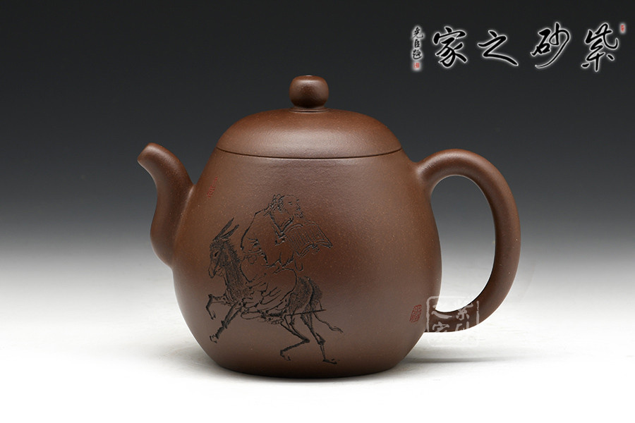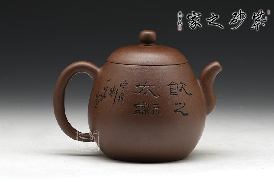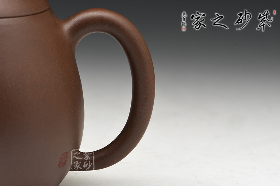 徐赟,工藝美術(shù)師,精于陶刻,師從陶刻大家錢一清和中國工藝美術(shù)大師曹亞麟,又得中國工藝美術(shù)大師鮑志強(qiáng)指點(diǎn),陶刻制壺雙精。龍蛋壺乃是經(jīng)典壺型之一,通體狀似蛋形,身筒較高,泡茶特別留香。截蓋與壺身不可分割,似為一體,圓珠狀壺鈕為整壺增添一份俏皮。彎嘴粗細(xì)勻稱,耳把大而垂,手握舒適,兩者比例諧和,可見在同一高度,不會突兀。全壺顯出拙味的親切感。
